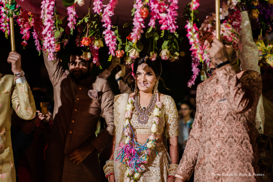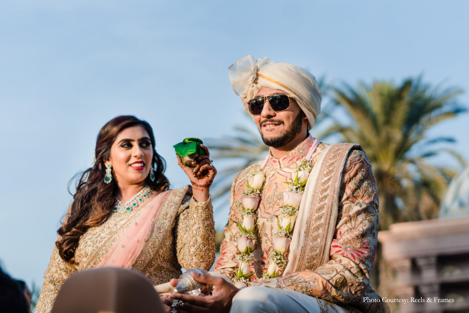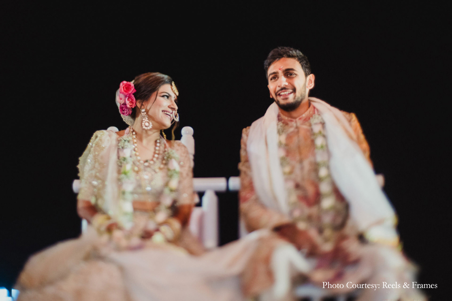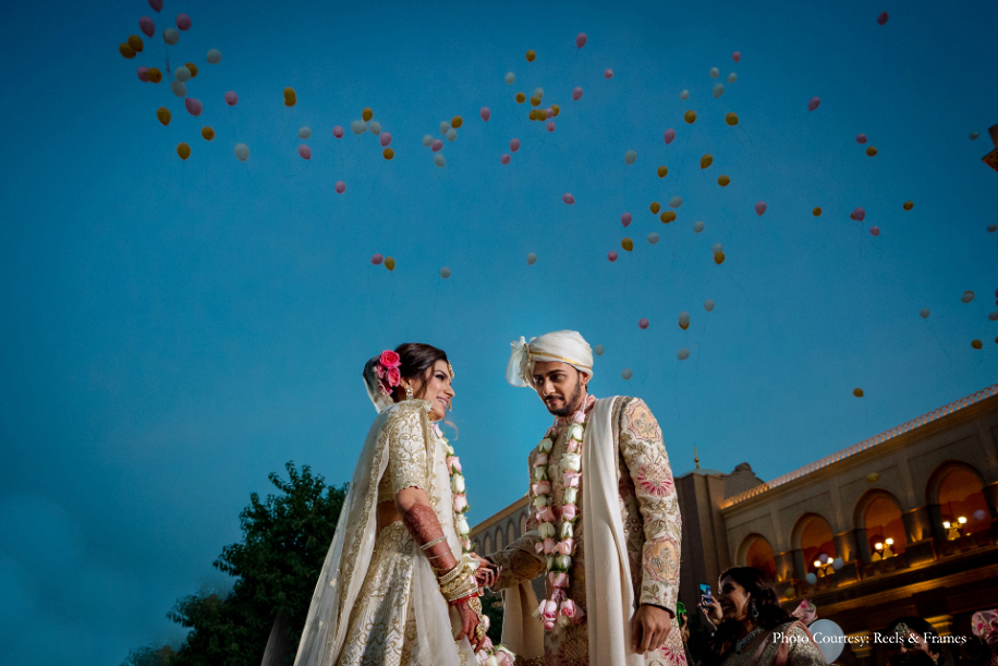 “Surrounded by magnificent decor that comprised of pastel hues and beautiful flowers, Ruchit and I exchanged our wedding vows. The baarat started at the palace and we got married at the beach, which enabled us to have the best of the regal and waterfront backdrops! I made an entrance under an elegant ‘phoolon ki chaadar’ (floral canopy), while Ruchit entered in a Rolls Royce. The joyful members of the family welcomed us at the venue by releasing pastel colored balloons in the air. A creation from Koesch by Kresha Bajaj was my dream wedding outfit and Ruchit was a Sabyasachi groom.”