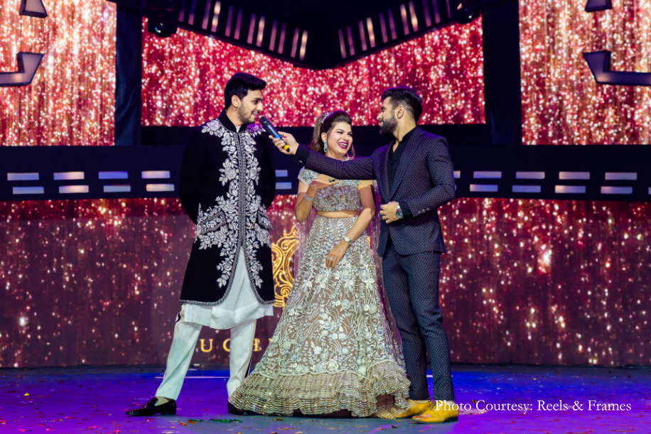 “Grandeur and luxurious, our sangeet was called ‘The Royal Reveal.’ Tunes by hit singers such as The Meet Bros and Manasi Scott elevated the glamour quotient. Power-packed performances by our loved ones made this event an affair to remember. The decor by Kkings Events along with Dome Occasions spelled sheer opulence! Ruchit and I both wore Manish Malhotra outfits for this function.”