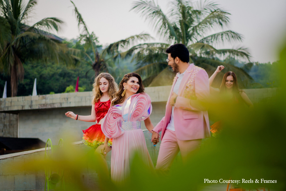 “We called our lip-smacking brunch by the pool ‘Tropical Paradise’ and brought in decorative elements like pineapples and flamingos among other things. Upbeat music and a ‘rodeo’ ride further added a dash of fun to the proceedings! An outfit by Papa Don’t Preach by Shubhika was my choice for the evening, and Ruchit went with a Govinda Mehta creation.”