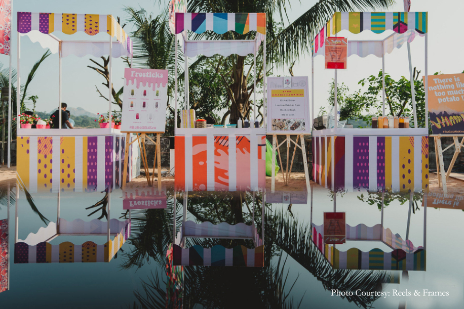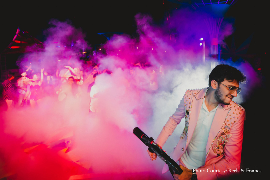 “We started the wedding celebrations with a cocktail party at Aamby Valley, which went by the theme ‘Dementia Land.’ This event saw two fun parties taking place. ‘Carousal’ was the day event and it was high on the quirky vibe with elements like a trippy butterfly stage, bubble artists, sheesha and fancy food stalls. ‘Classic Insanity,’ on the other hand, was the night-time bash which welcomed the guests into a winter wonderland with a 360-degree mapping. A classic black and white theme was fused with technology at this party. The highlight of the event was the 9 litre champagne pop by Ruchit.”