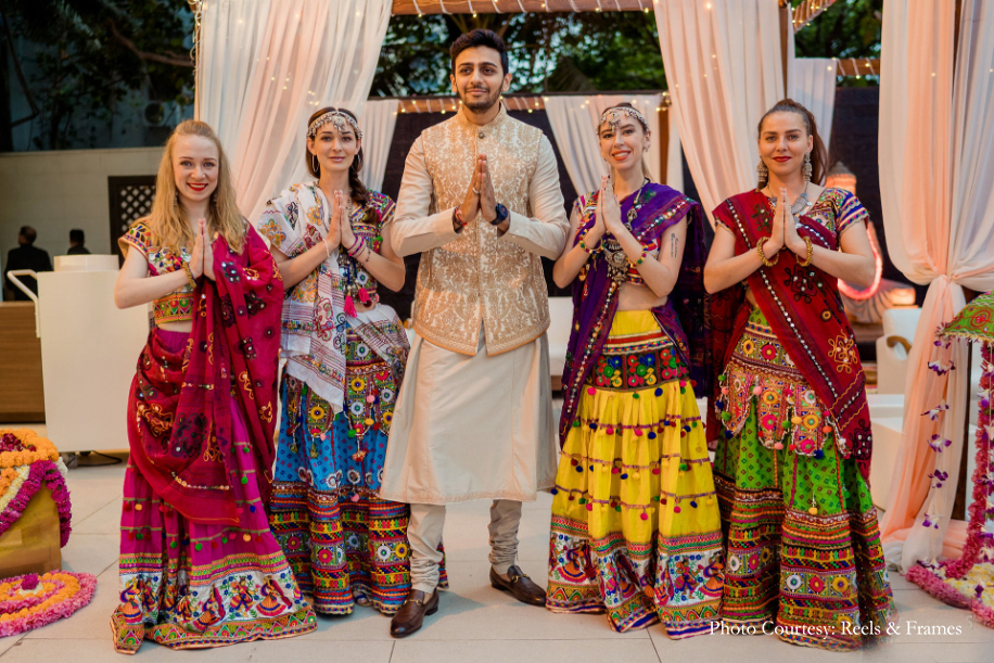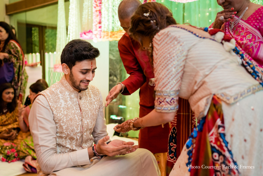 “Our ‘Kankorti Lakhvanu’ function was where our family bestowed us with blessings. The event ended with a garba night, where everyone put on their Gujarati dance mojo and filled the night with energy. The decor of the event comprised of fresh blooms, traditional elements, and flowing drapes. An ensemble from Kolkata-based Sequins & Pearls, was my outfit of choice while Ruchit went with a Tarun Tahiliani creation.”