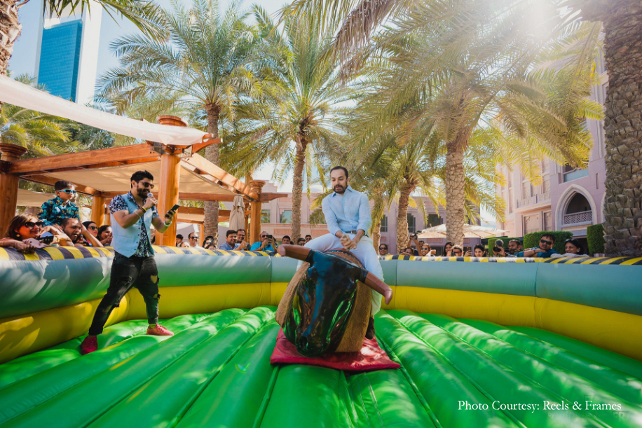 “With this function, we took our wedding extravaganza to the luxurious Emirates Palace in Abu Dhabi. The ‘Bohemian Souk Mehndi’ was a modern take on the traditional mehndi ceremony and the guests were entertained with lively music, scrumptious food, refreshing drinks, and special Turkish Ice-cream. The highlight of the event was the photobooth where guests could click pictures with falcons! I opted for a Sabyasachi outfit and Ruchit wore an Abu Jani Sandeep Khosla ensemble for this function.”
