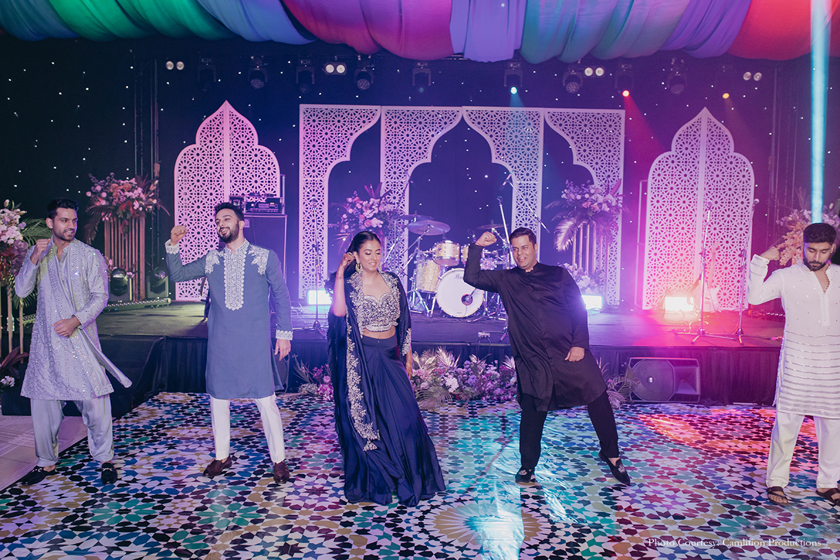 Glitz, mystique and music came together at the Sufi Night where the couple had a gala time with their loved ones in tow. Persian carpets, arches with complex latticework, fairylights and a patterned dance floor made the event a treat for the senses. While the guests rustled up elaborate dance performances for the couple, a live singer had everyone tapping their toes.