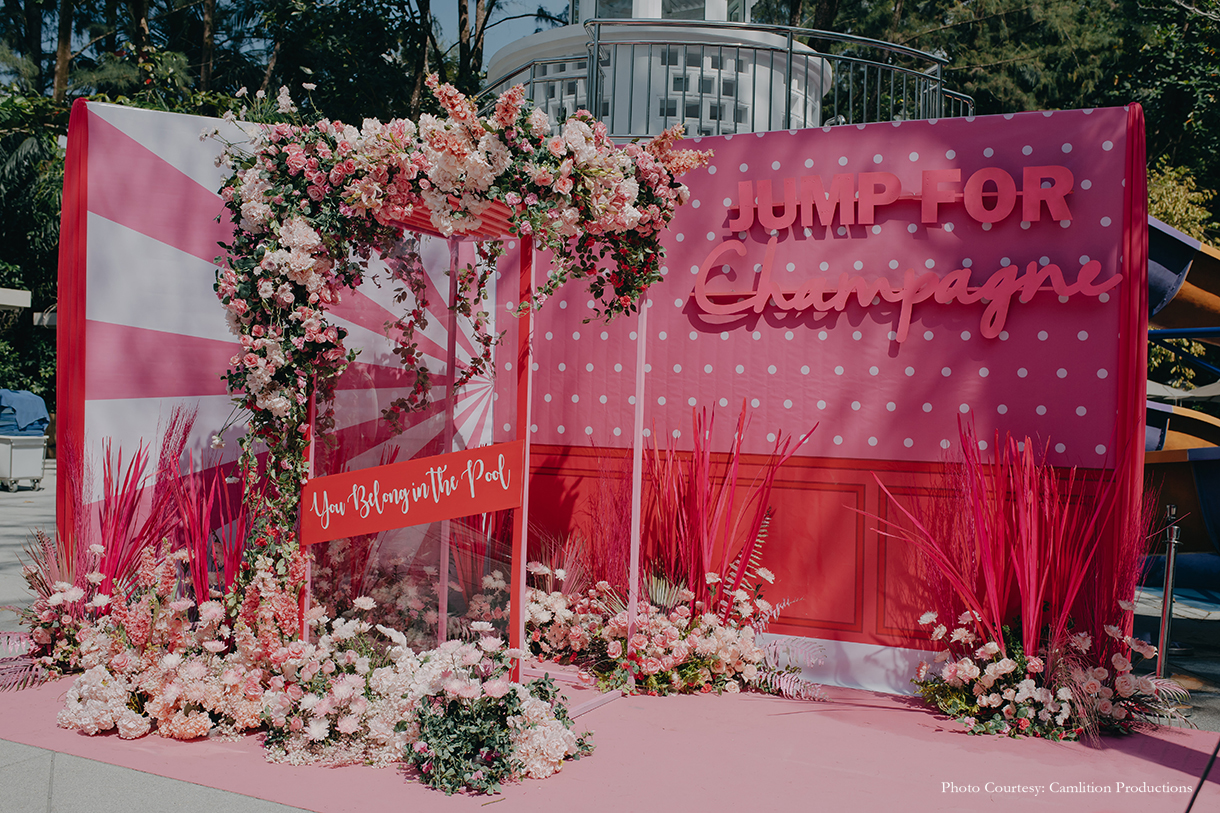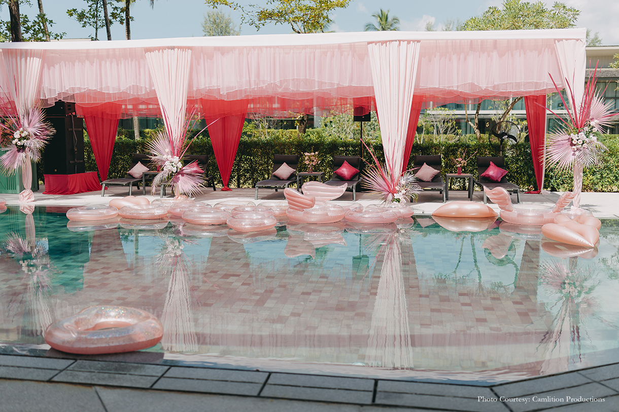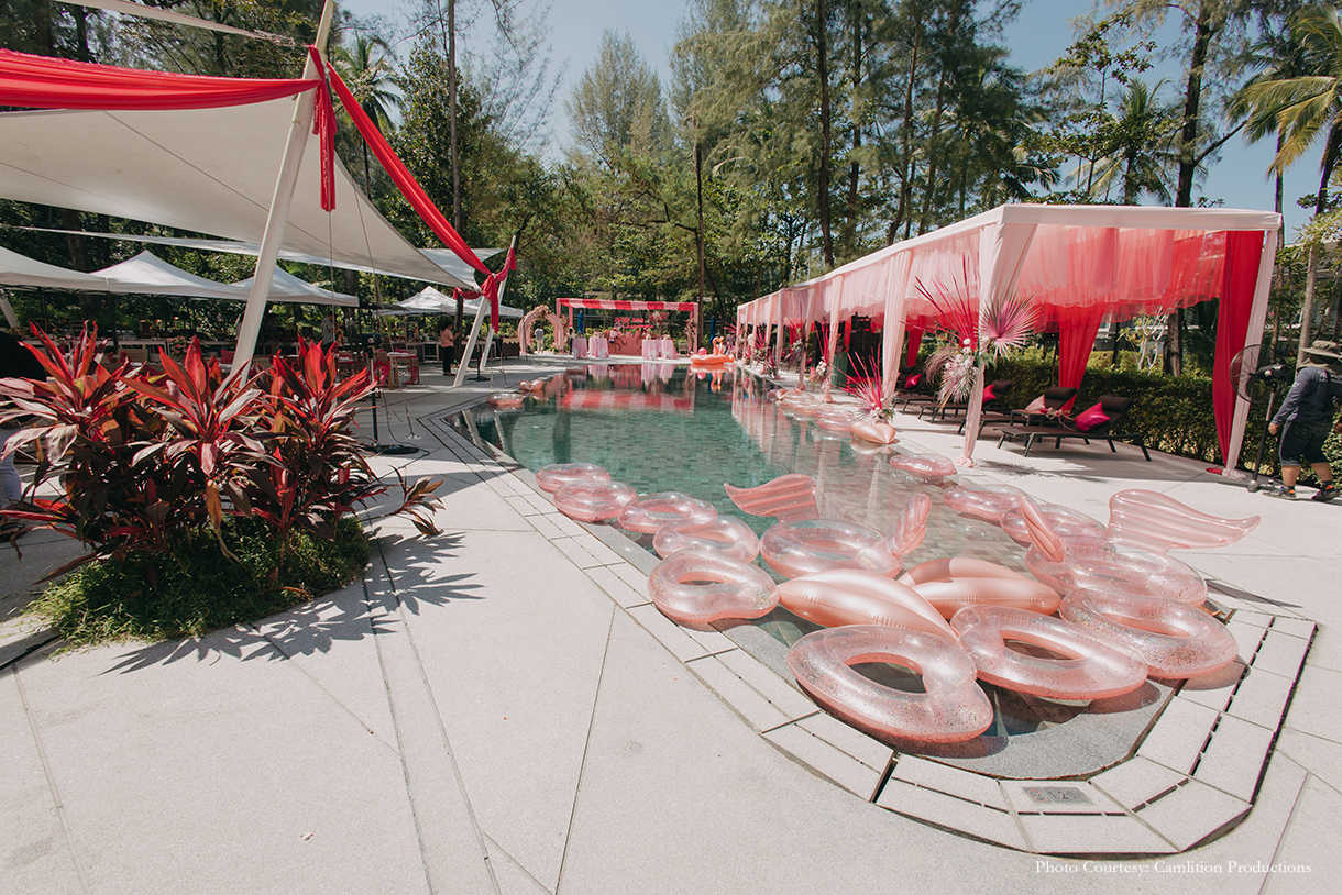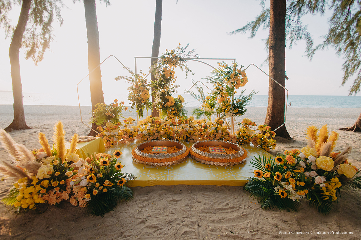 At the beachside haldi, the guests enjoyed the beauty of Thailand’s palm-fringed shores. Kyraa shares, “Our haldi took place on the beach, which ended with us inside the sea at sunset. The sunset on both days – during the haldi and the pheras were beautiful!” Pink flamingo-themed decor, water slides and quirky pool floats kept the guests in high spirits as they cooled by the pool. After their frolics, the couple went on to celebrate their haldi which was adorned with sunflowers, cane furnishings and a quick dip in the gentle waves.