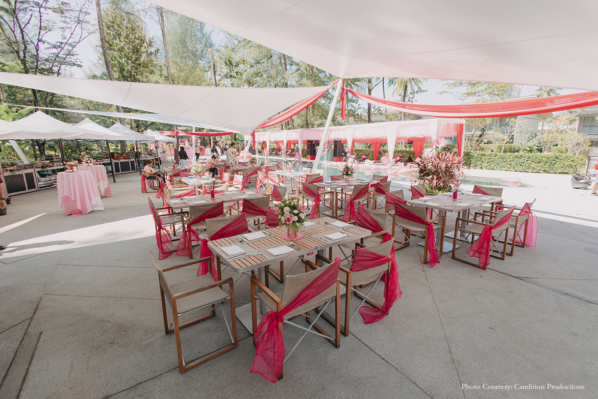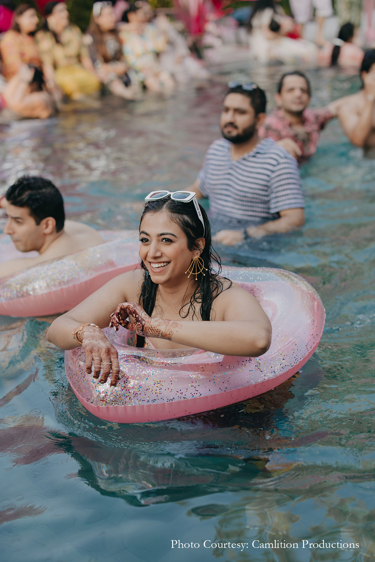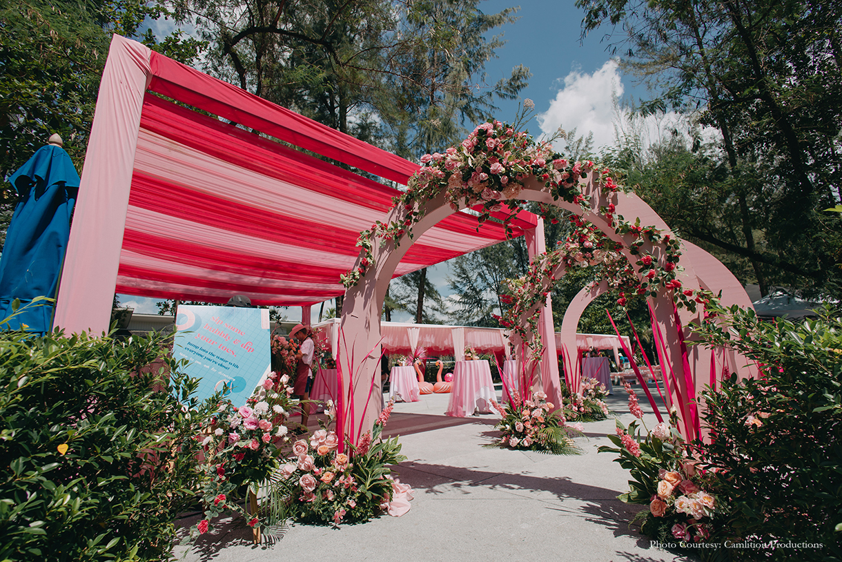 At the beachside haldi, the guests enjoyed the beauty of Thailand’s palm-fringed shores. Kyraa shares, “Our haldi took place on the beach, which ended with us inside the sea at sunset. The sunset on both days – during the haldi and the pheras were beautiful!” Pink flamingo-themed decor, water slides and quirky pool floats kept the guests in high spirits as they cooled by the pool. After their frolics, the couple went on to celebrate their haldi which was adorned with sunflowers, cane furnishings and a quick dip in the gentle waves.