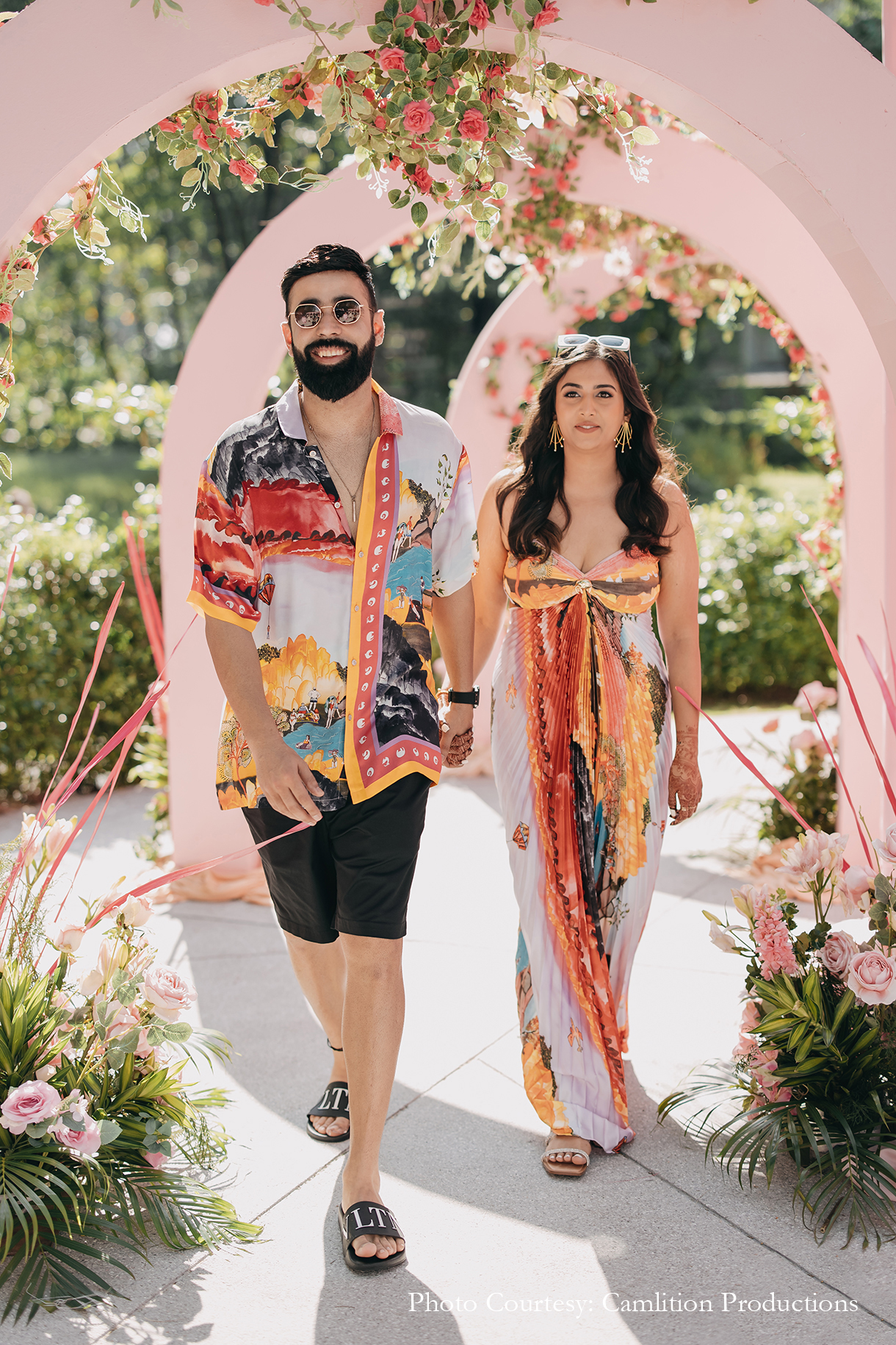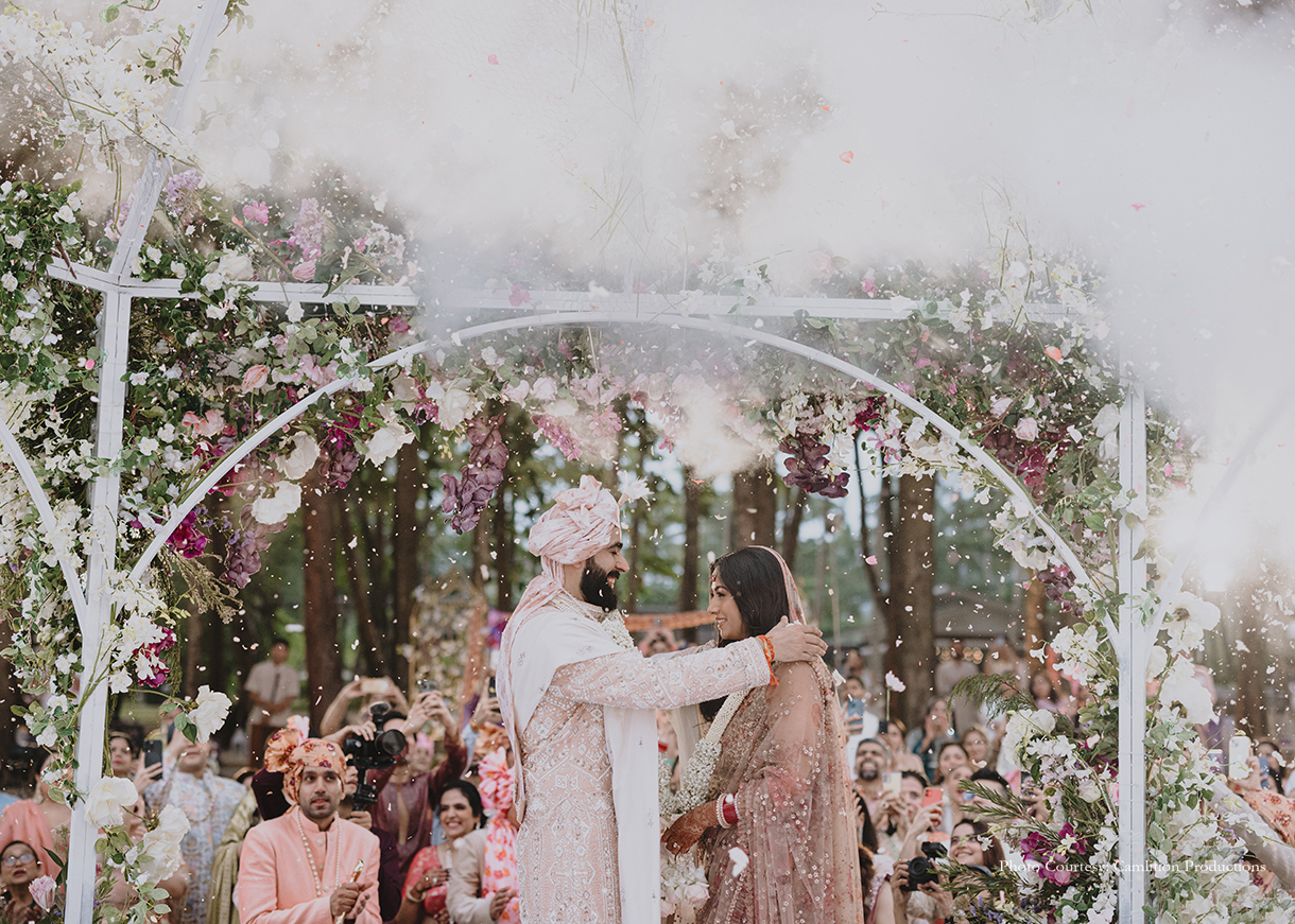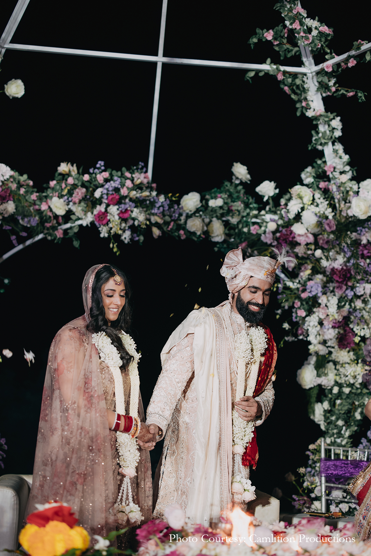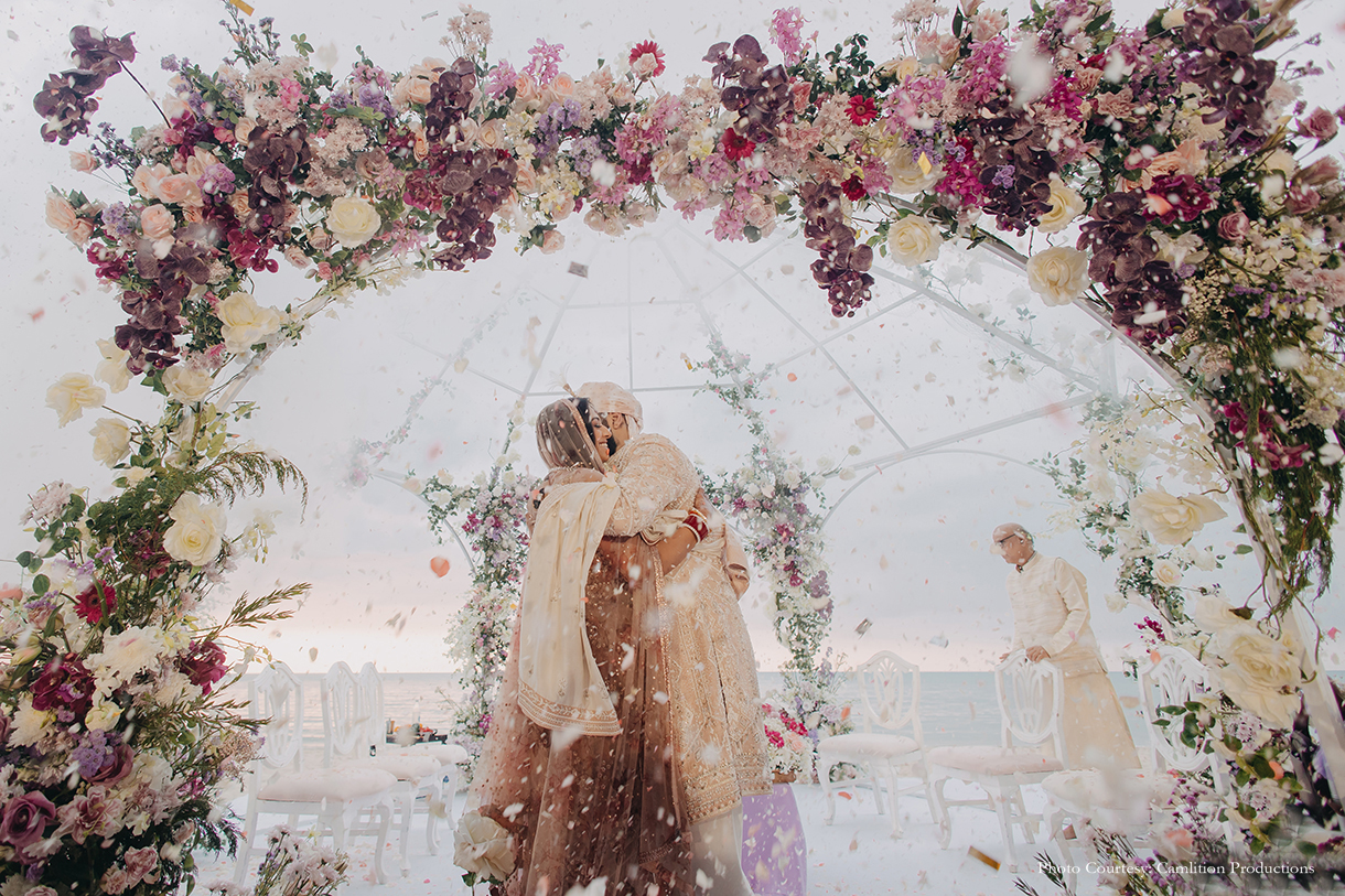 The wedding celebration kicked off with a boisterous baraat with the groom arriving on an ATV with his close friends in tow. The beachside wedding featured a beautiful wedding mandap with a white latticework roof and pillars decorated with lush foliage. For the guests, gilded chairs were placed in front of the mandap with a white aisle leading up to the mandap. After the sundowner pheras, the couple posed on the beach where they enjoyed a dramatic sunset.