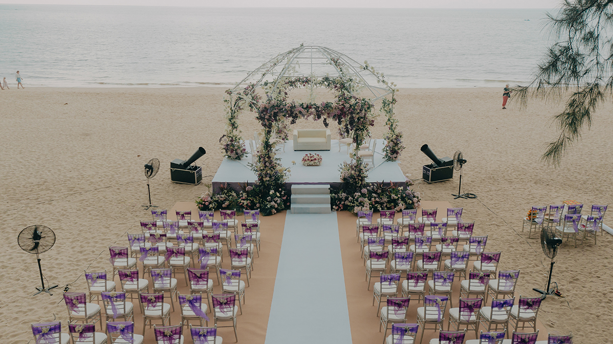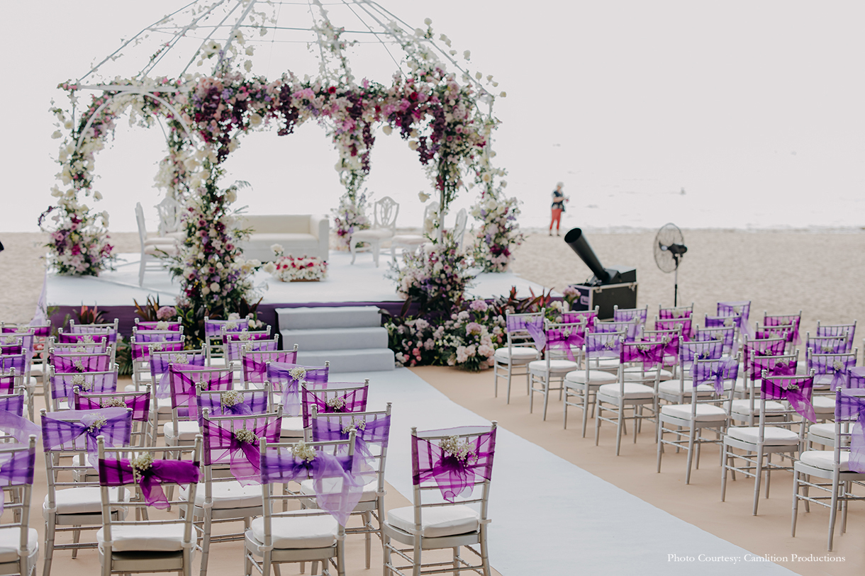 Backed by foamy tides, this couple’s white and purple beachside mandap was the epitome of minimalistic glam.