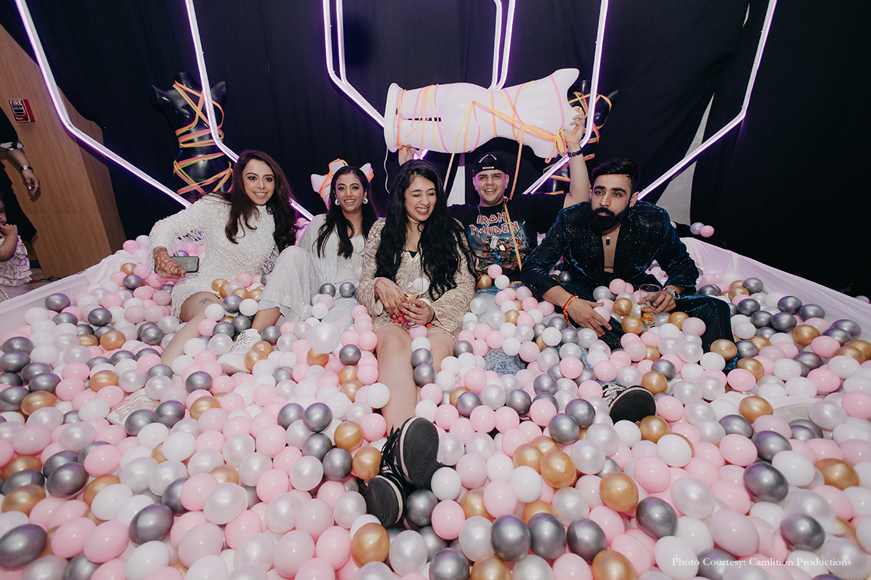 Kyraa shares, “We share an obsession with great cocktails so we had fun things like ‘mango sticky rice’ and more that everyone loved. As a photo-op at our afterparty, we had a big ball pit which everyone eventually jumped into! It was the perfect end to the wedding.”
