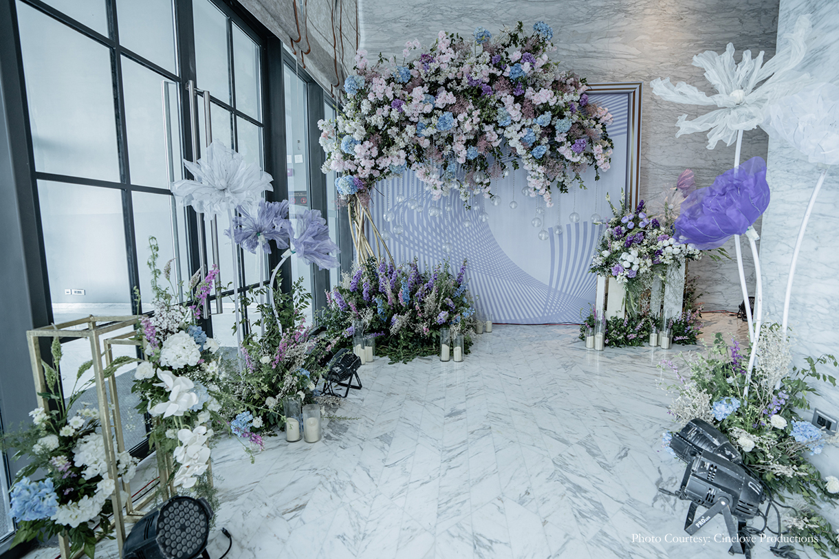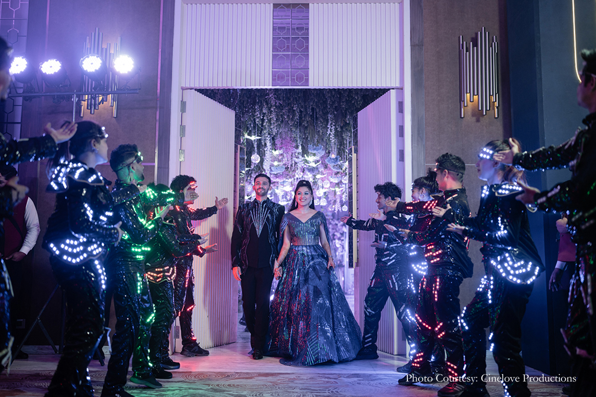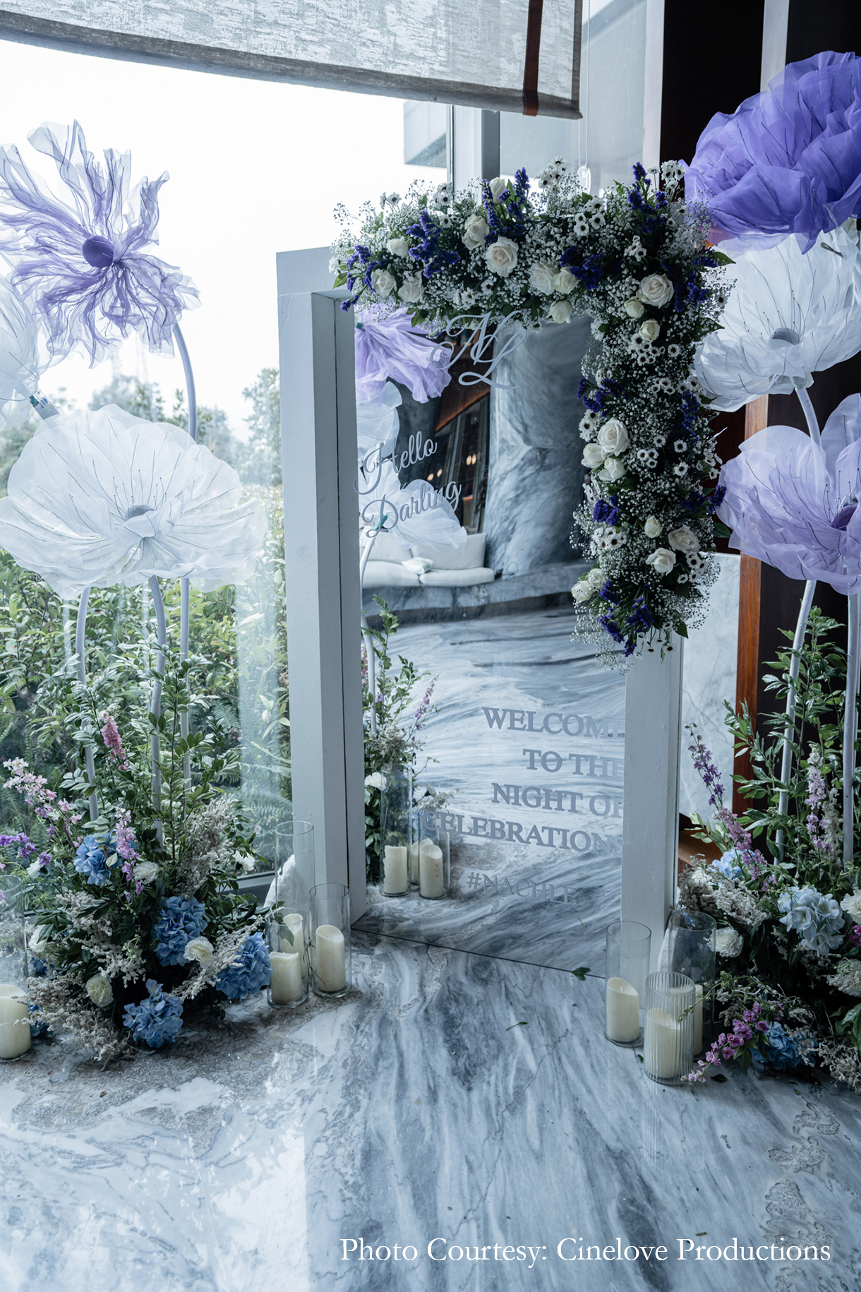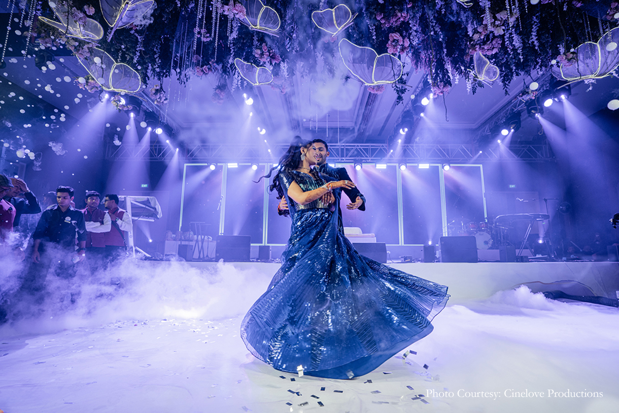 The wedding festivities began on a glamorous note with the couple hosting a silver and lavender-hued cocktail party indoors. Oversized blooms, larger-than-life LED butterflies suspended from the ceiling, a live singer and a vast stage paved the way for cherished memories. The couple made a sleek, futuristic entry with dancers wearing LED suits flanking them.
