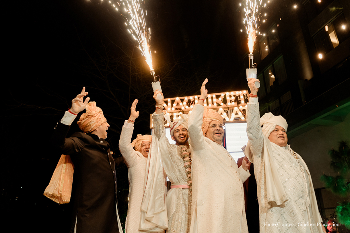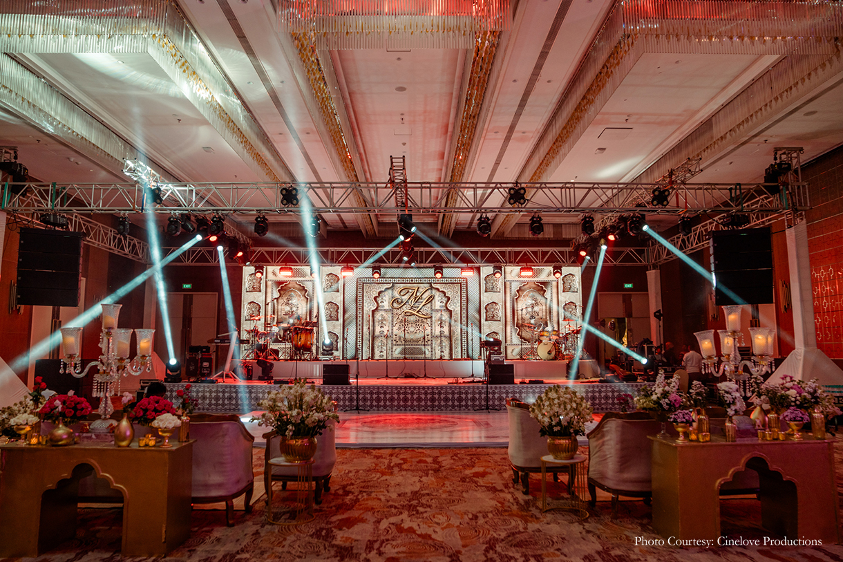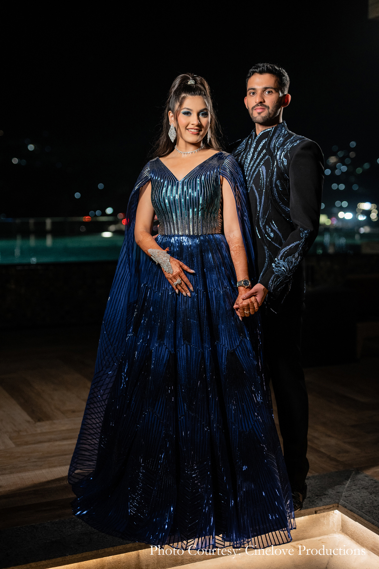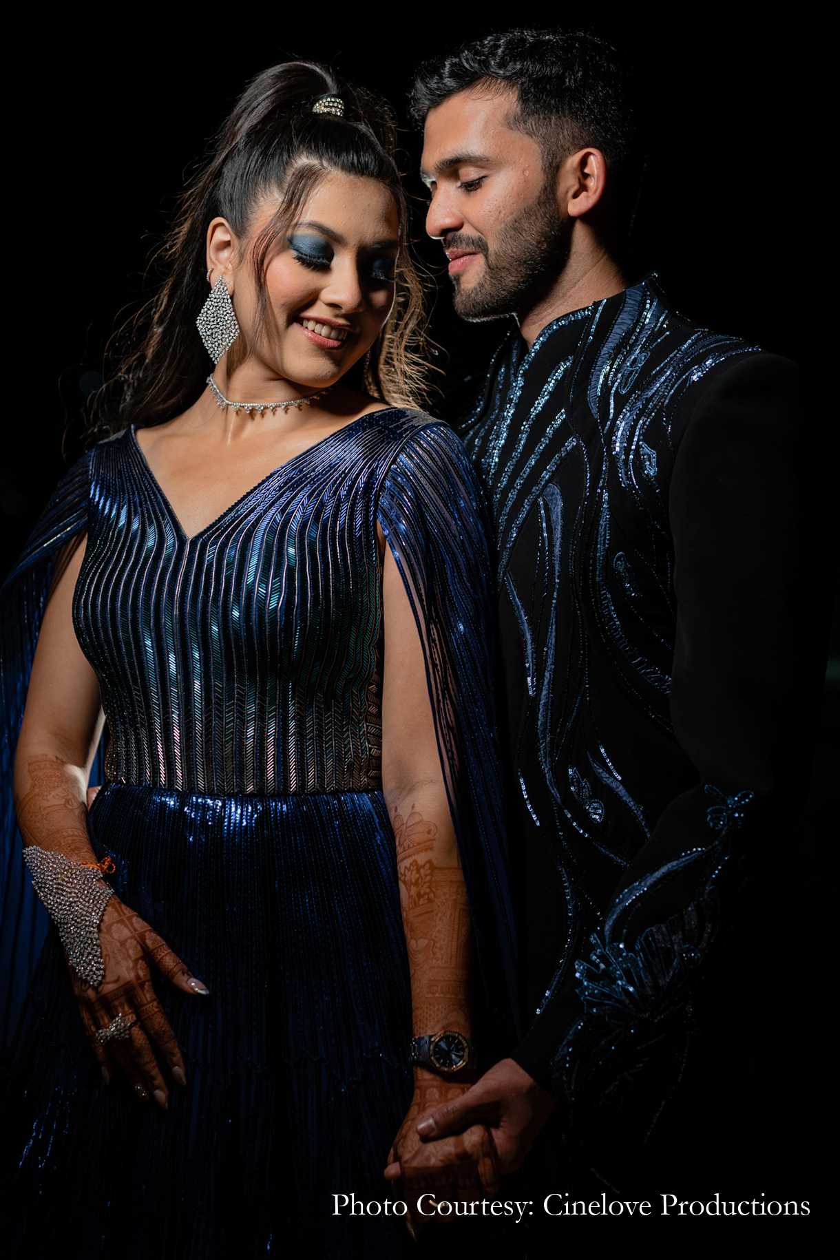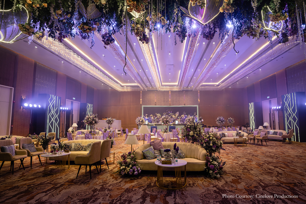 The wedding festivities began on a glamorous note with the couple hosting a silver and lavender-hued cocktail party indoors. Oversized blooms, larger-than-life LED butterflies suspended from the ceiling, a live singer and a vast stage paved the way for cherished memories. The couple made a sleek, futuristic entry with dancers wearing LED suits flanking them.