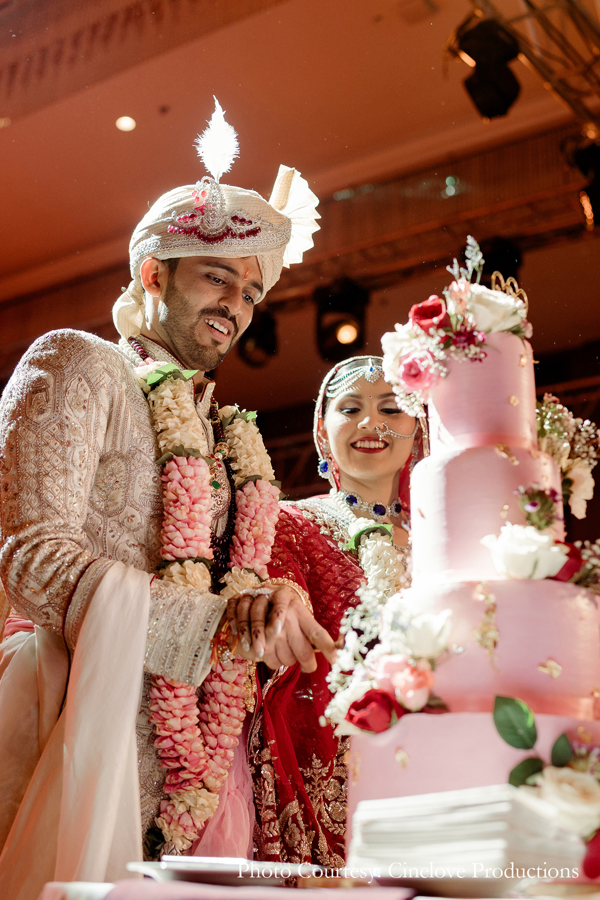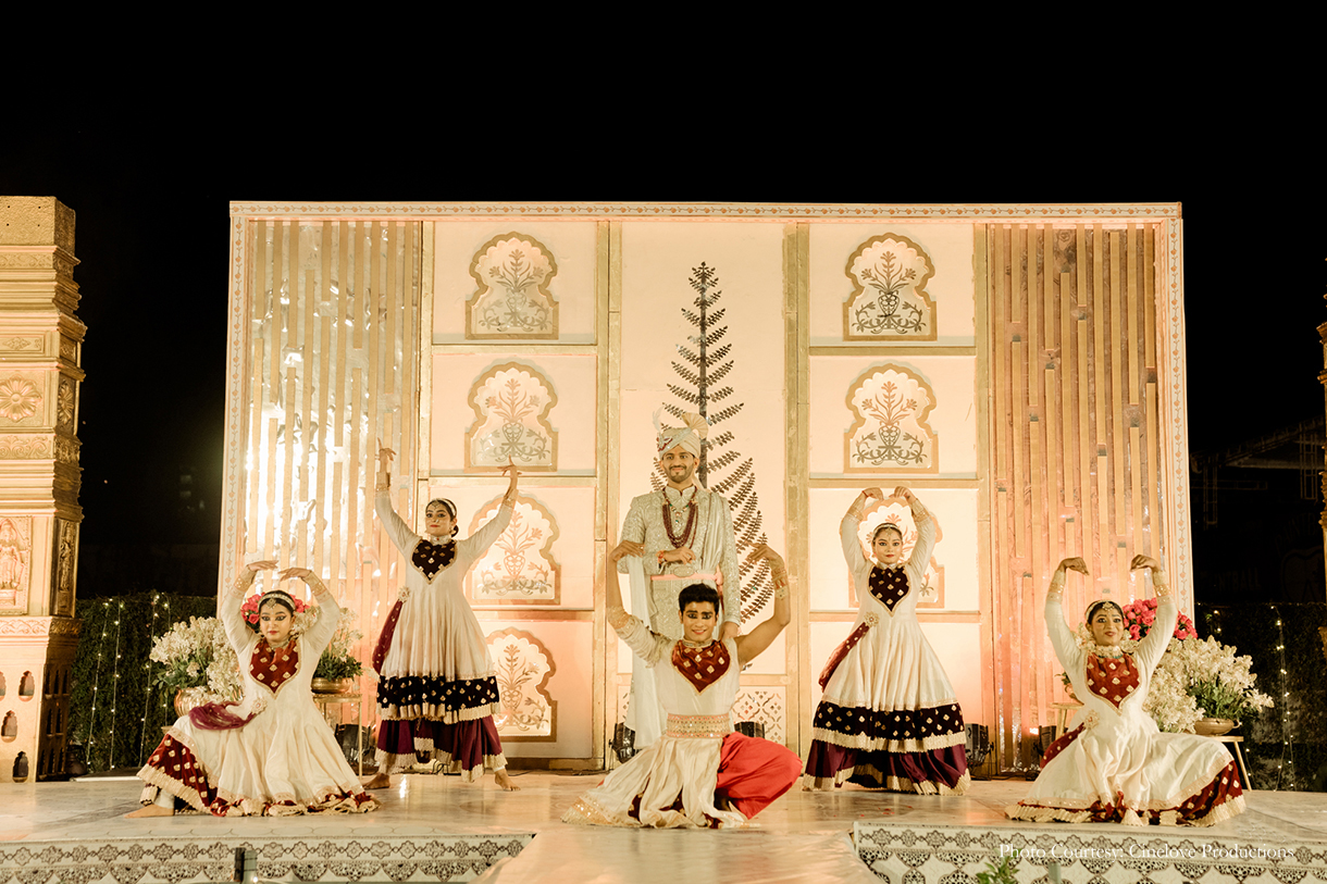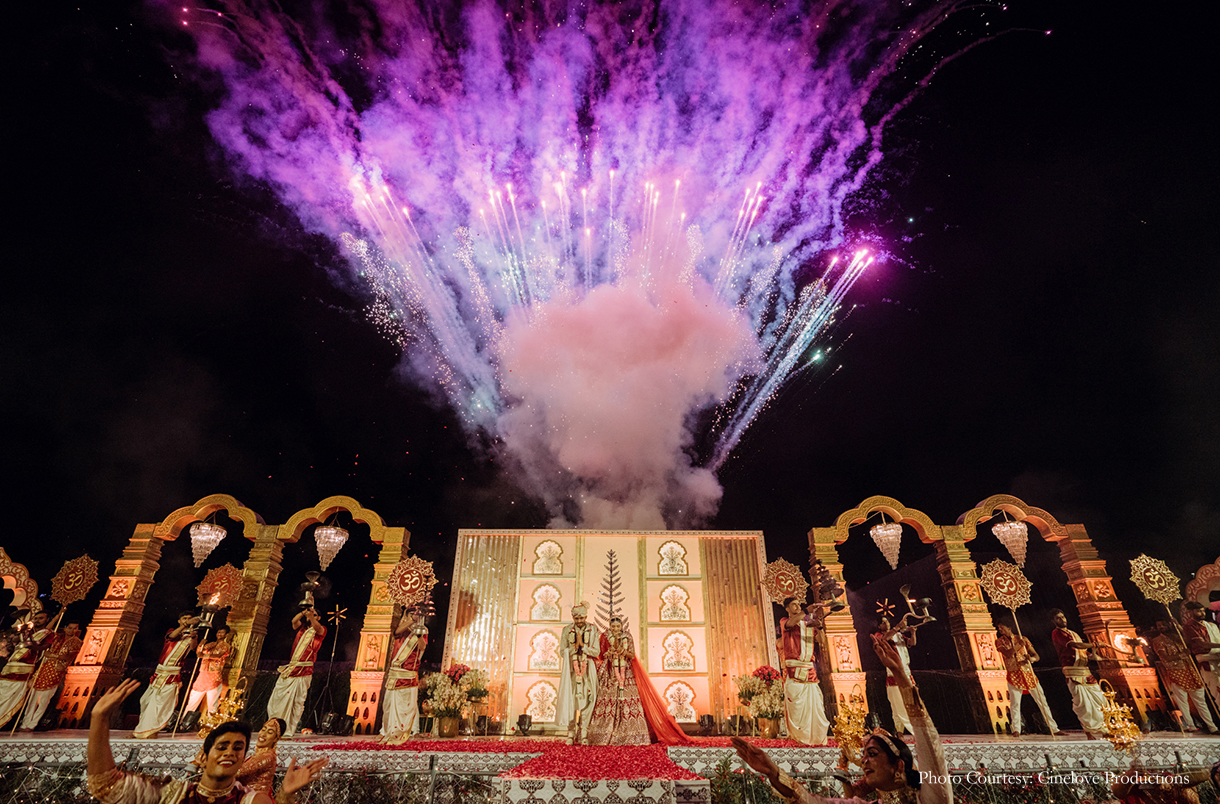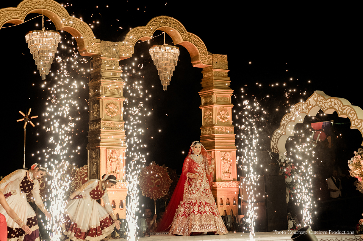 The wedding festivities began on a glamorous note with the couple hosting a silver and lavender-hued cocktail party indoors. Oversized blooms, larger-than-life LED butterflies suspended from the ceiling, a live singer and a vast stage paved the way for cherished memories. The couple made a sleek, futuristic entry with dancers wearing LED suits flanking them.