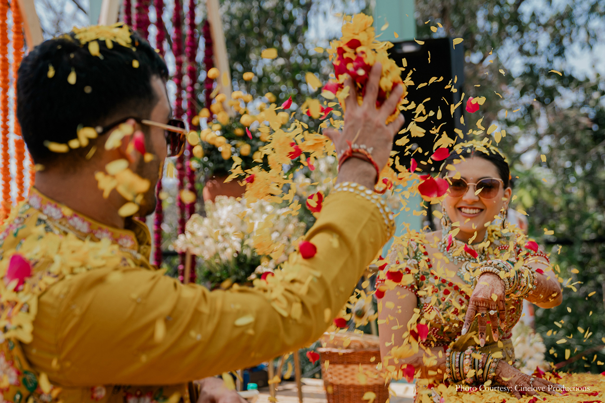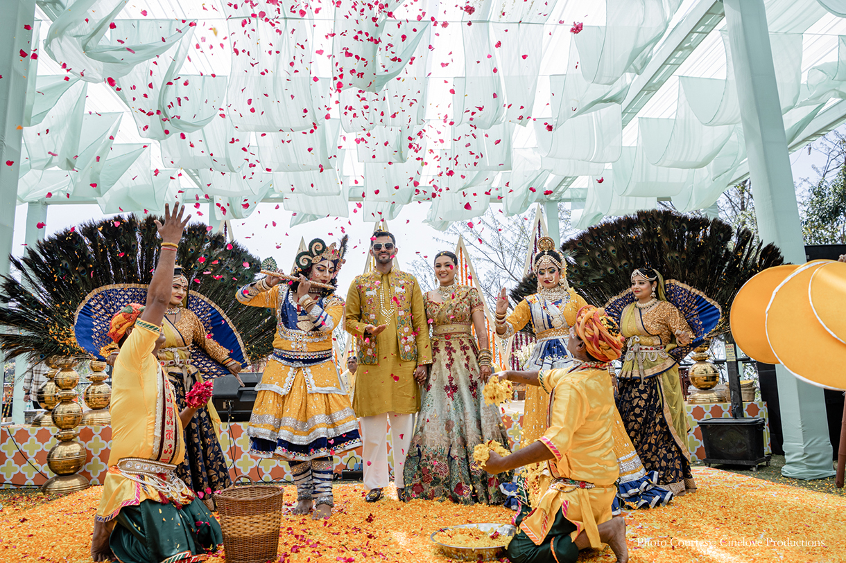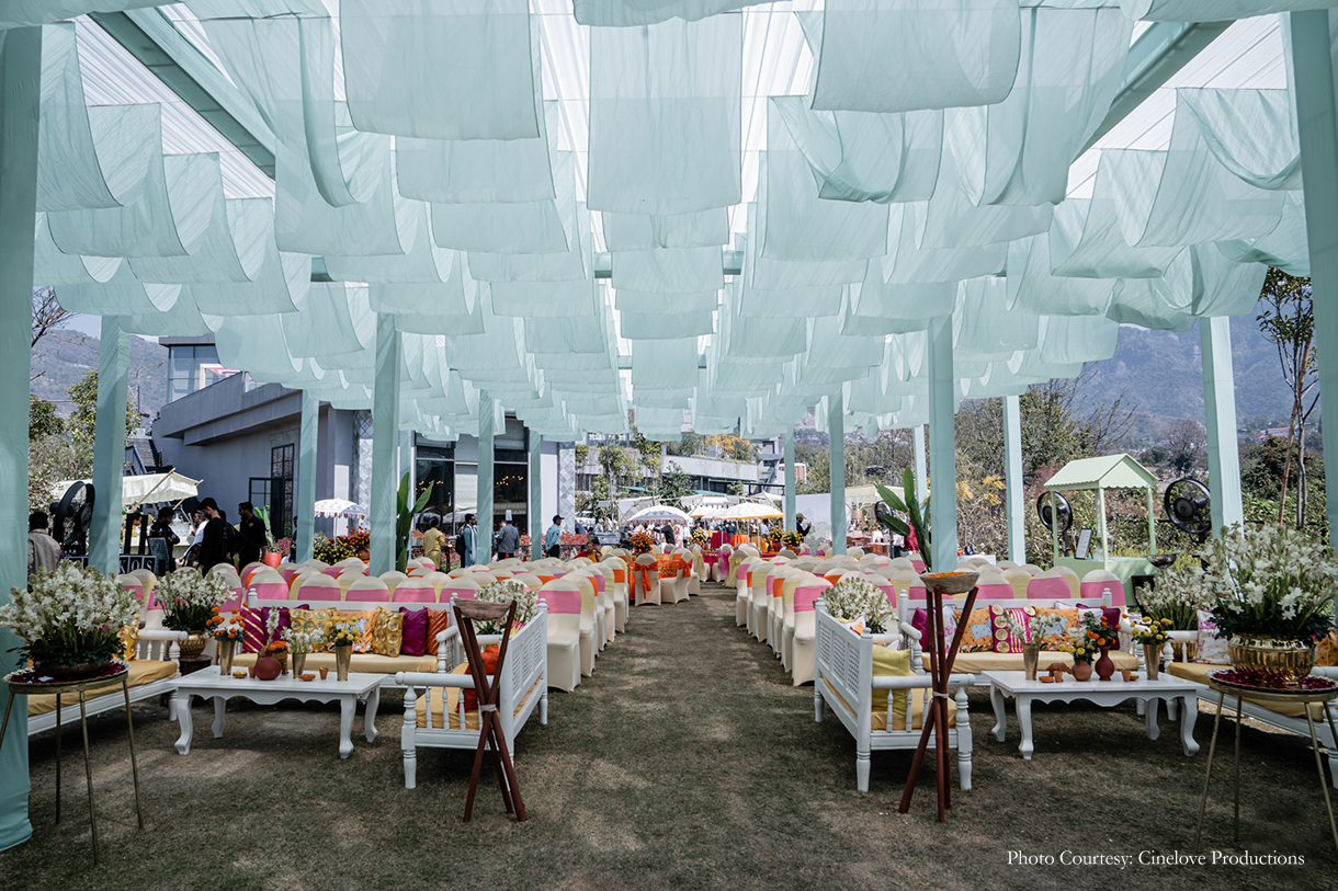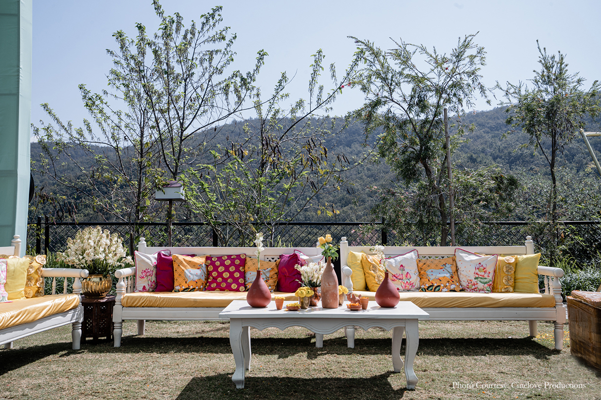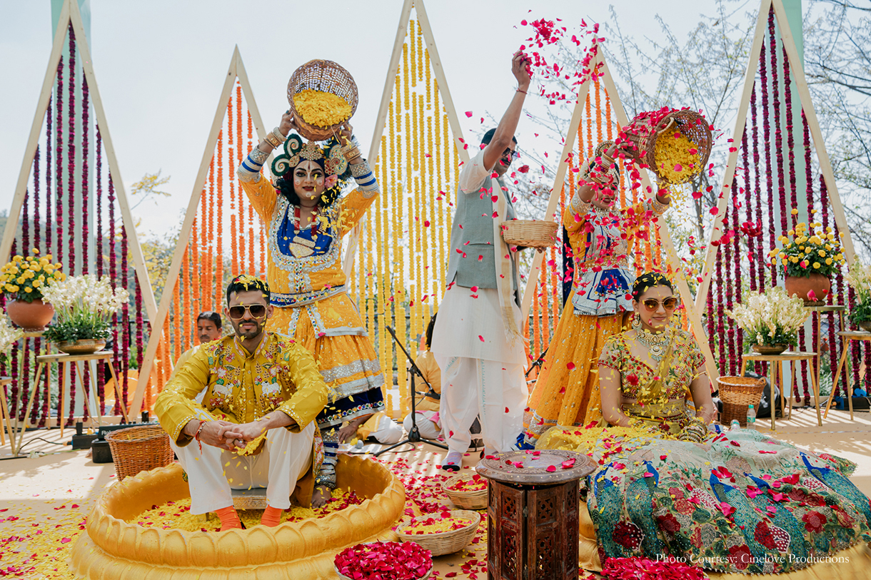 Surrounded by lush hills and greenery, the haldi was hosted on an outdoor lawn with plenty of sunshine. Hues of white, yellow, orange and pink worked in perfect harmony with the green lawn creating a serene atmosphere. Showcasing their love for traditions, the couple made an entry with ‘Radha-Krishna’ dancers who also showered flower petals on their way. Later, the traditional dancers performed onstage followed by spontaneous performances by the family members.