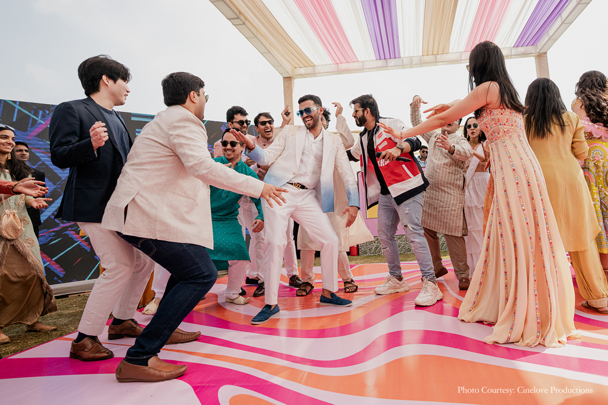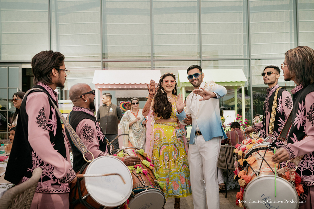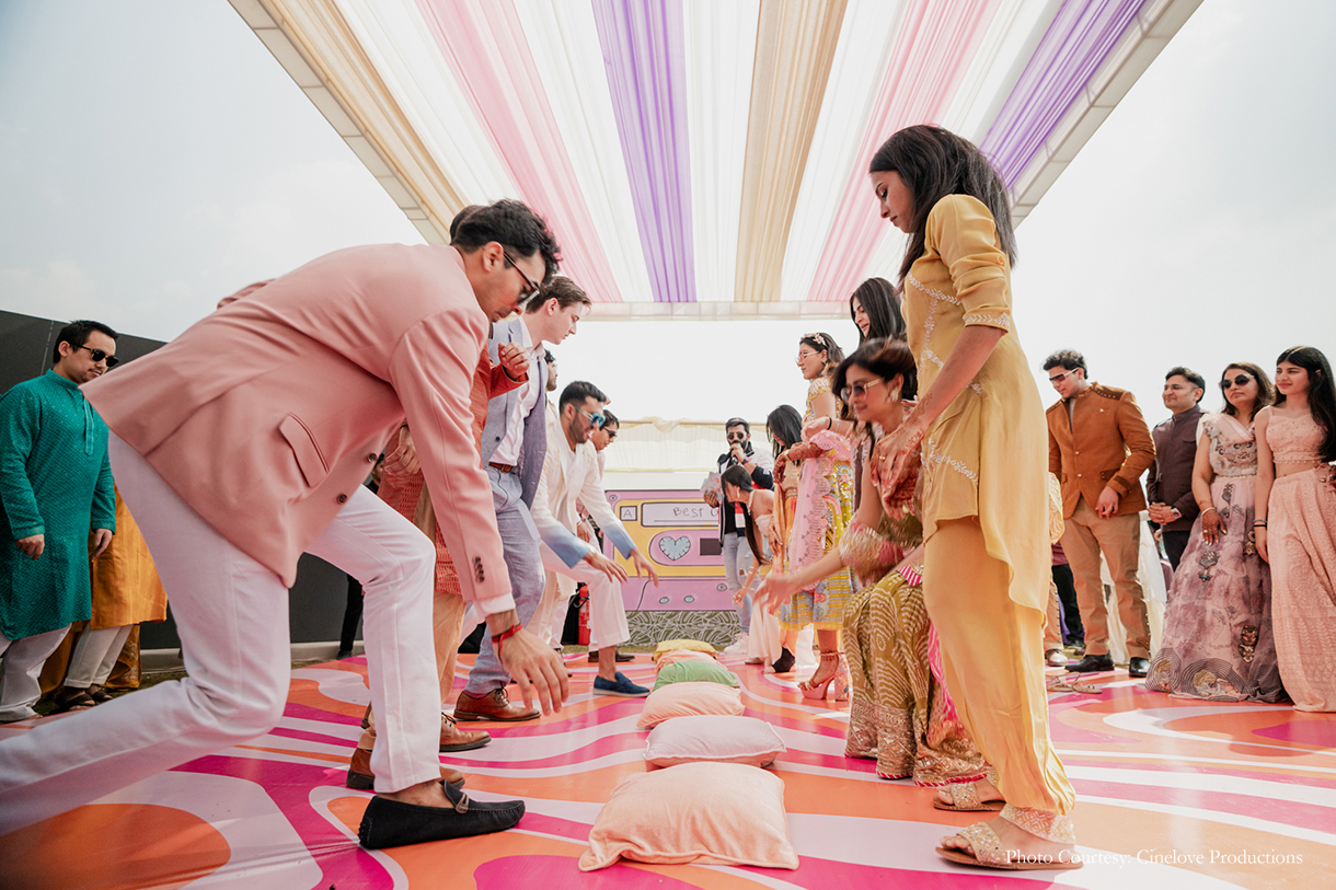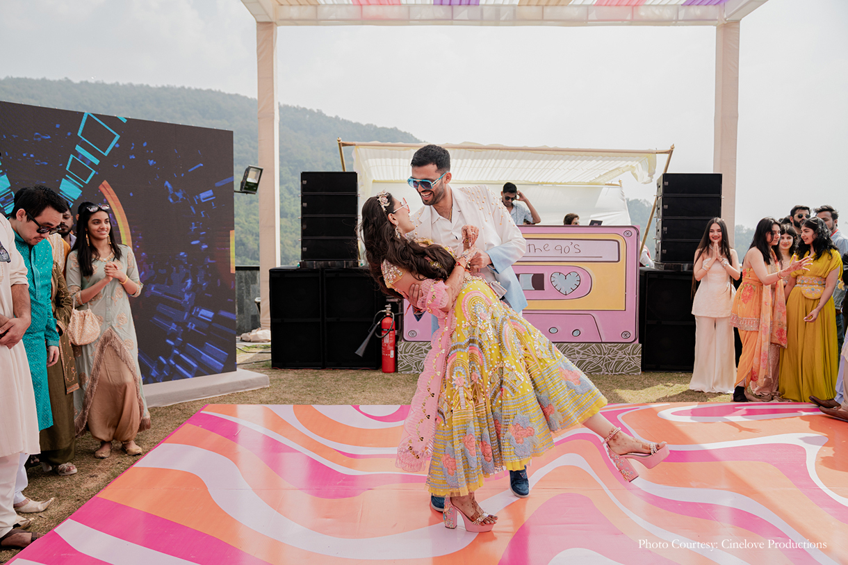 Going down the nostalgic road, the couple hosted a mehndi peppered with ’90s hit songs that reminded them of their childhood. A pink dancefloor, massage stations for the guests and wildflower floral setups gave the event a whimsical vibe where the guests enjoyed themselves freely.