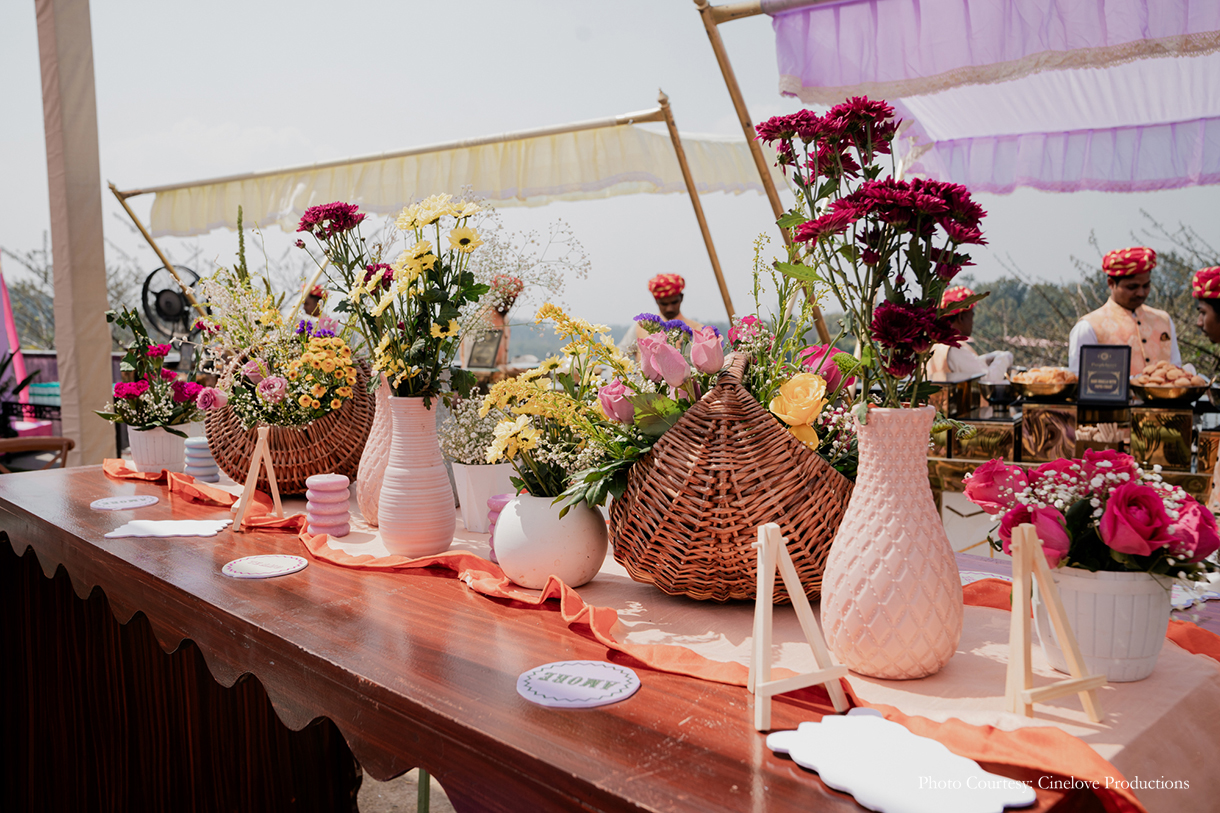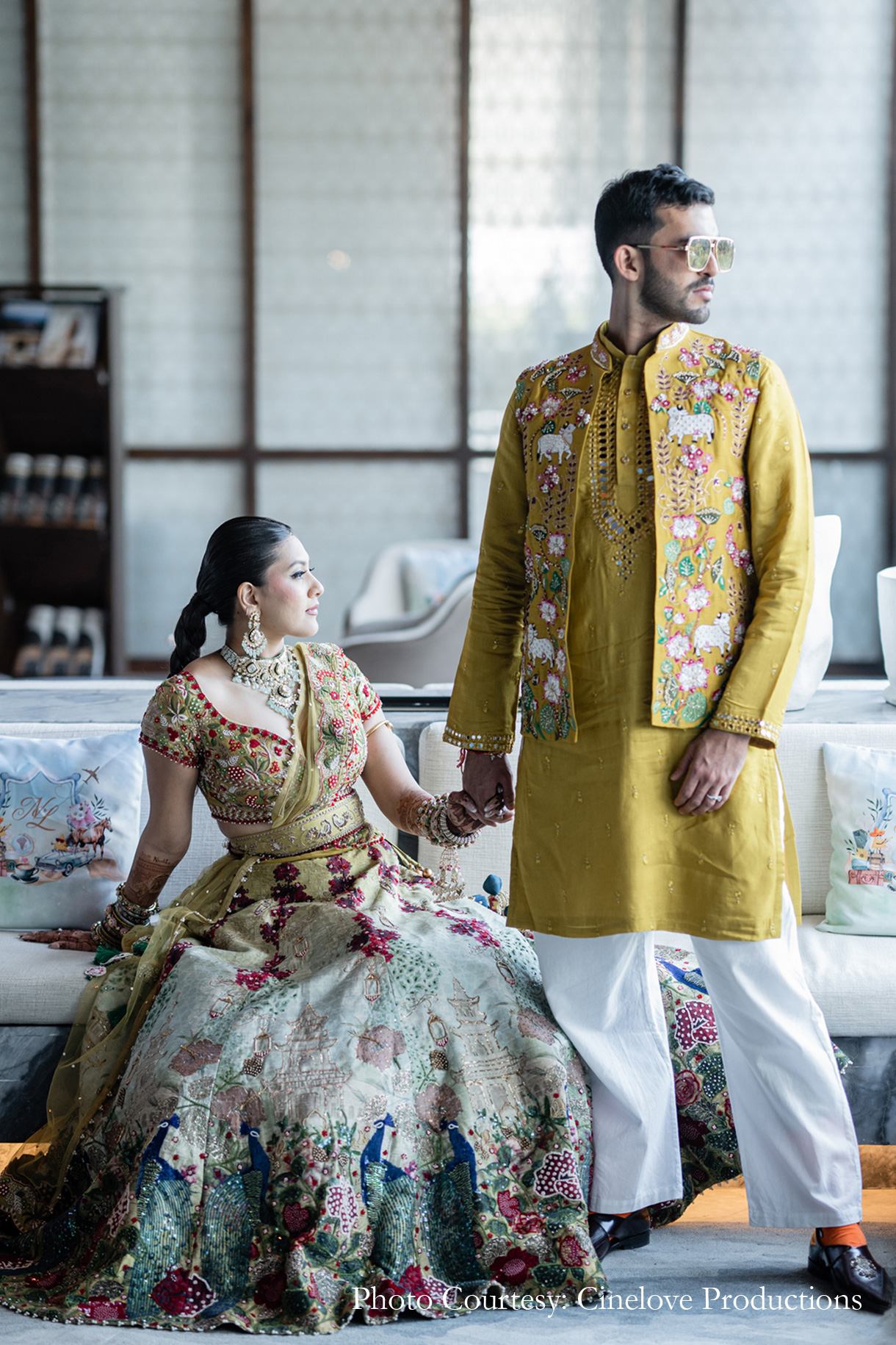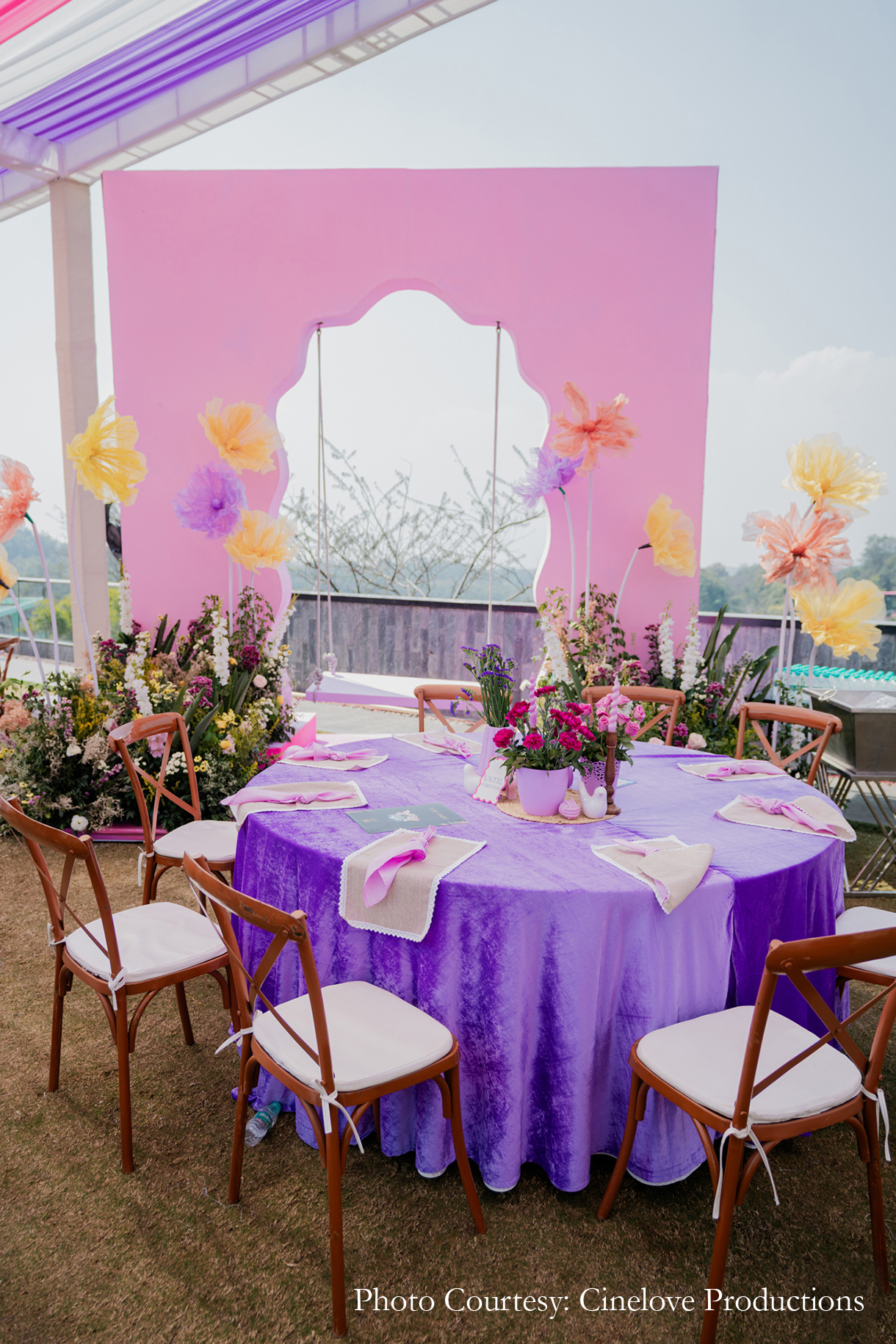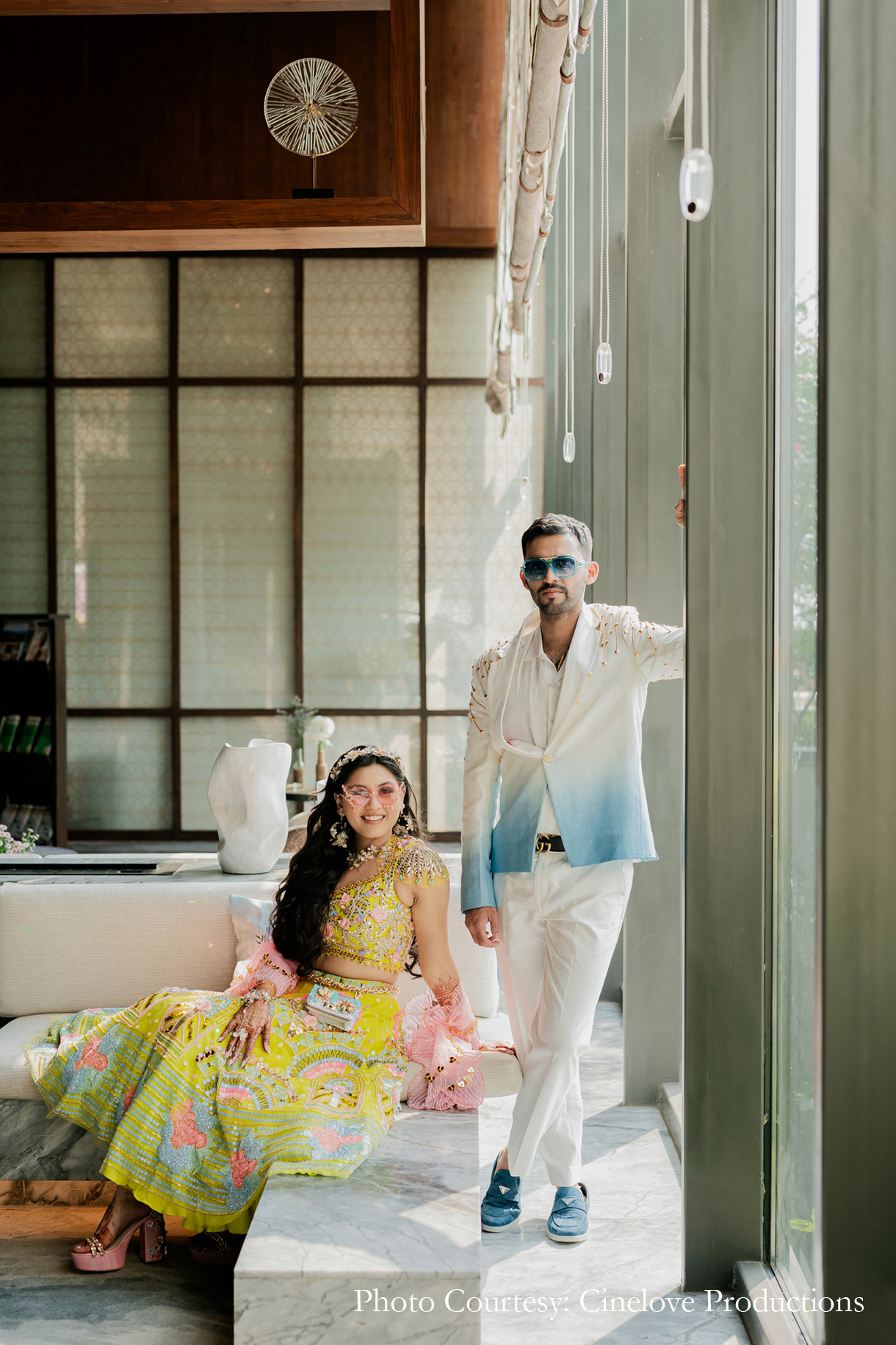 Going down the nostalgic road, the couple hosted a mehndi peppered with ’90s hit songs that reminded them of their childhood. A pink dancefloor, massage stations for the guests and wildflower floral setups gave the event a whimsical vibe where the guests enjoyed themselves freely.