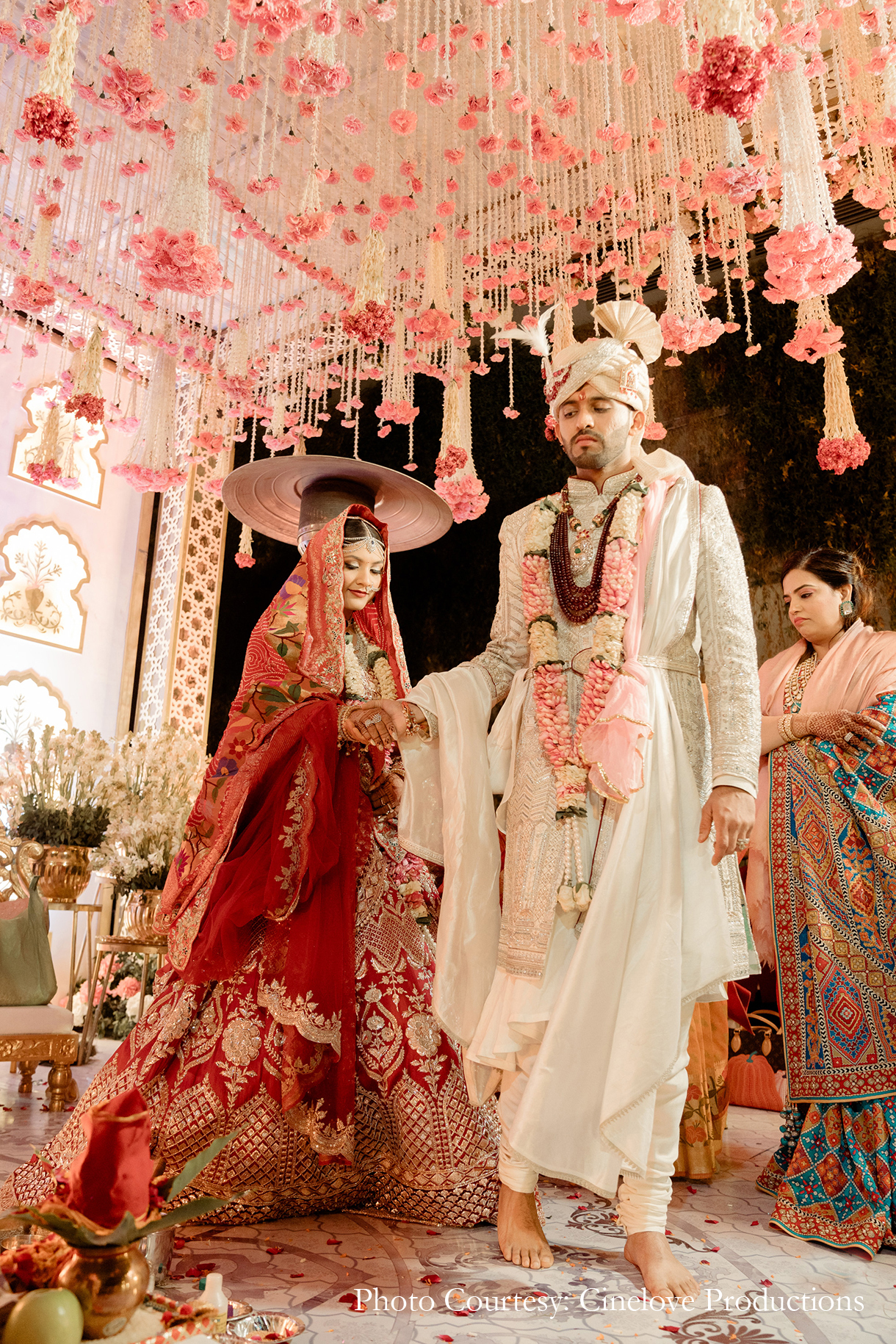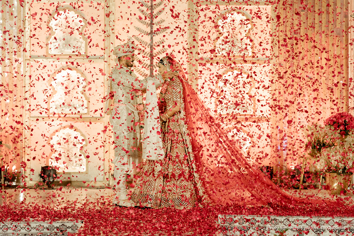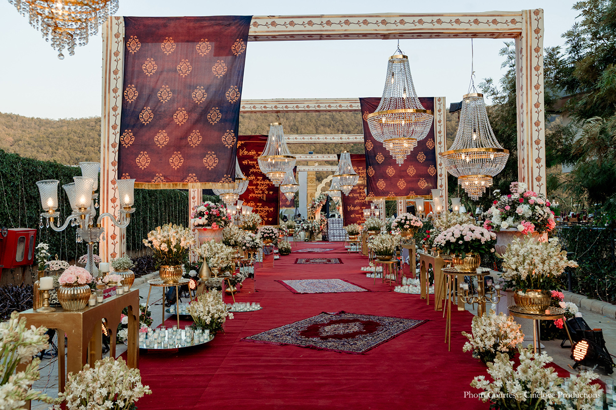 A highly traditional affair lit up by crystal chandeliers and covered in drapes with ethnic prints, the wedding was regal with its red and gold color palette. Antique rugs, white tuberoses, white pillar candles and brass vases adorned the entryway. The mandap was created using latticework pillars, suspended blooms and a meenakari-style backdrop.