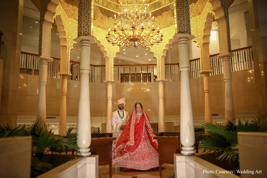 While their other events were hosted at Waterstones Hotel, the couple decided to bring their celebration to an end in a stylish manner at The Leela Mumbai where they were awed by the beauty of the venue. Mahak shares, “We found The Leela Mumbai to be an exquisite property from the first glance itself. Right from its landscapes gardens, waterfalls, and fountains to its welcoming aura – everything just fit together perfectly! And, even though it’s in Mumbai we felt as though we were transported to a peaceful space the minute we stepped foot into it. All in all, it ticked every box in our list and made our reception an unforgettable one.”