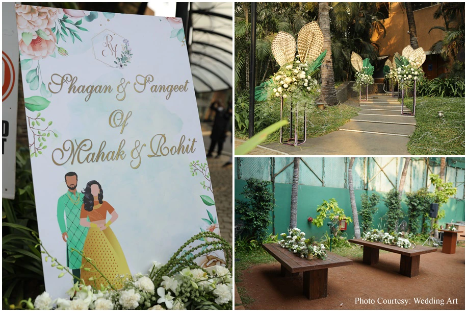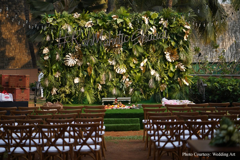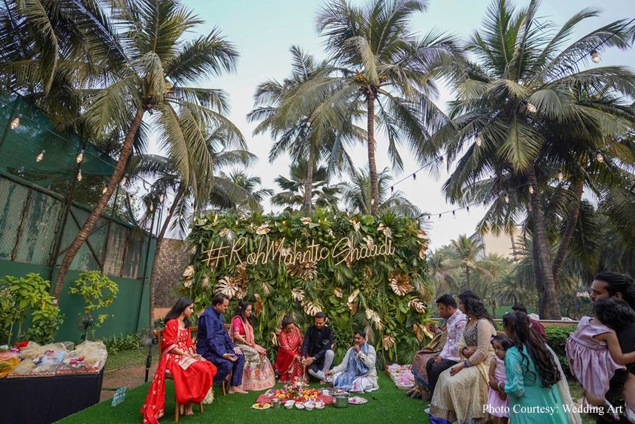 Simple and quietly hosted under the blue sky, the Shagun ceremony marks the beginning of the marriage festivities and consists of the bride being given gifts. Encircled by greenery and a backdrop decorated with tropical foliage, the duo’s shagun ceremony was punctuated by, both, sombre as well as fun moments!