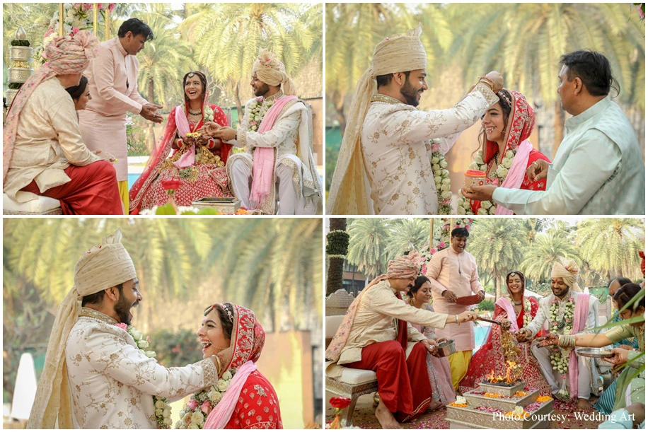 Hosted by the pool under the bright sunshine, the wedding was a breezy one. As the bride entered under the phoolon ki chadar which was also held up by her gal pals, both, Mahak and Rohit exuded joy! Laden with pink and white blooms, the gold and pastel-hued mandap looked striking against the light blue sky in the month of March. Mahak shares, “The wedding was completely pastel and keeping the dress code in mind, everyone turned up in pastel hues which made everything look aesthetically beautiful. Plus, the wedding was hosted during the early evening so the soft light made the colors look lovely.”