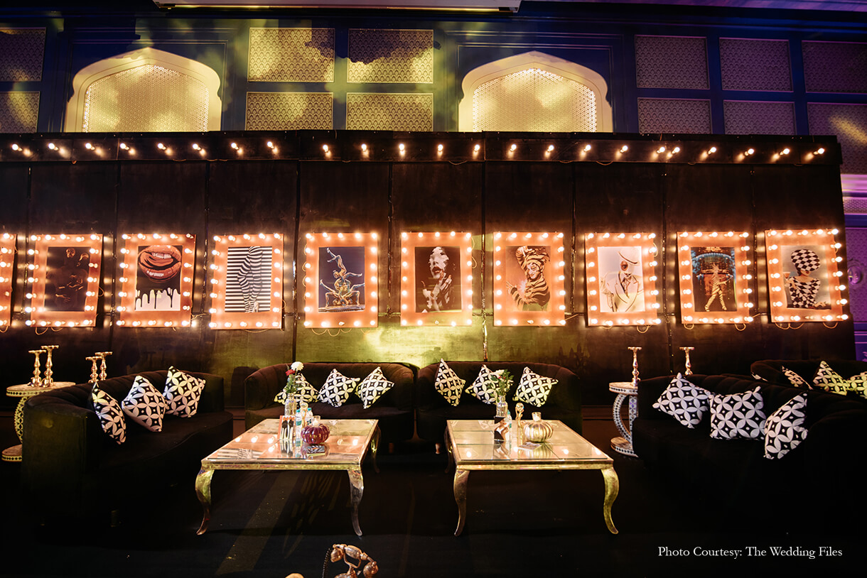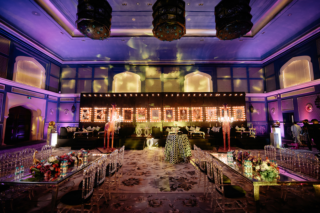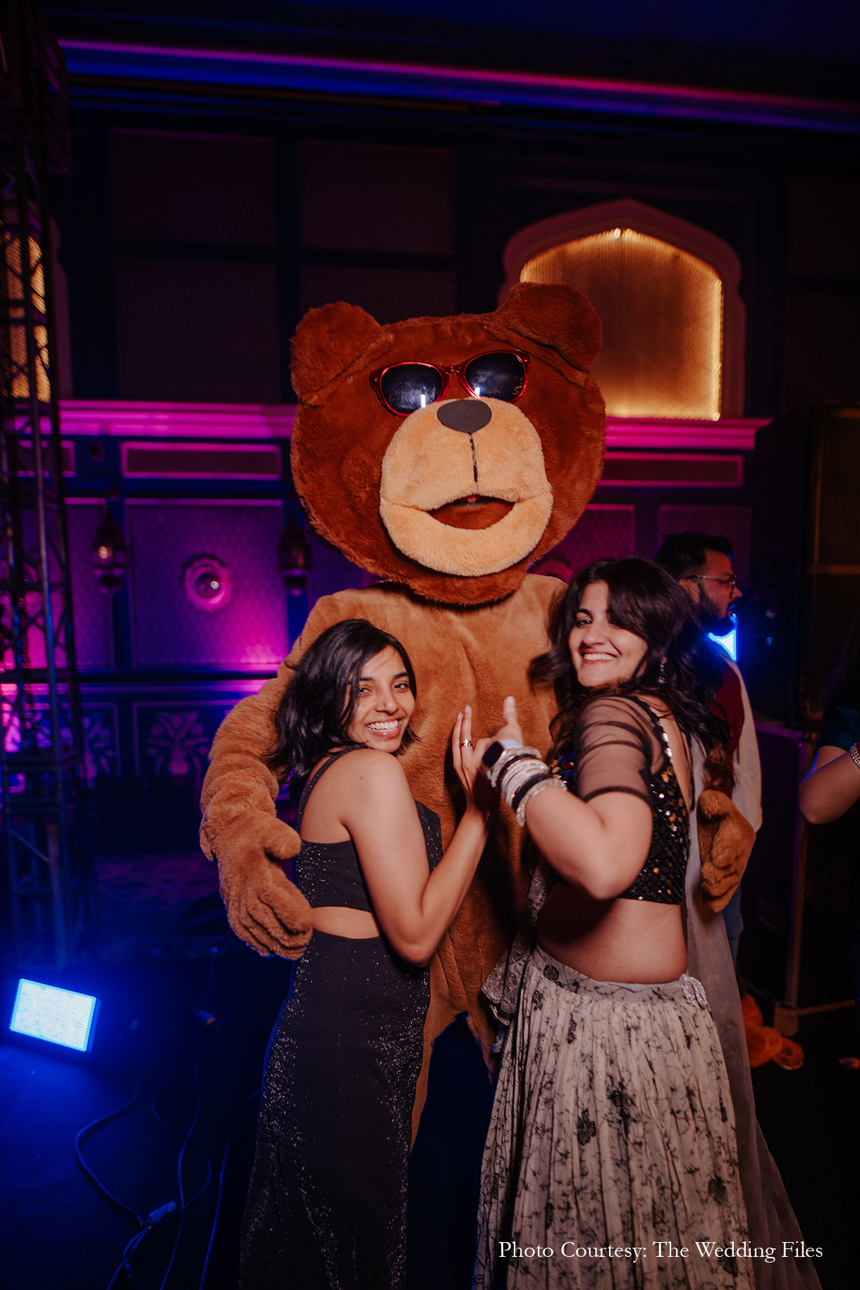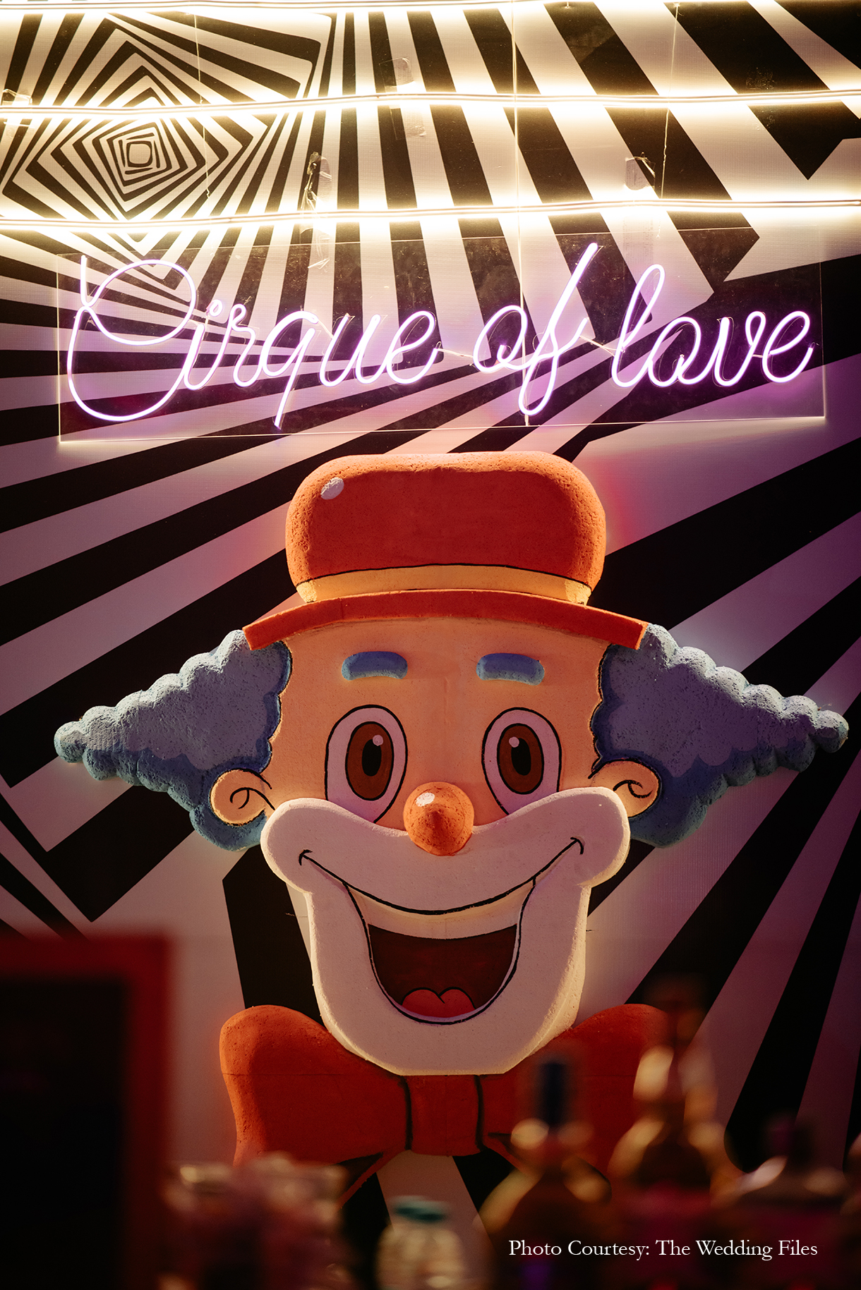 Team Baraati Inc. shares, “For cocktails, the theme was ‘Cirque of Love’. The couple entered hand in hand to their favourite song while the guests held LED fireflies on both sides to welcome them. As the party started, glow-in-the-dark props were also distributed amongst the guests which made the venue glow brighter! A glitter bar, an infinity booth and a line-up of entertainers, like, the mirror men, toy room teddy and marshmellow, made the cocktail party an epic one as everyone was high-spirited till the wee hours of the morning!”
