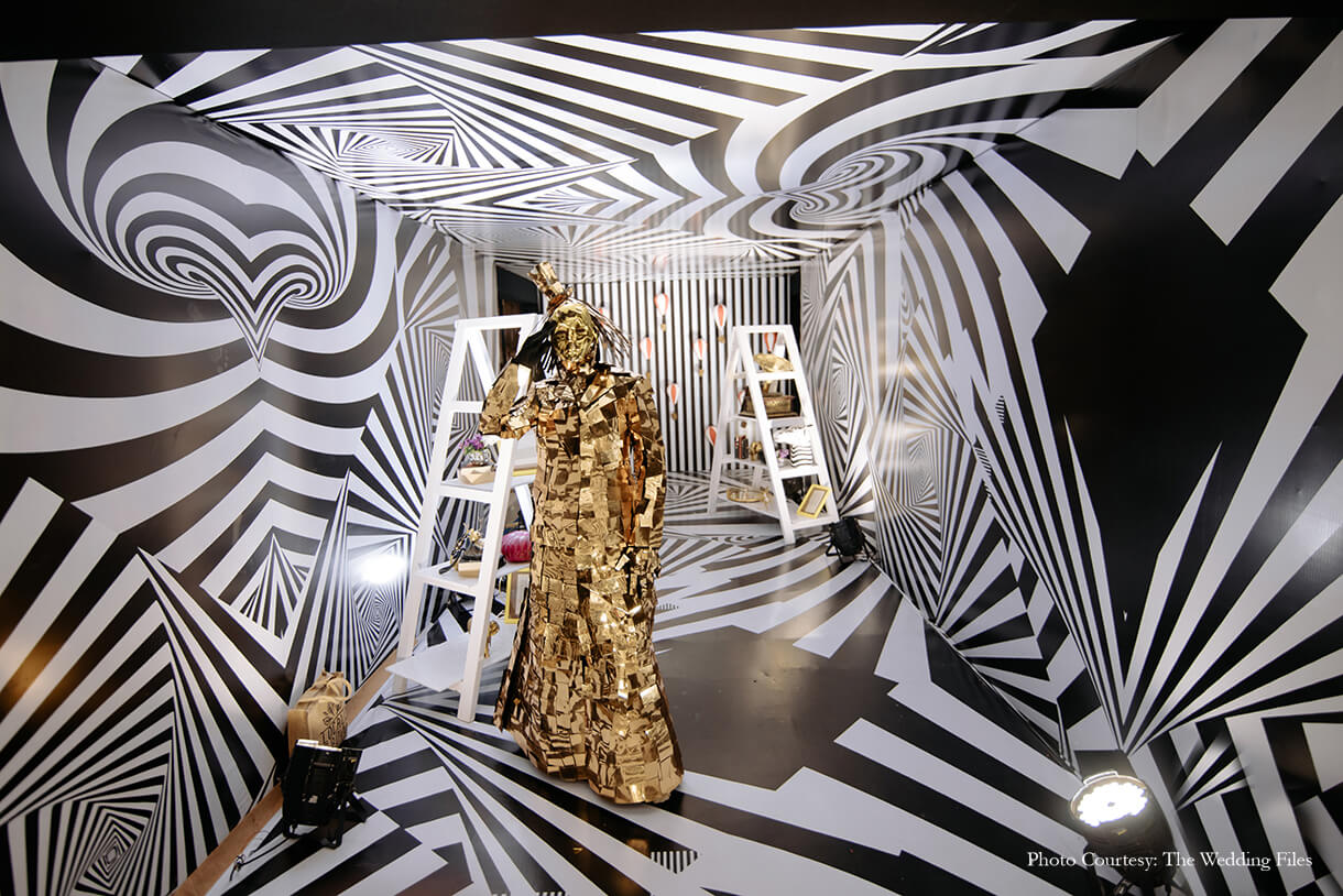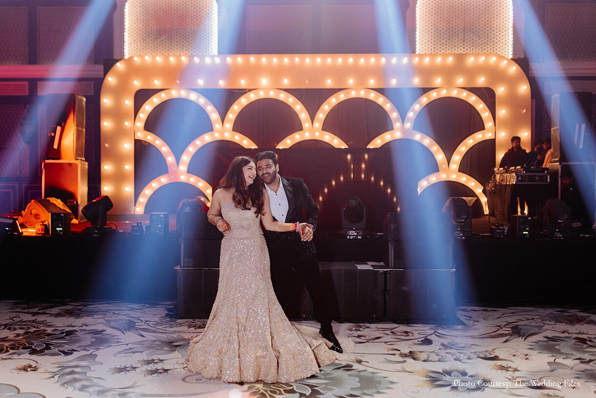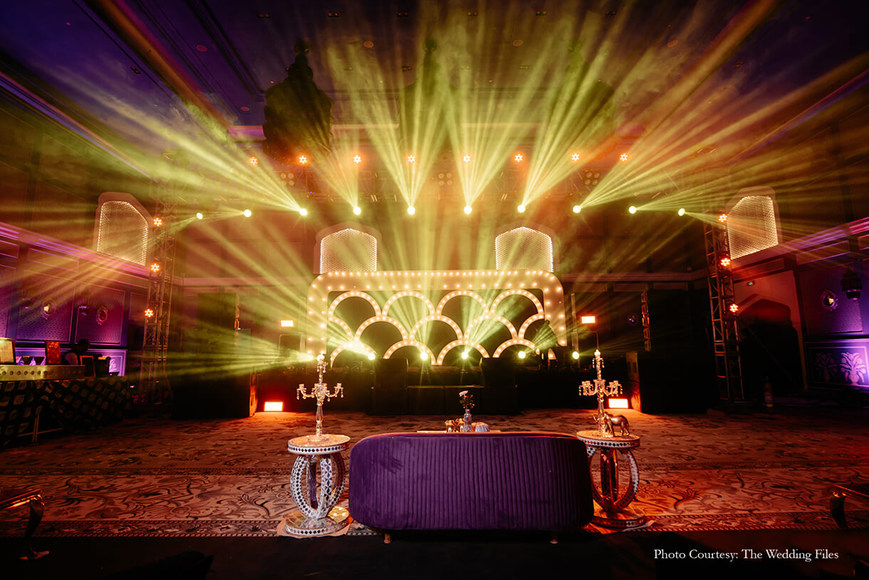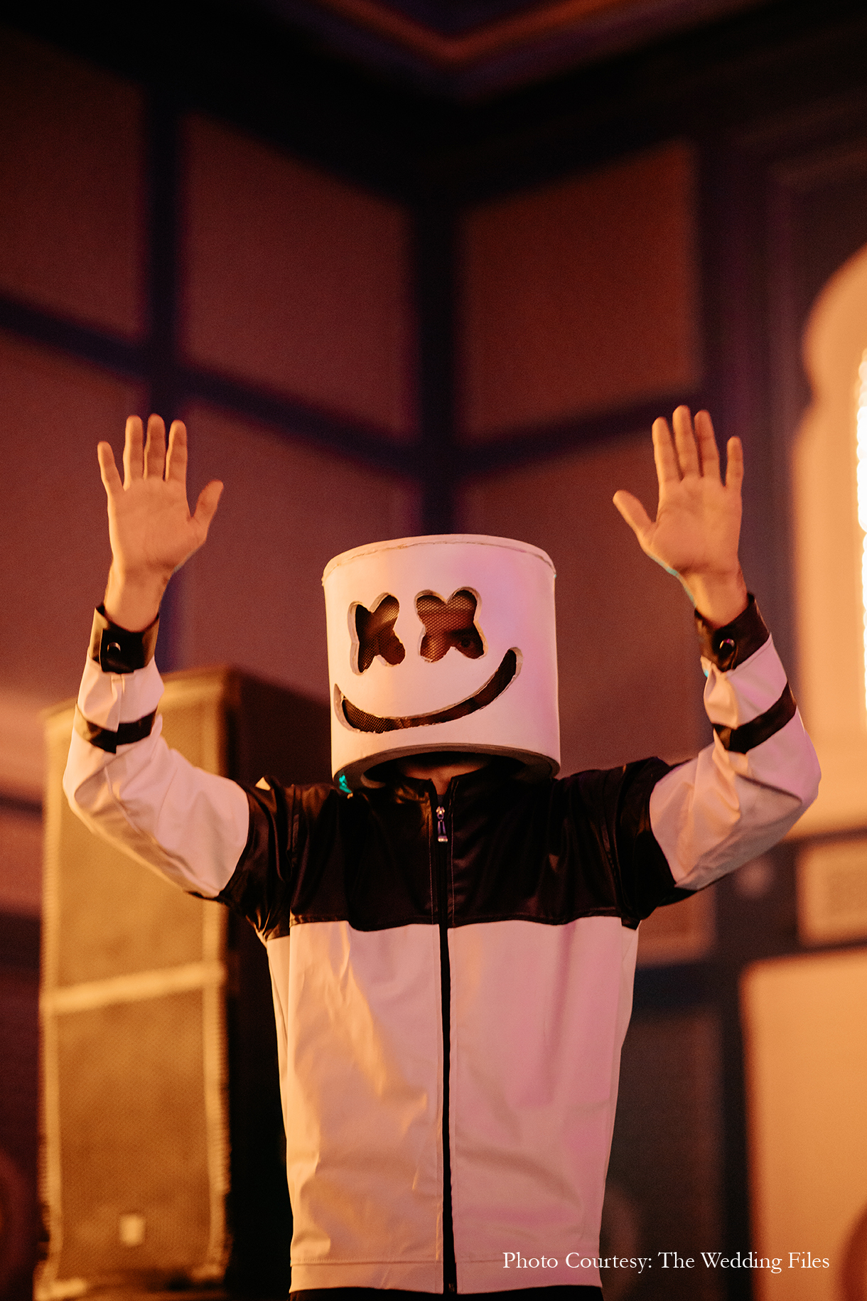 Team Baraati Inc. shares, “For cocktails, the theme was ‘Cirque of Love’. The couple entered hand in hand to their favourite song while the guests held LED fireflies on both sides to welcome them. As the party started, glow-in-the-dark props were also distributed amongst the guests which made the venue glow brighter! A glitter bar, an infinity booth and a line-up of entertainers, like, the mirror men, toy room teddy and marshmellow, made the cocktail party an epic one as everyone was high-spirited till the wee hours of the morning!”