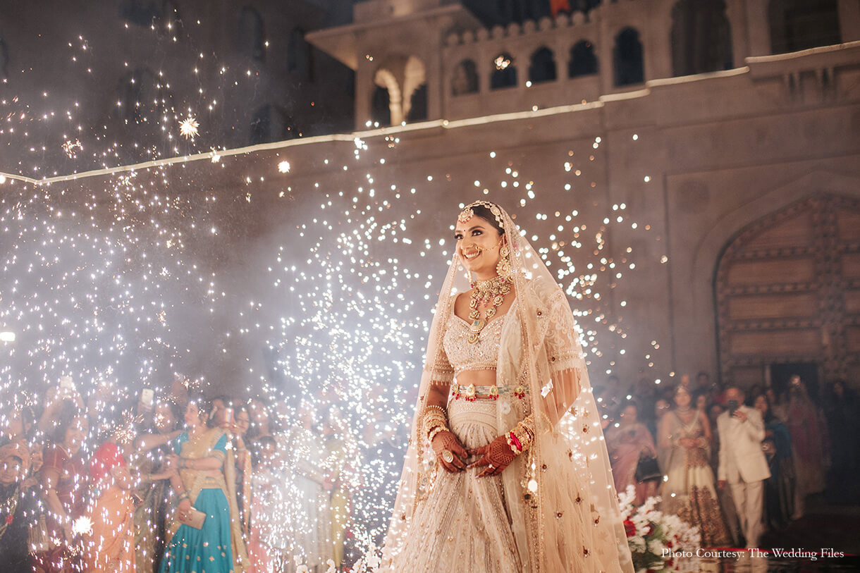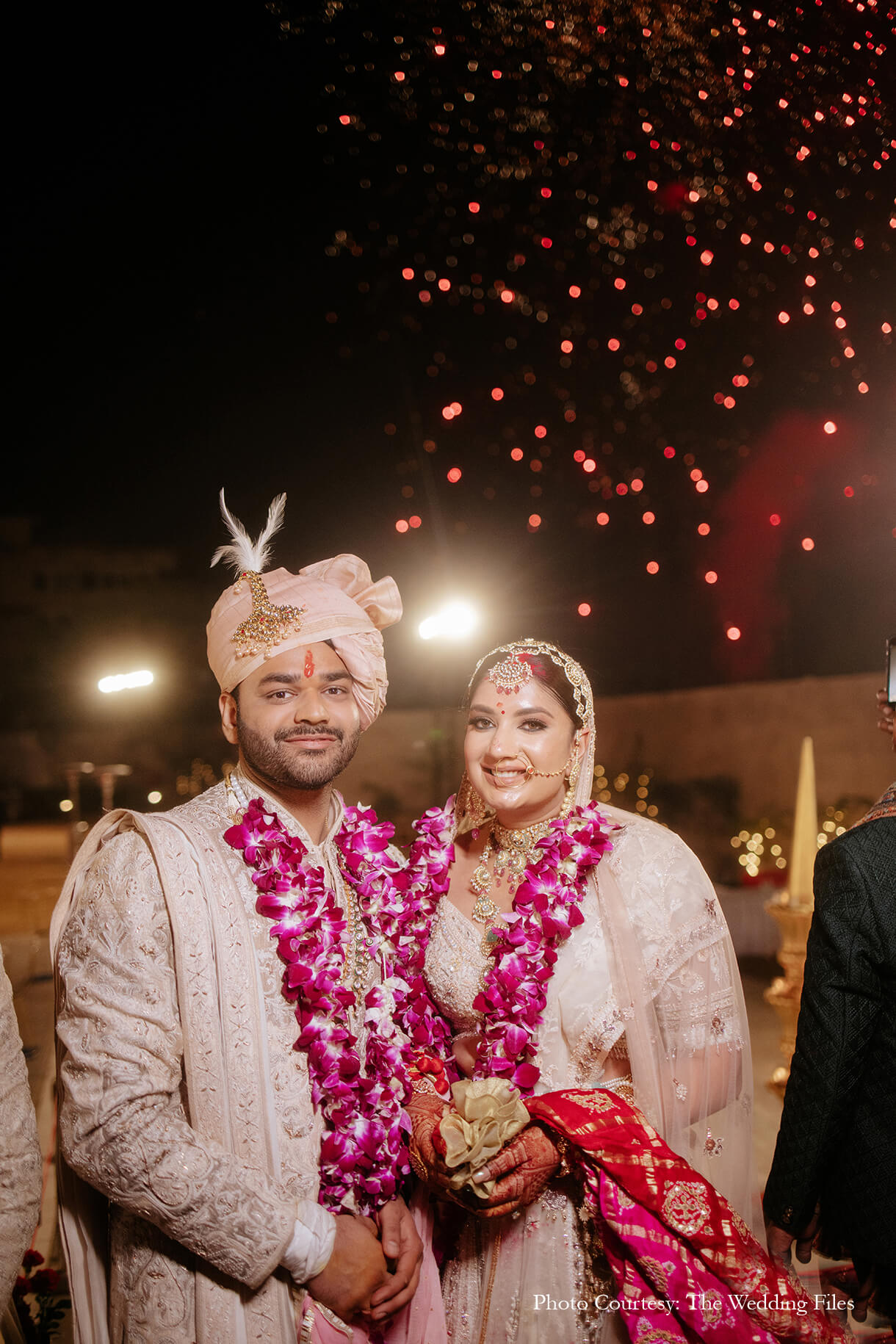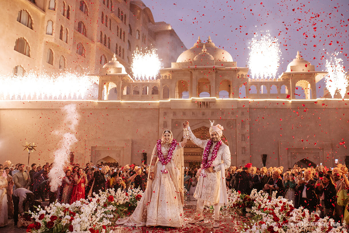 The varmala also was a breathtaking moment. The team adds, “For the varmala, everything looked picture-perfect with dancing pyros lighting the moment up while a petal shower cascaded on the happy couple. All in all, it was everything that the couple had briefed us – grand, regal with a dash of desi spirit!”