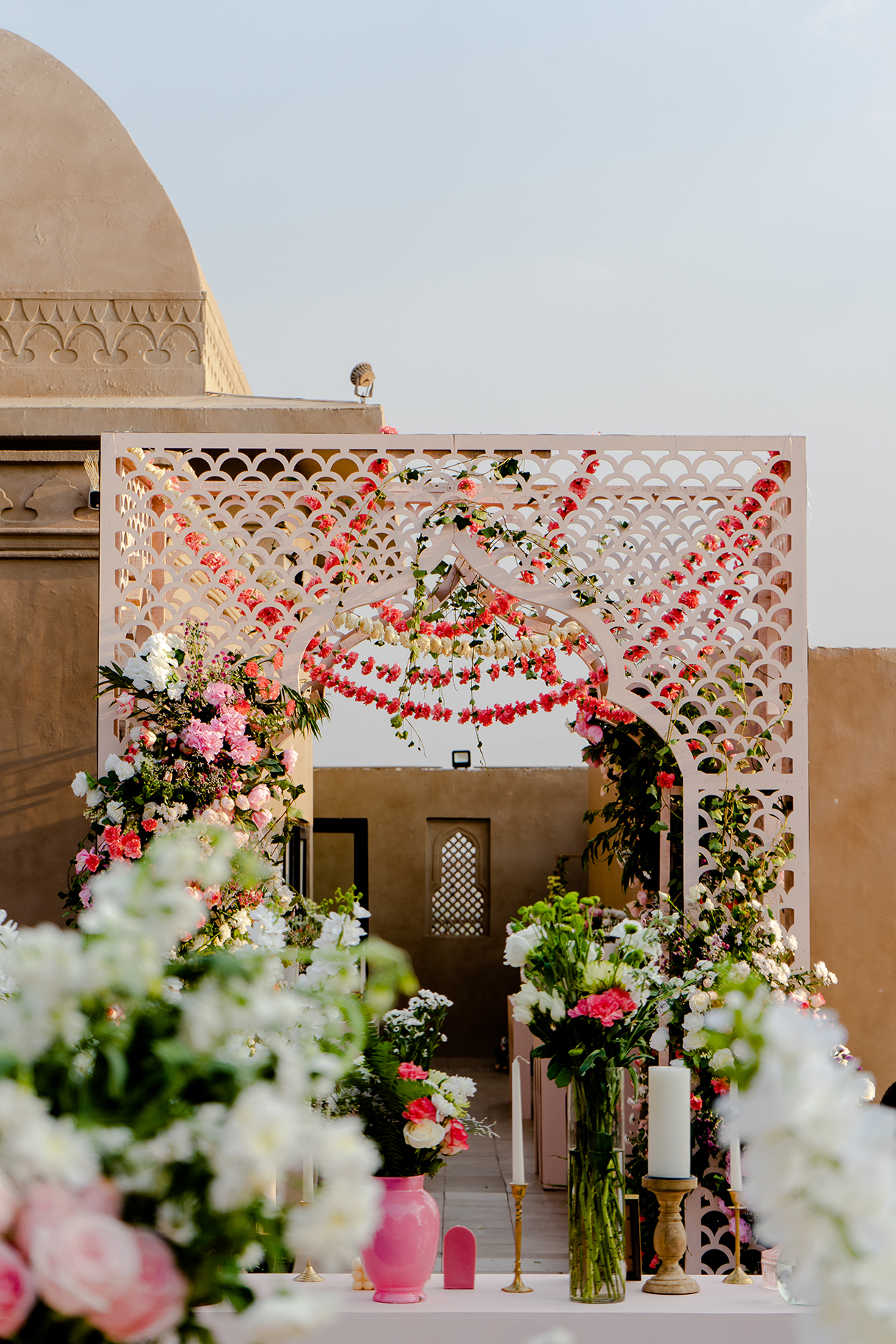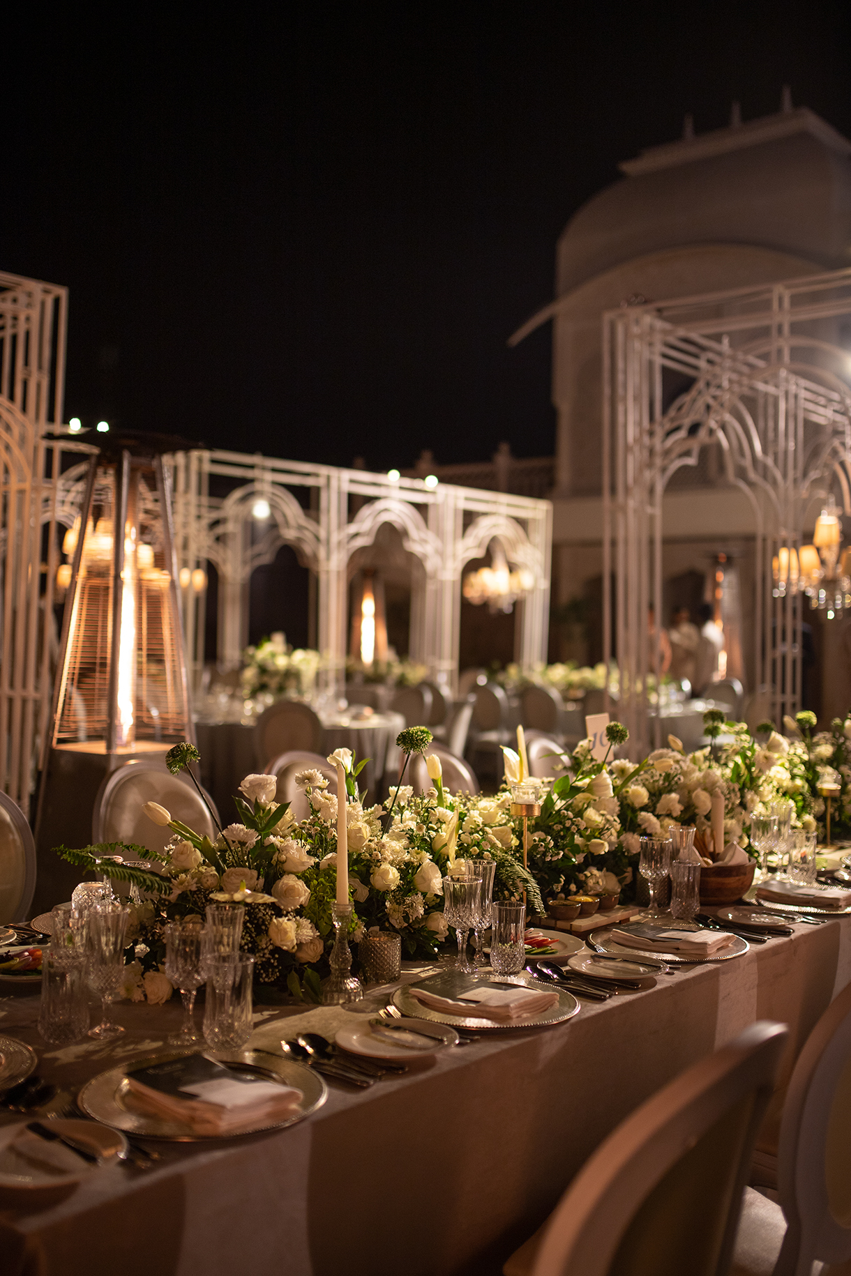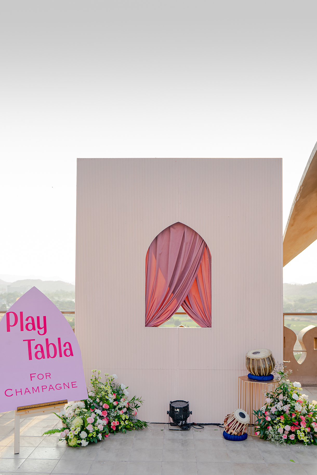 The festivities kicked off with the vibrant hues of sunset casting their warmth over the rooftop Mehndi ceremony. The air was filled with the fragrance of English flowers and the glow of candles, while structures in soft salmon hues enhanced the beauty of the space and contemporary arches gracefully mirrored the terraced beauty of Fairmont Jaipur. The captivating photo op featured a swing adorned with lush florals and comfortable seating while the creative champagne corner with tablas made for a memorable touch.