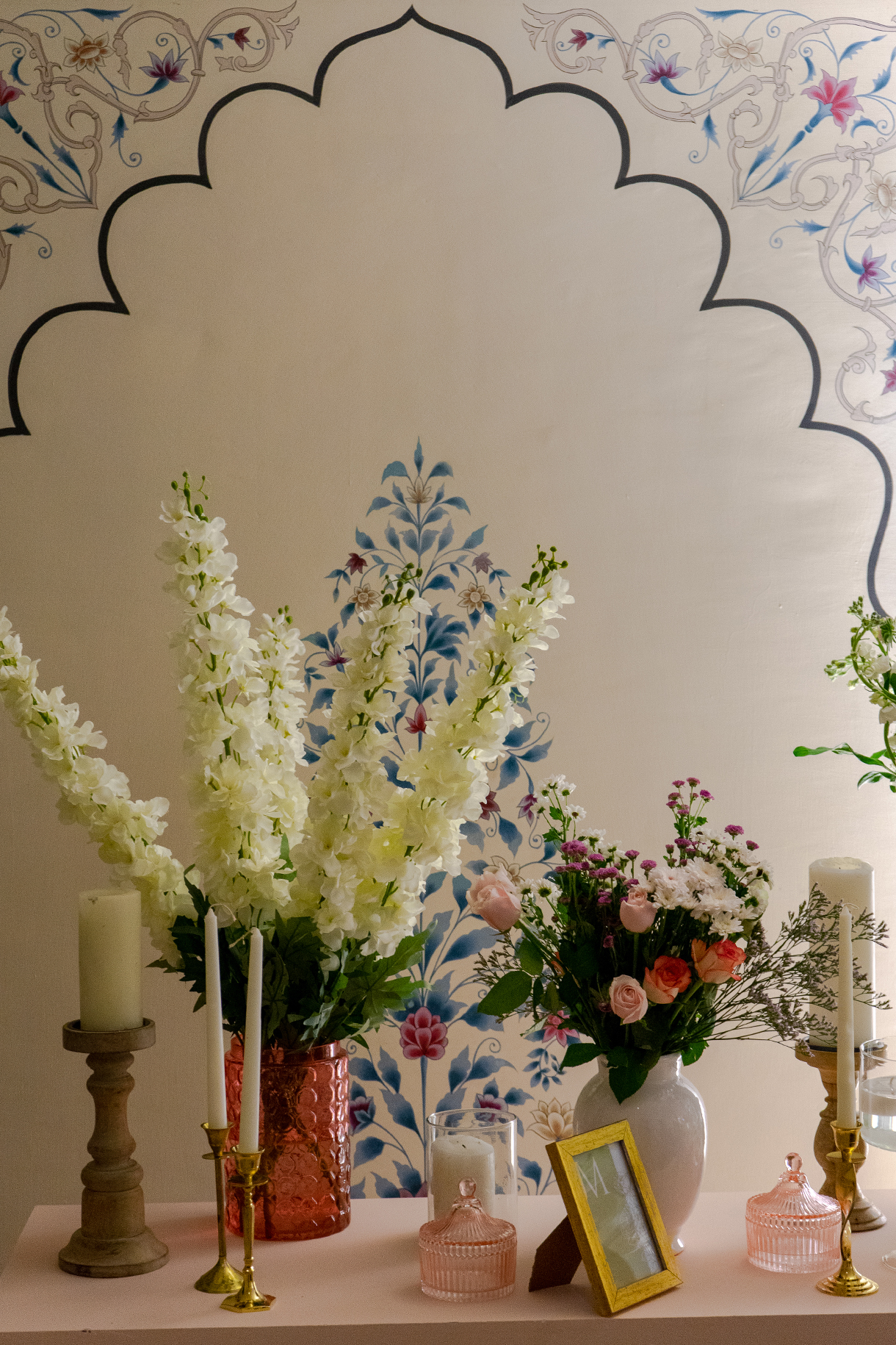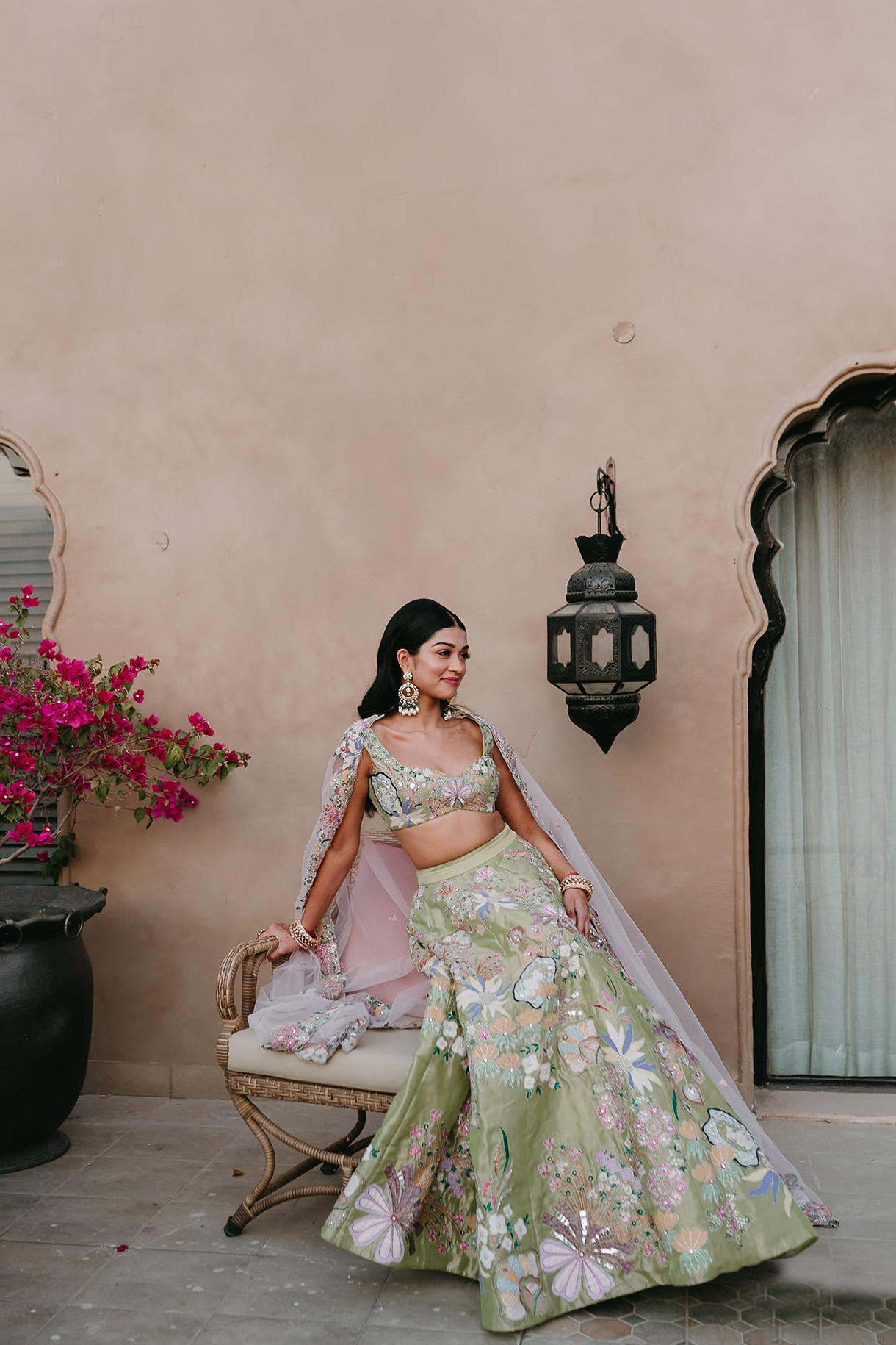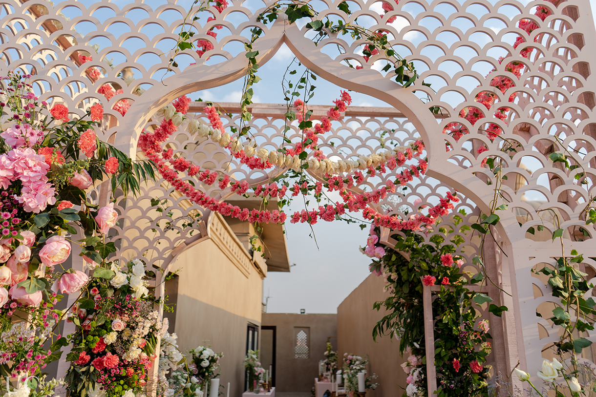 The festivities kicked off with the vibrant hues of sunset casting their warmth over the rooftop Mehndi ceremony. The air was filled with the fragrance of English flowers and the glow of candles, while structures in soft salmon hues enhanced the beauty of the space and contemporary arches gracefully mirrored the terraced beauty of Fairmont Jaipur. The captivating photo op featured a swing adorned with lush florals and comfortable seating while the creative champagne corner with tablas made for a memorable touch.