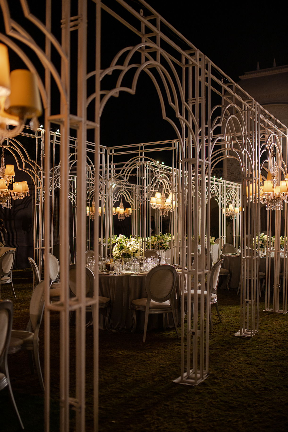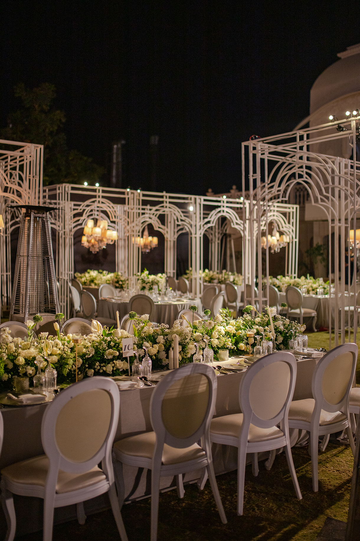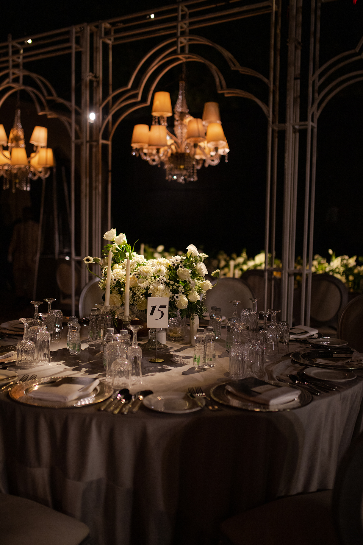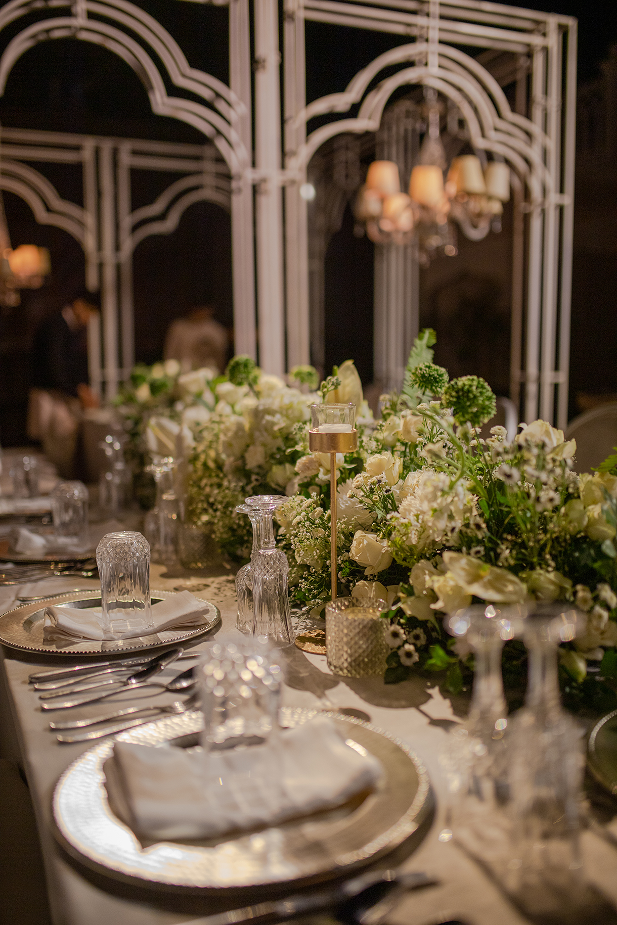 For the finale Reception, the celebration transformed into an exquisite English affair, with a sit-down dinner that transported guests to a world of refined luxury and understated glamour. Contemporary arches enhanced with twinkling chandeliers and flickering candles, cast a soft glow over tables adorned with the finest blooms from across the English countryside. The timeless white decor palette was infused with contemporary elements in subtle hues of grey and ivory. Clusters of consoles with exotic flowers and flickering candles made for visually striking arrangements, while the staircase was transformed into a verdant oasis with lush greens and twinkling candles. A mix of round and long guest tables, detailed with lavish floral arrangements, custom-designed wrought iron structures, and elegant chandeliers, offered a blend of intimacy and grandeur. At the heart of the venue, a contemporary wave-shaped wall with the couple’s logo served as a captivating backdrop, a perfect stage for their first dances.