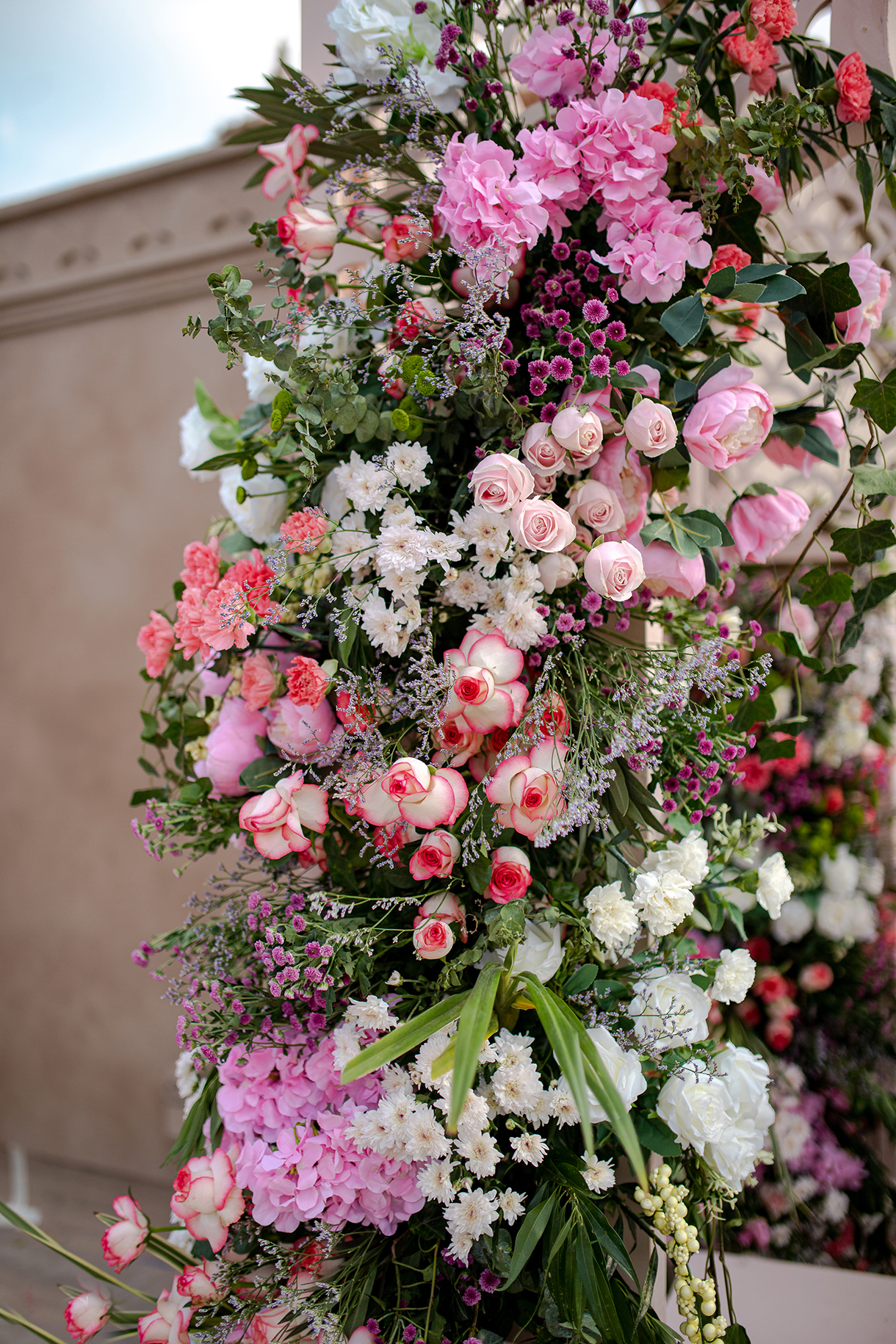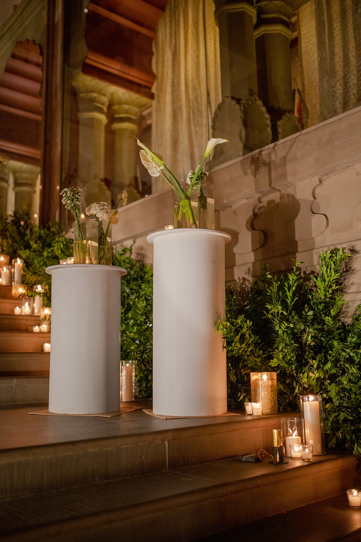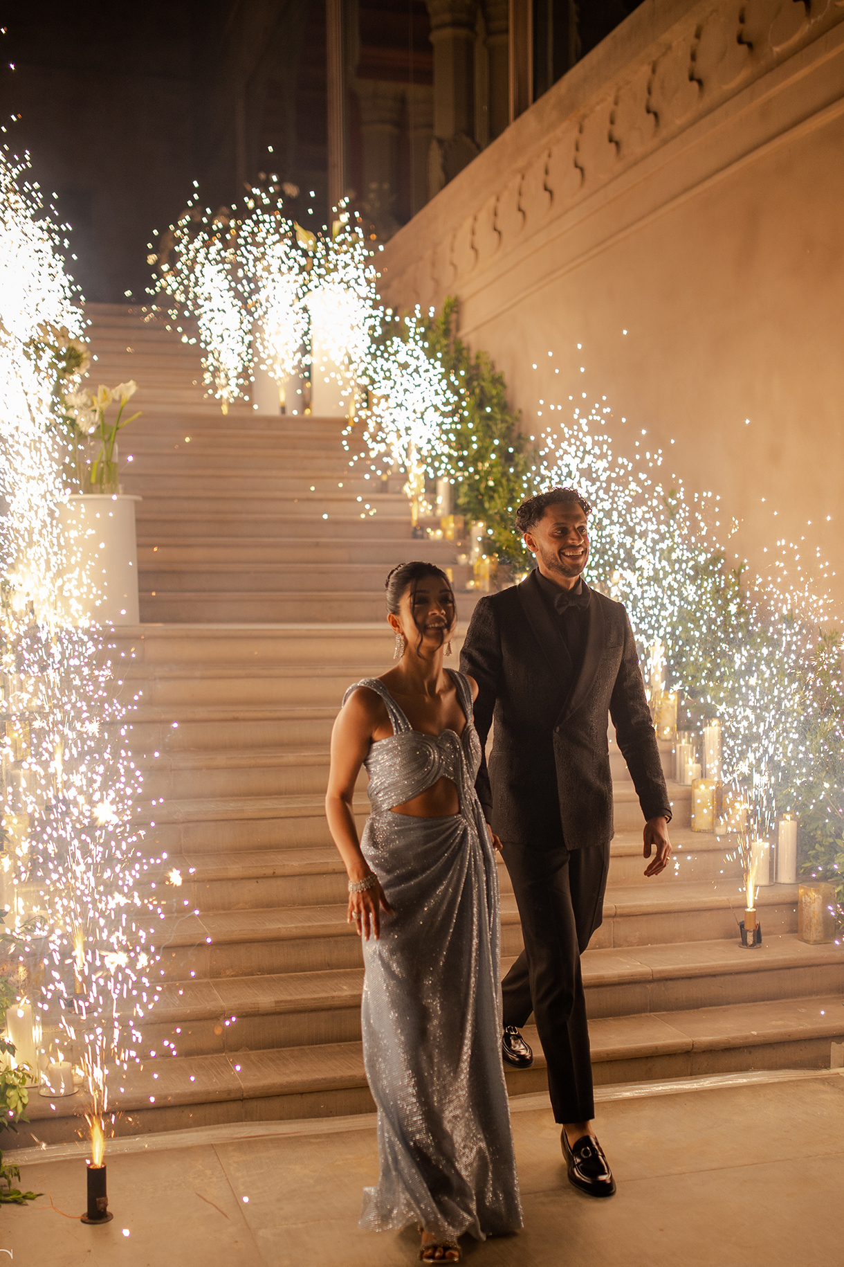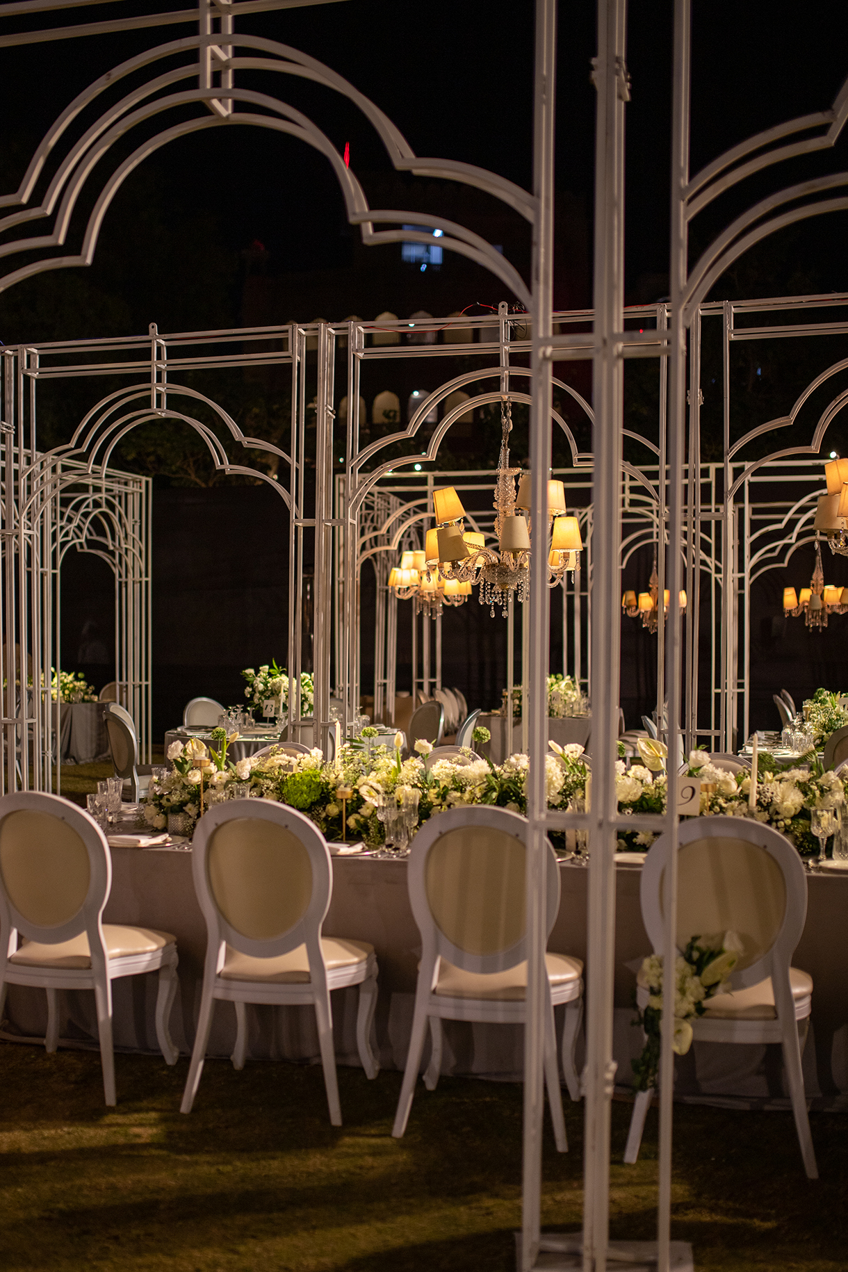 For the finale Reception, the celebration transformed into an exquisite English affair, with a sit-down dinner that transported guests to a world of refined luxury and understated glamour. Contemporary arches enhanced with twinkling chandeliers and flickering candles, cast a soft glow over tables adorned with the finest blooms from across the English countryside. The timeless white decor palette was infused with contemporary elements in subtle hues of grey and ivory. Clusters of consoles with exotic flowers and flickering candles made for visually striking arrangements, while the staircase was transformed into a verdant oasis with lush greens and twinkling candles. A mix of round and long guest tables, detailed with lavish floral arrangements, custom-designed wrought iron structures, and elegant chandeliers, offered a blend of intimacy and grandeur. At the heart of the venue, a contemporary wave-shaped wall with the couple’s logo served as a captivating backdrop, a perfect stage for their first dances.