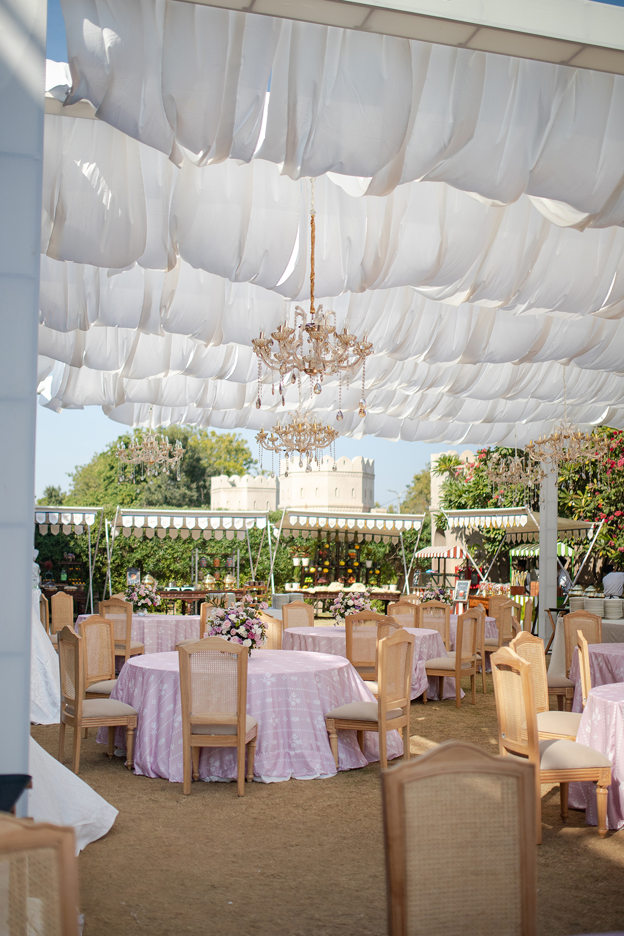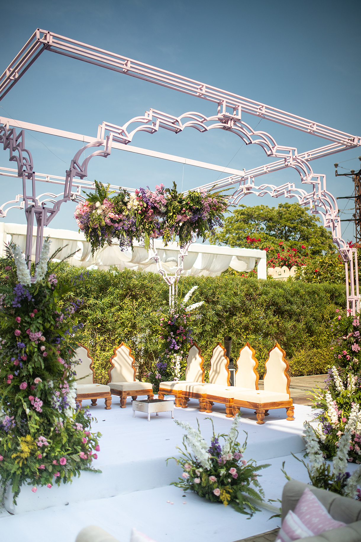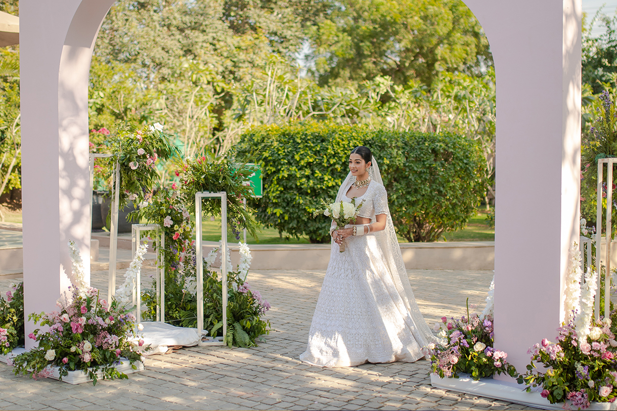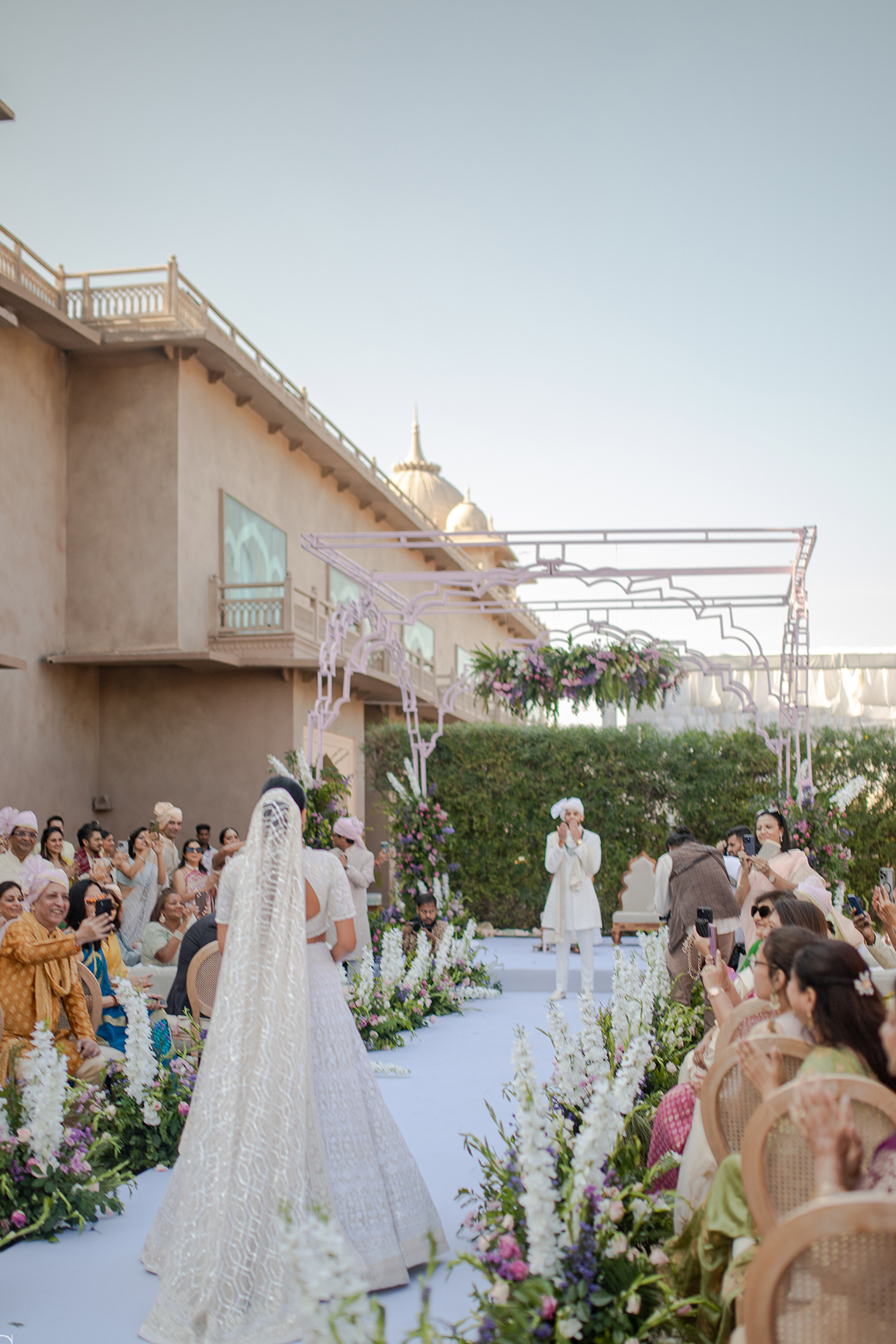 The wedding unfolds in a palette of pristine whites, adorned with delicate hints of lilac and pink. Against the backdrop of this ethereal setting, love took centre stage, radiating in every exchange and every glance. Showcasing the inherent charm of the Bauli and allowing its natural allure to take centre stage, the innovative wrought iron mandap was meticulously crafted with intricate arches brushed in a soft pink hue. A floral chandelier, suspended with grace, added a touch of whimsy and elegance, casting a gentle glow over the proceedings. Every detail, from the delicate blooms to the ivory accents, linen prints, floral aisle, and more, harmonised effortlessly with the couple’s scintillating ivory attires, creating a seamless fusion of style and substance.