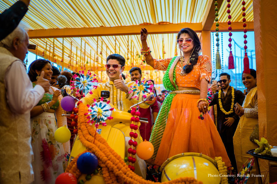 “This function was truly my mom’s doing, and she got everything she wanted. She wanted to have the ‘mela’ (traditional fair) theme with a lot of stalls, colors and food carts, and we got exactly that. There were a lot of chaat counters alongside ethnic shoes and bangle sellers. The decor was very Rajasthani with beautiful bright colors, and everything was tastefully done and executed. We even had ‘Phoolon ki Holi’ (Holi with flowers) which was a lot of fun. Shyam and I made our entry on one of those vintage scooters with the buggy seat on the side.”