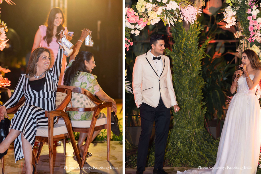 For their final event, the couple jetted off to Goa where they celebrated with a sundowner party and a vow ceremony. Miloni says, “We wanted the after-party to be something unique and unforgettable—an experience that was wild, free-spirited, and full of adventure. The idea of a jungle-themed party immediately captured our imaginations, and we knew it would be the perfect setting for everyone to let loose and have a blast in a different environment.