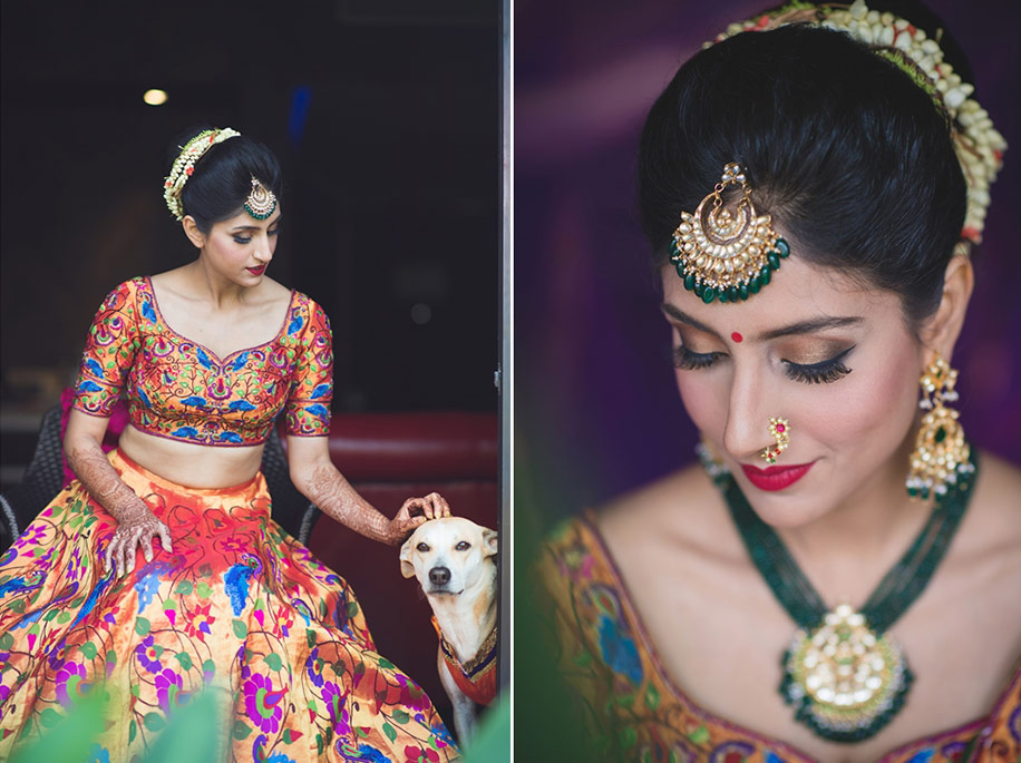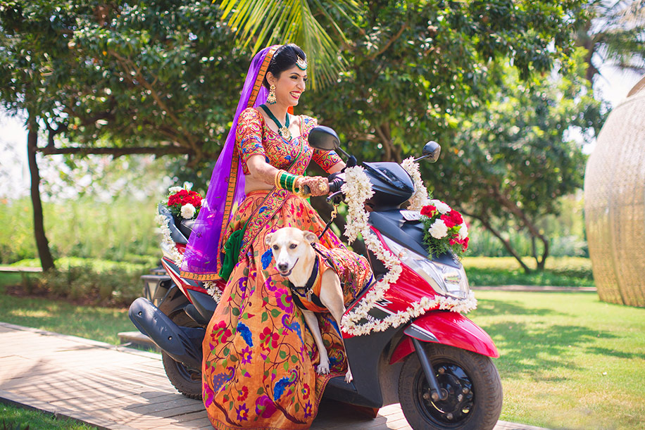 A bridal entry on a bike with a puppy, a white wedding theme sunset engagement, a Holi party, custom made Paithani lehenga, a Peshwa groom and a complete customized matching trousseau for their pet Panty (that’s their pup’s name!) Mitali and Ali’s fun filled wedding was an ode to effortless style and unlimited imagination and ideas brought to life!