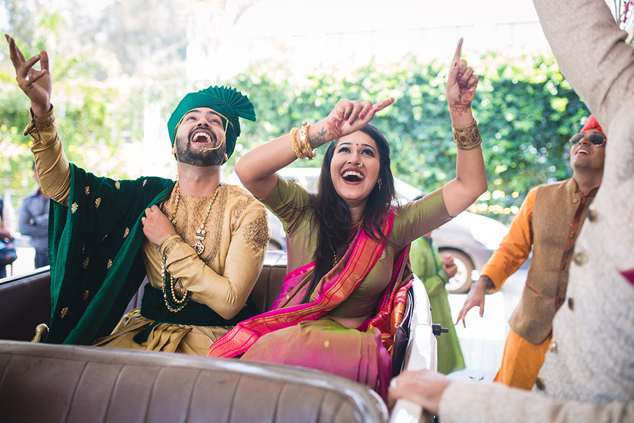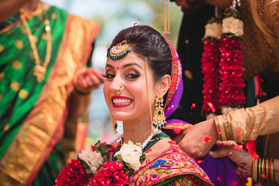 Since the Pheras were Maharashtrian style, the inspiration was Bajirao Mastani for both our outfits. I wasn’t too keen on wearing a Paithani Nauvari saree as I didn’t think it looked grand enough. Therefore, my mother-in- law (Sakina Shakeer) and I discussed the possibility of making a lehenga out of a Paithani saree. Little did I think she would manage to custom make an entire Paithani Lehenga that took nearly eight months to be completed! It was a dream come true and very well complemented Ali’s Peshwa costume. Since Panty and I get around Mumbai on my scooter, it was only fitting that we got to the mandap like that too. Ali actually managed to borrow the scooter from a sweet but random couple that he saw on the streets of Goa a day before the wedding. Until the last minute I wasn’t sure if I could manage it in my lehenga but we did with a lot of encouragement from my girls, Jasmeet (my makeup artist), Ankita (WeddingNama) and my sisters. Ali had a vintage car for his baraat with the traditional Nashik Dhol beats in the background.