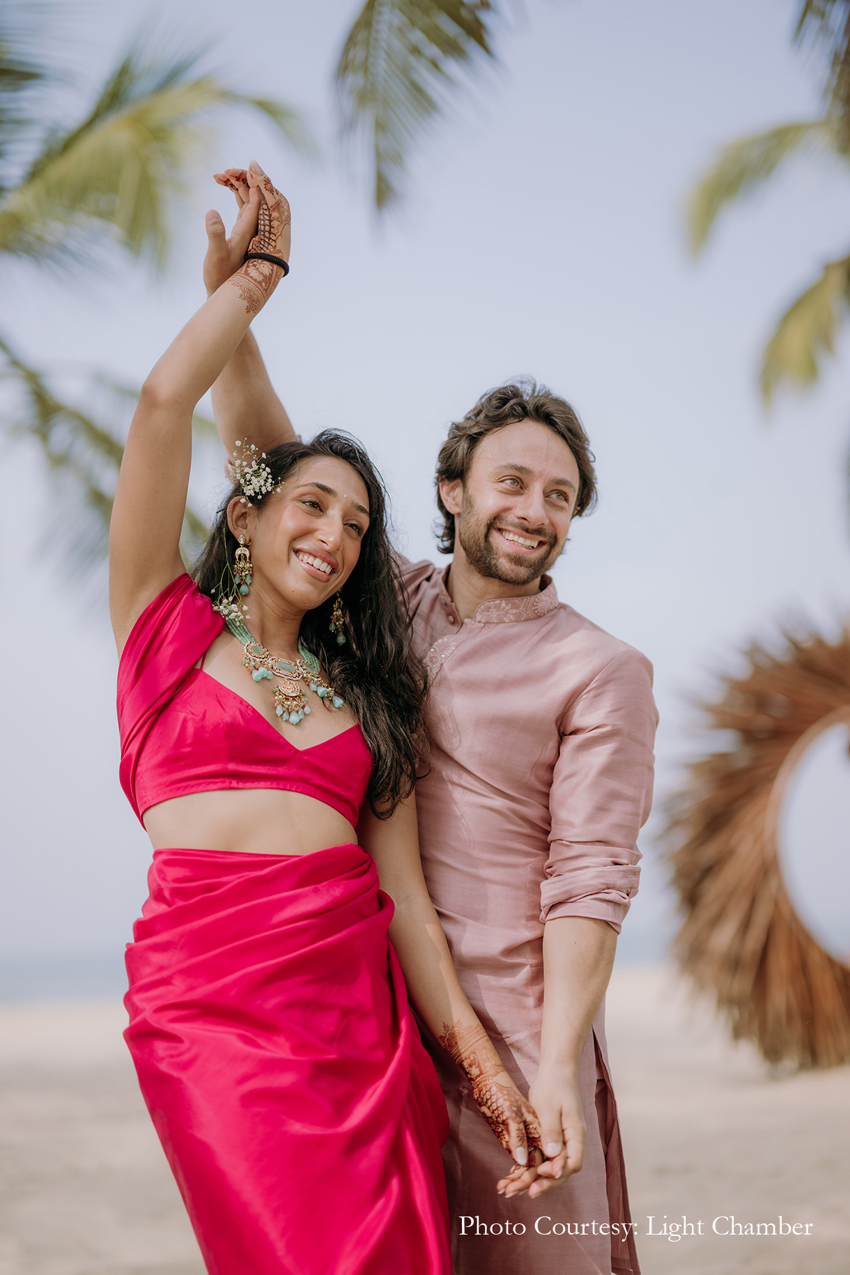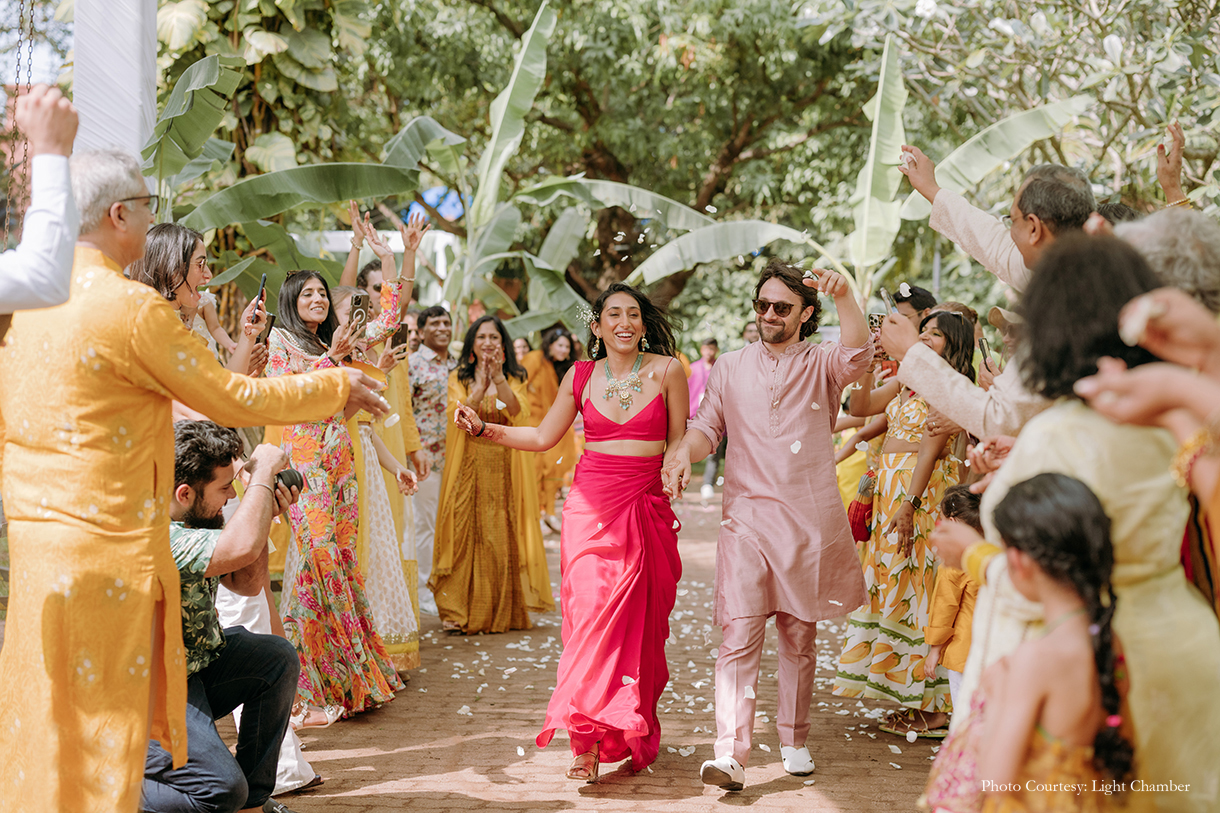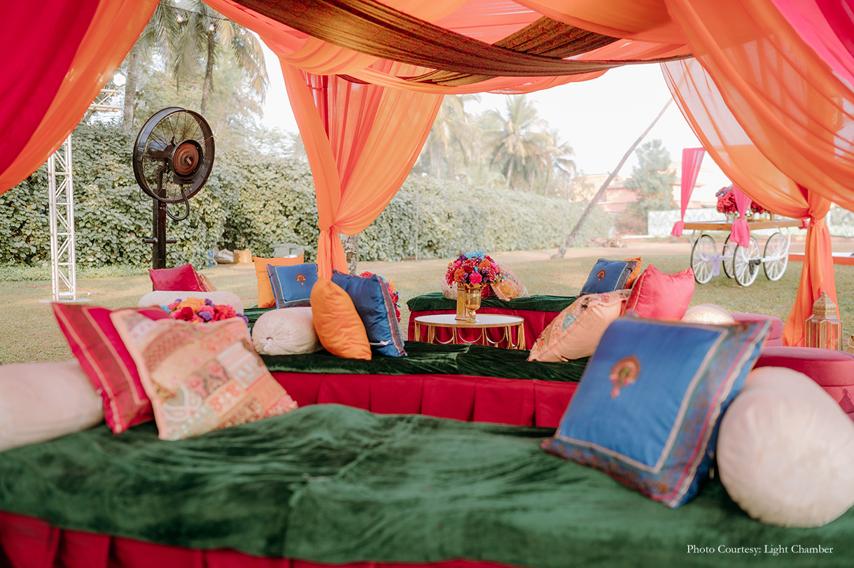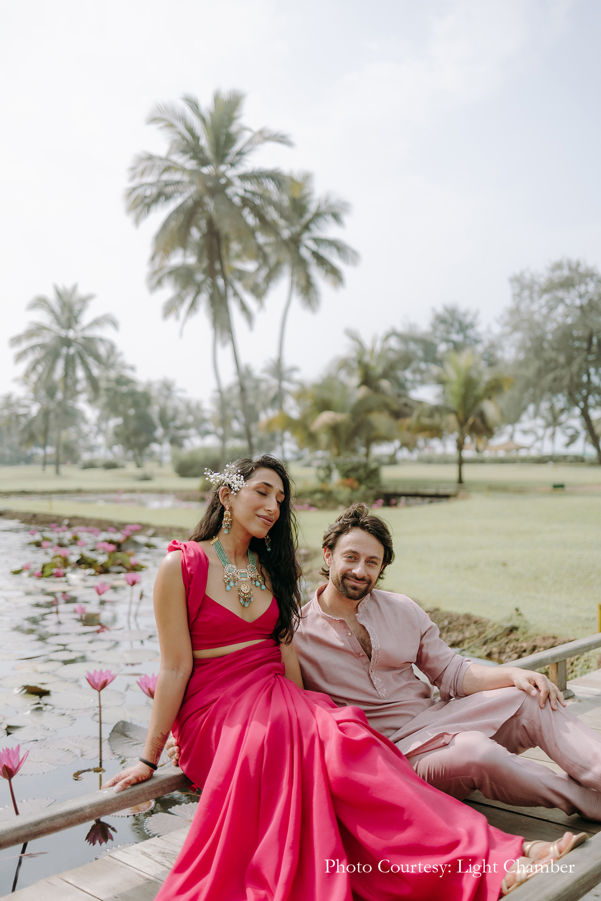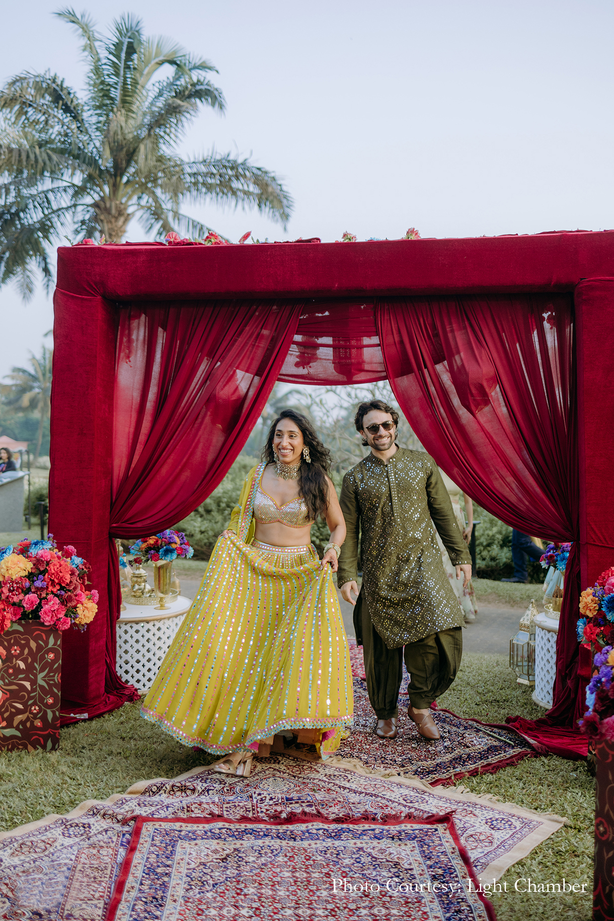 While they were first considering Delhi-based wedding planners, they decided instead to go with Goa-based VLW Global for a better understanding of local vendors and logistical concerns, as well as better availability on the ground to tackle any issues. Apart from two trips over their 1.5 years of planning, the bride coordinated all aspects of planning over Zoom, trusting the team to understand and execute their vision to perfection. The couple chose local DJs and entertainers for their events and opted for locally grown flowers to make the most of what was available in the region.