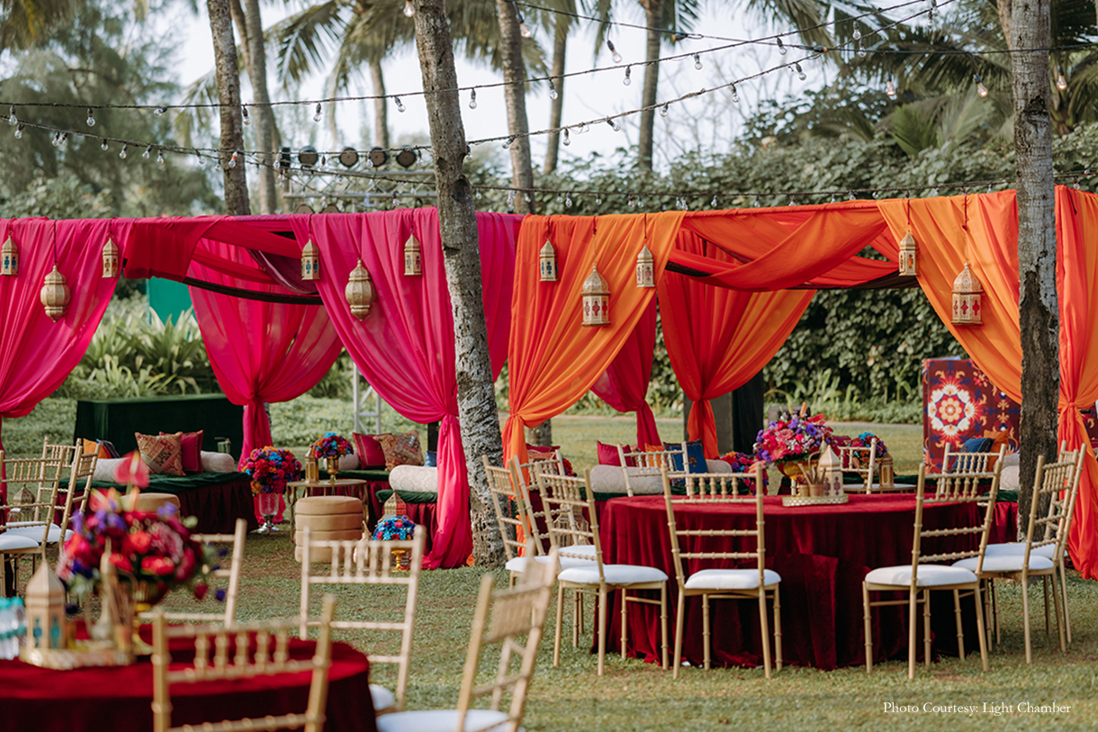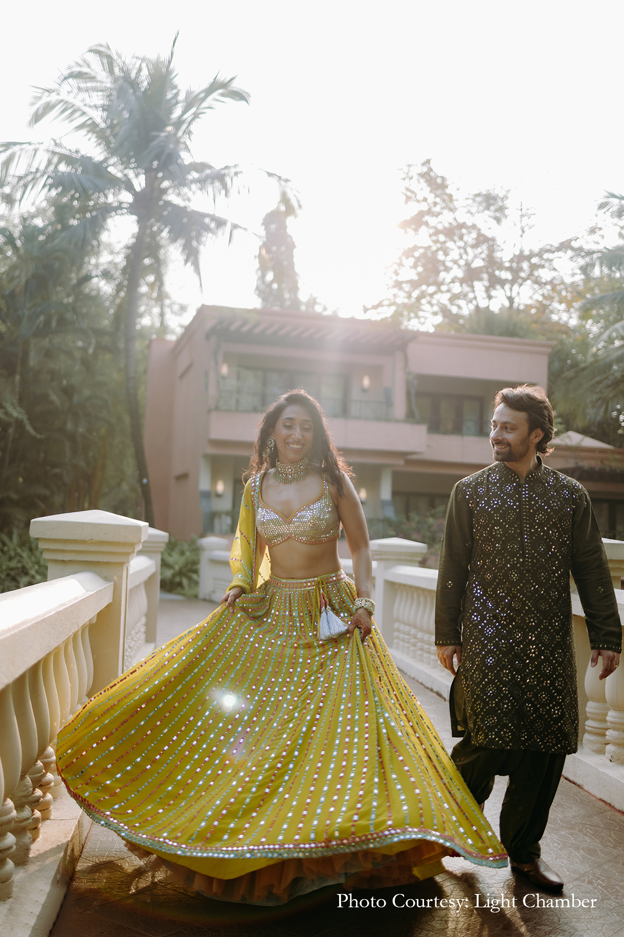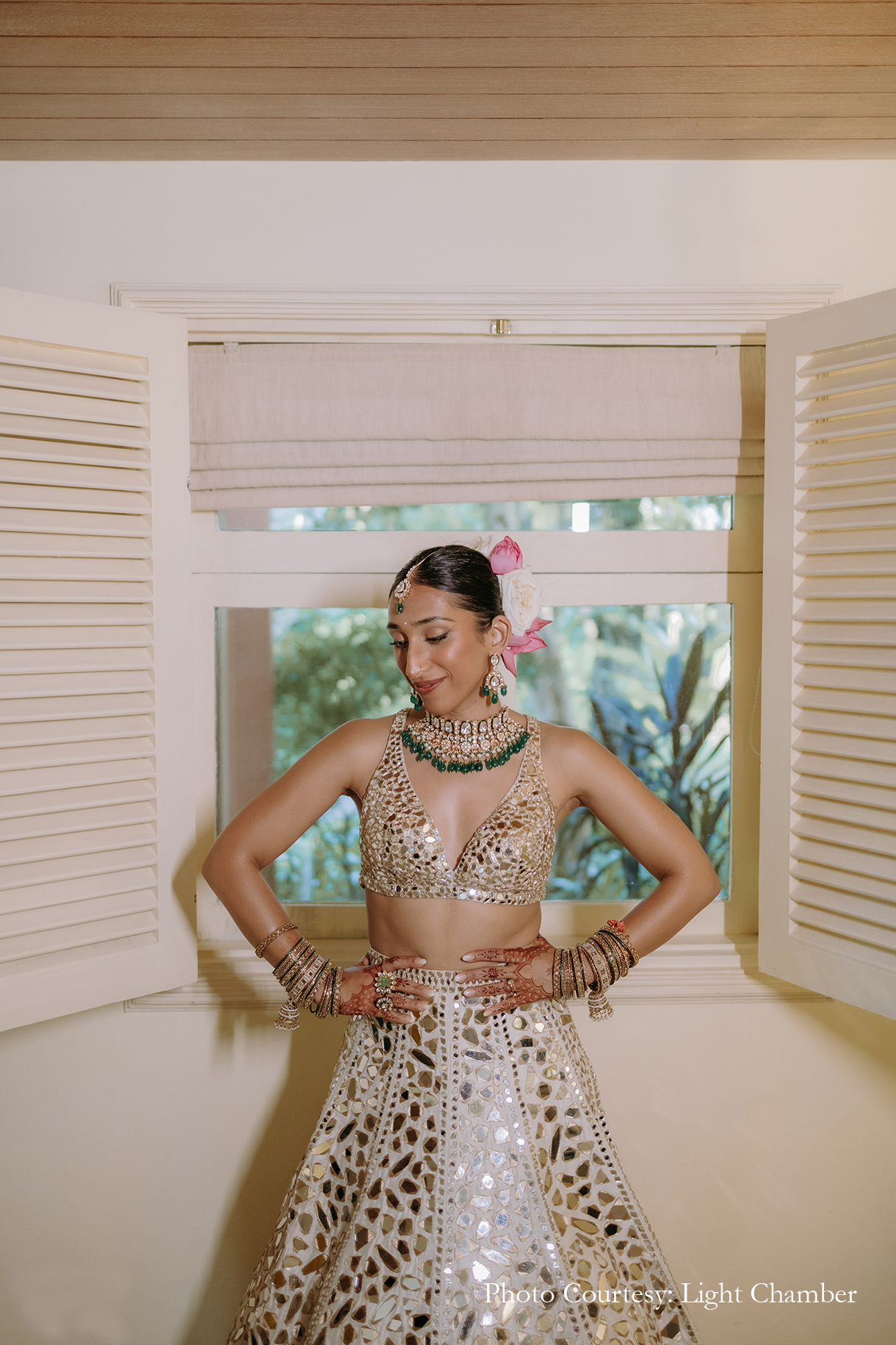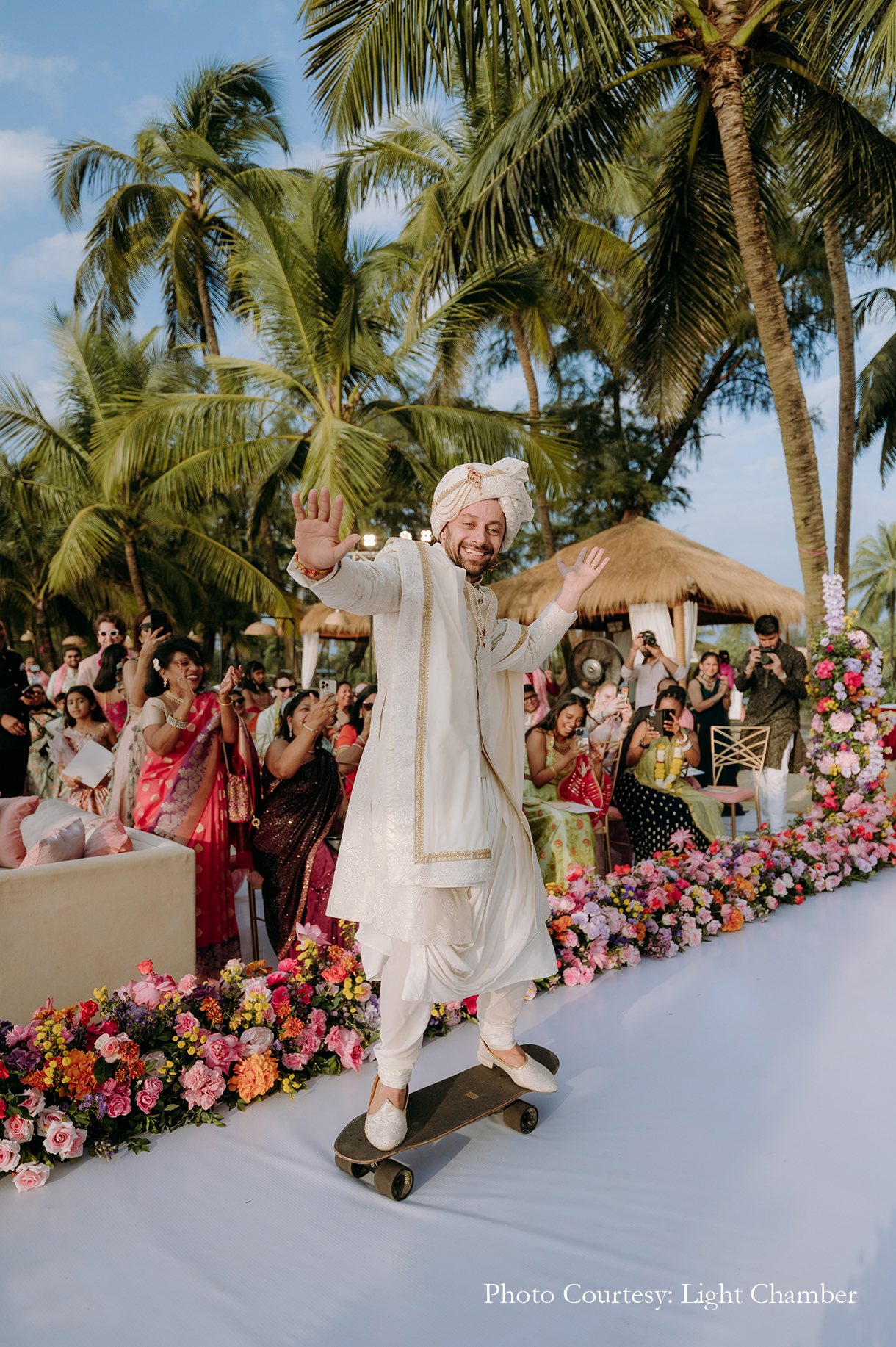 While they were first considering Delhi-based wedding planners, they decided instead to go with Goa-based VLW Global for a better understanding of local vendors and logistical concerns, as well as better availability on the ground to tackle any issues. Apart from two trips over their 1.5 years of planning, the bride coordinated all aspects of planning over Zoom, trusting the team to understand and execute their vision to perfection. The couple chose local DJs and entertainers for their events and opted for locally grown flowers to make the most of what was available in the region.