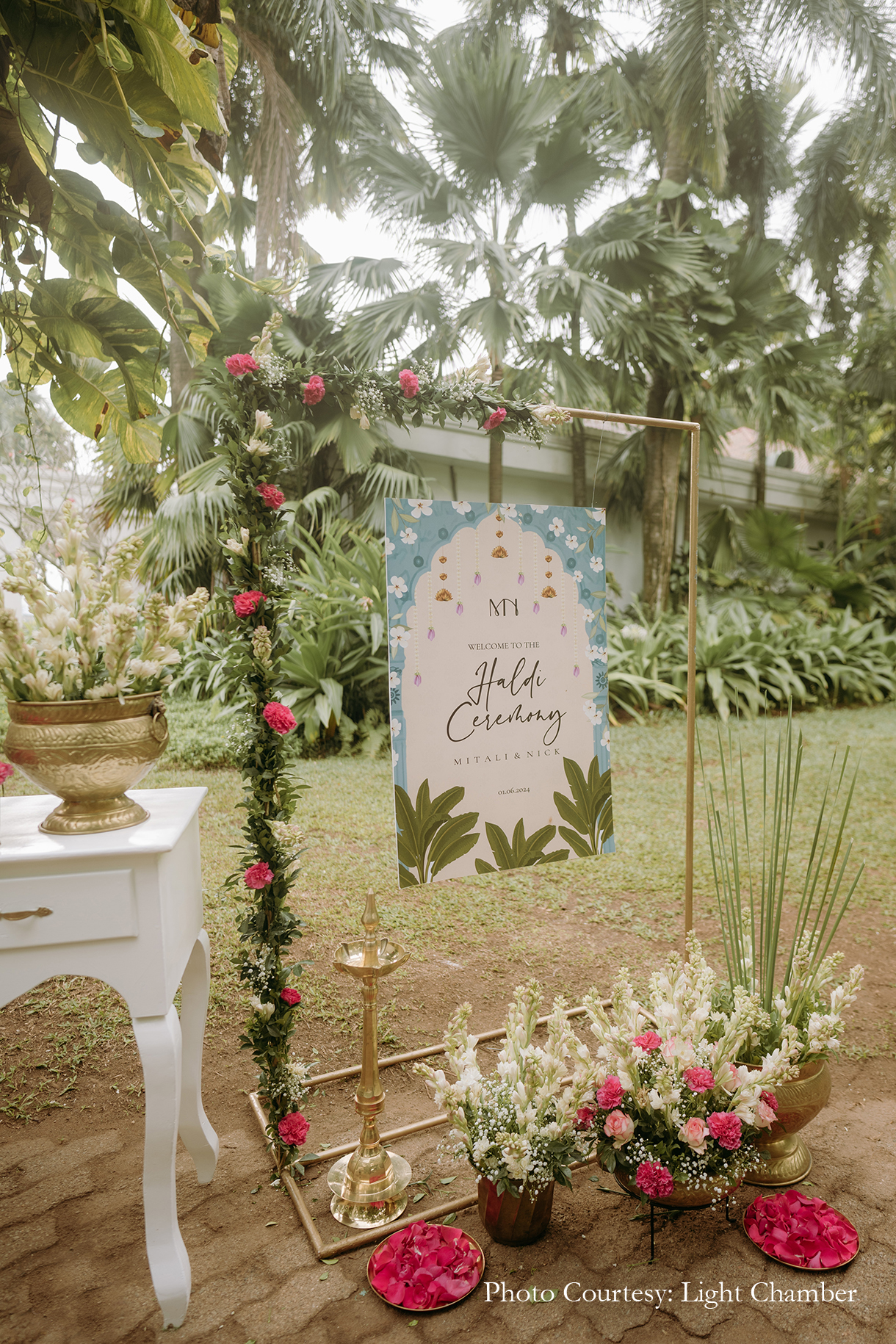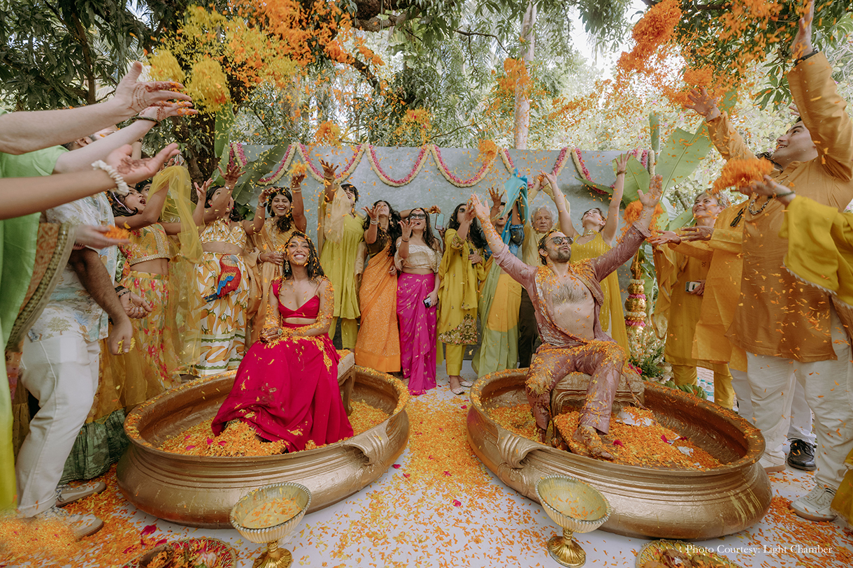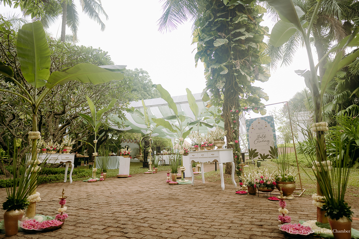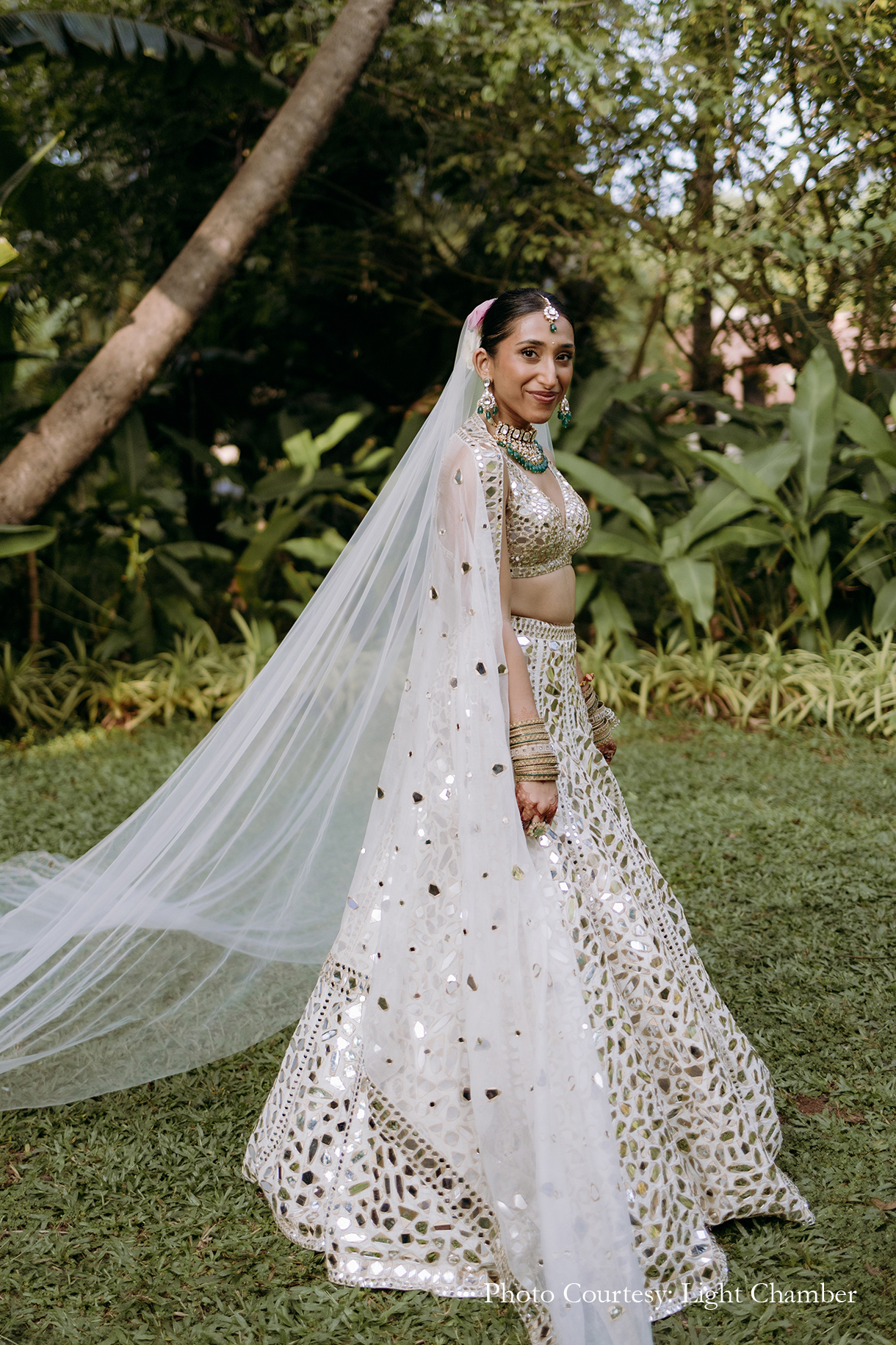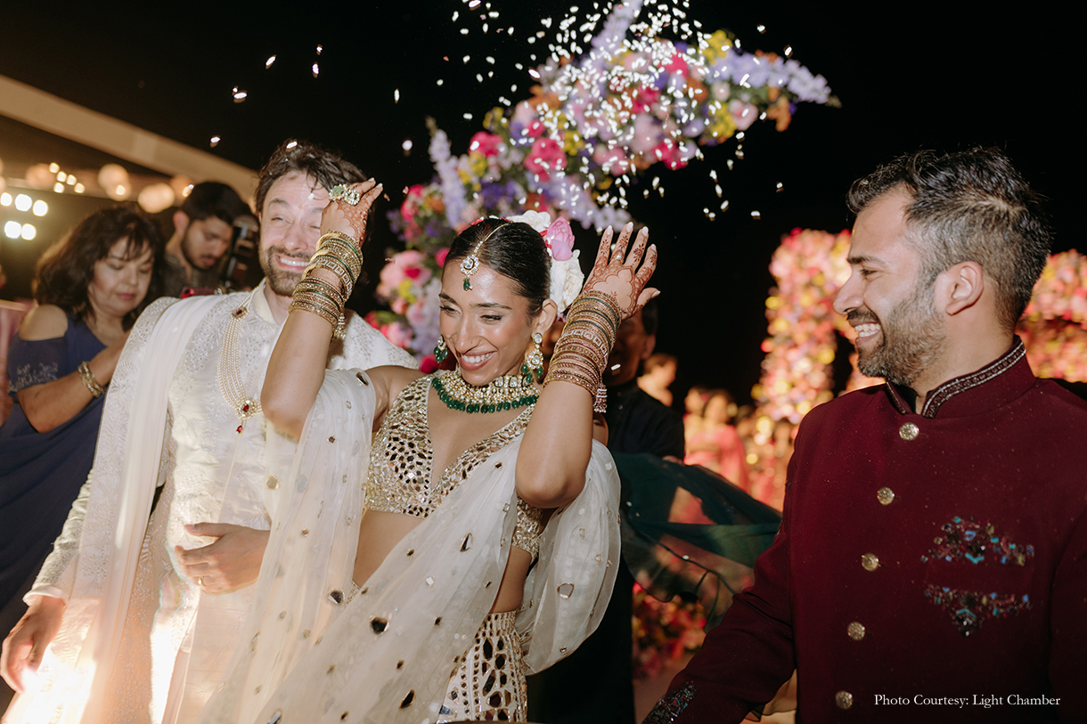While they were first considering Delhi-based wedding planners, they decided instead to go with Goa-based VLW Global for a better understanding of local vendors and logistical concerns, as well as better availability on the ground to tackle any issues. Apart from two trips over their 1.5 years of planning, the bride coordinated all aspects of planning over Zoom, trusting the team to understand and execute their vision to perfection. The couple chose local DJs and entertainers for their events and opted for locally grown flowers to make the most of what was available in the region.