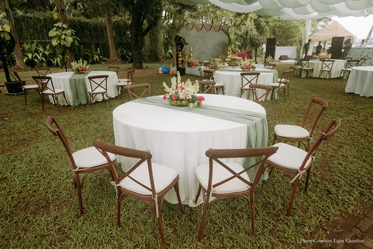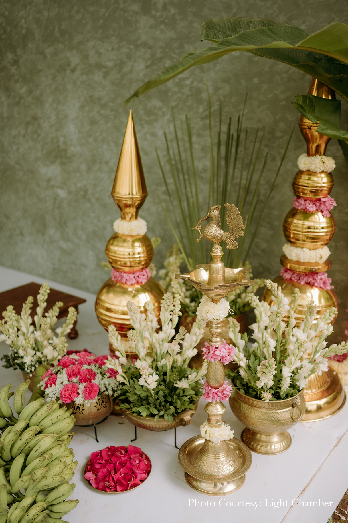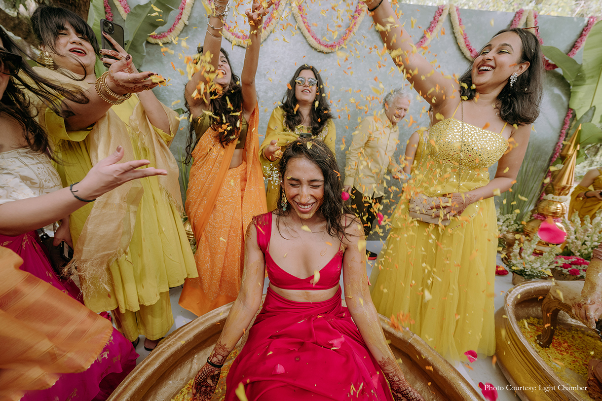 The next day dawned with a serene yet fun-filled Haldi ceremony. Swapping out the usual yellow hues and marigolds for a dainty white and green color palette, the occasion saw the decor of soft drapes, banana trees, rajnigandha flowers, roses, and lotus blooms. A nostalgia corner, with fruits and candies, was a big hit among the guests. The couple looked radiant in pink as they came dancing in with their friends, and the ceremony was filled with love and laughter as they all smeared the couple with turmeric.