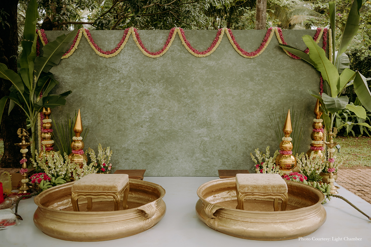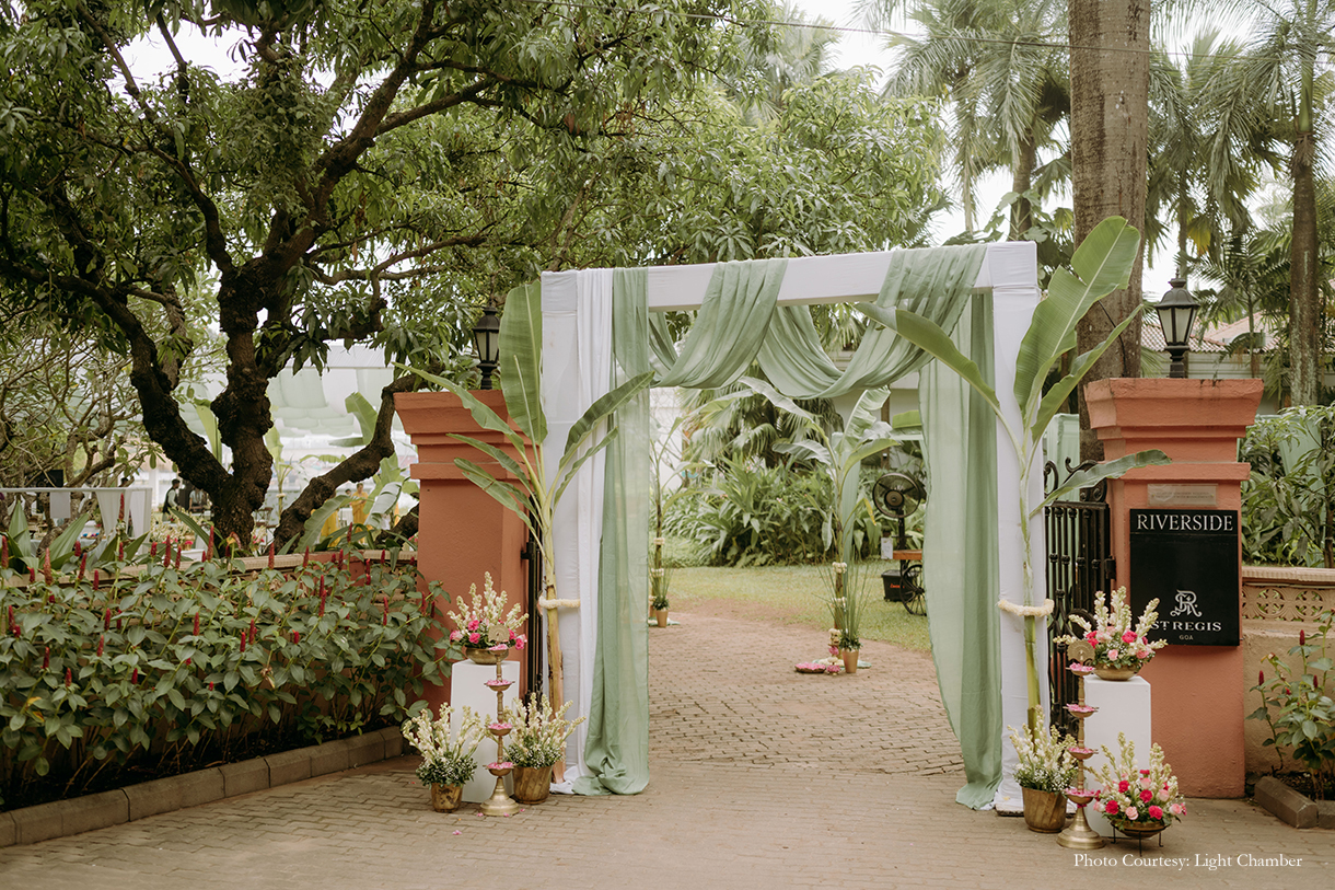 The couple ultimately zeroed in on The St. Regis Goa Resort for a number of reasons. Right next to the beach, it allowed them to host events right on the sand, while the architecture and landscaping, with its traditional Indian charm and lotuses everywhere, offered an ambiance of warmth and luxury. Finally, its location in South Goa offered them seclusion and privacy, ideal for their intimate gathering.