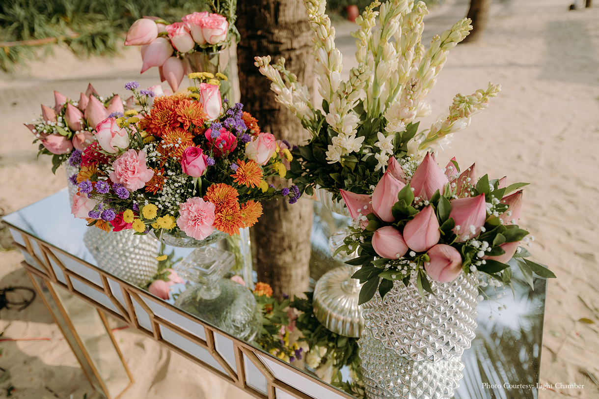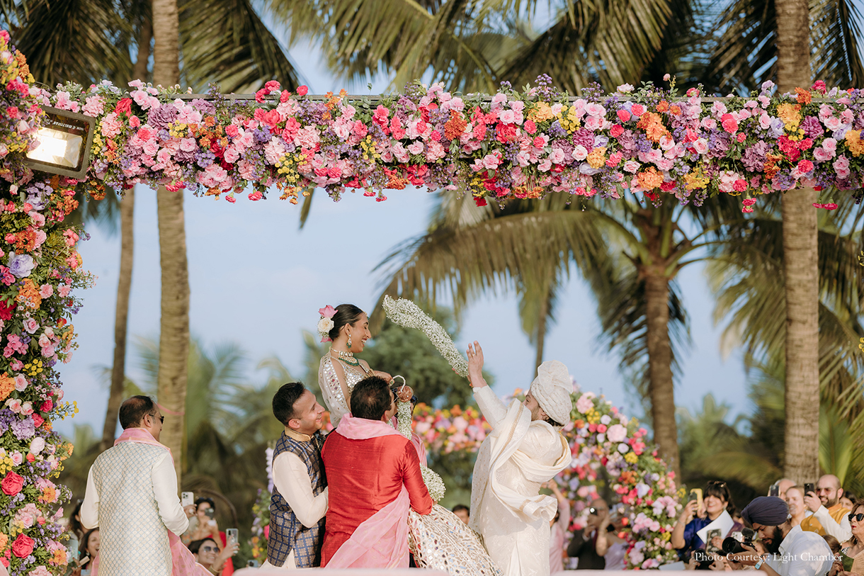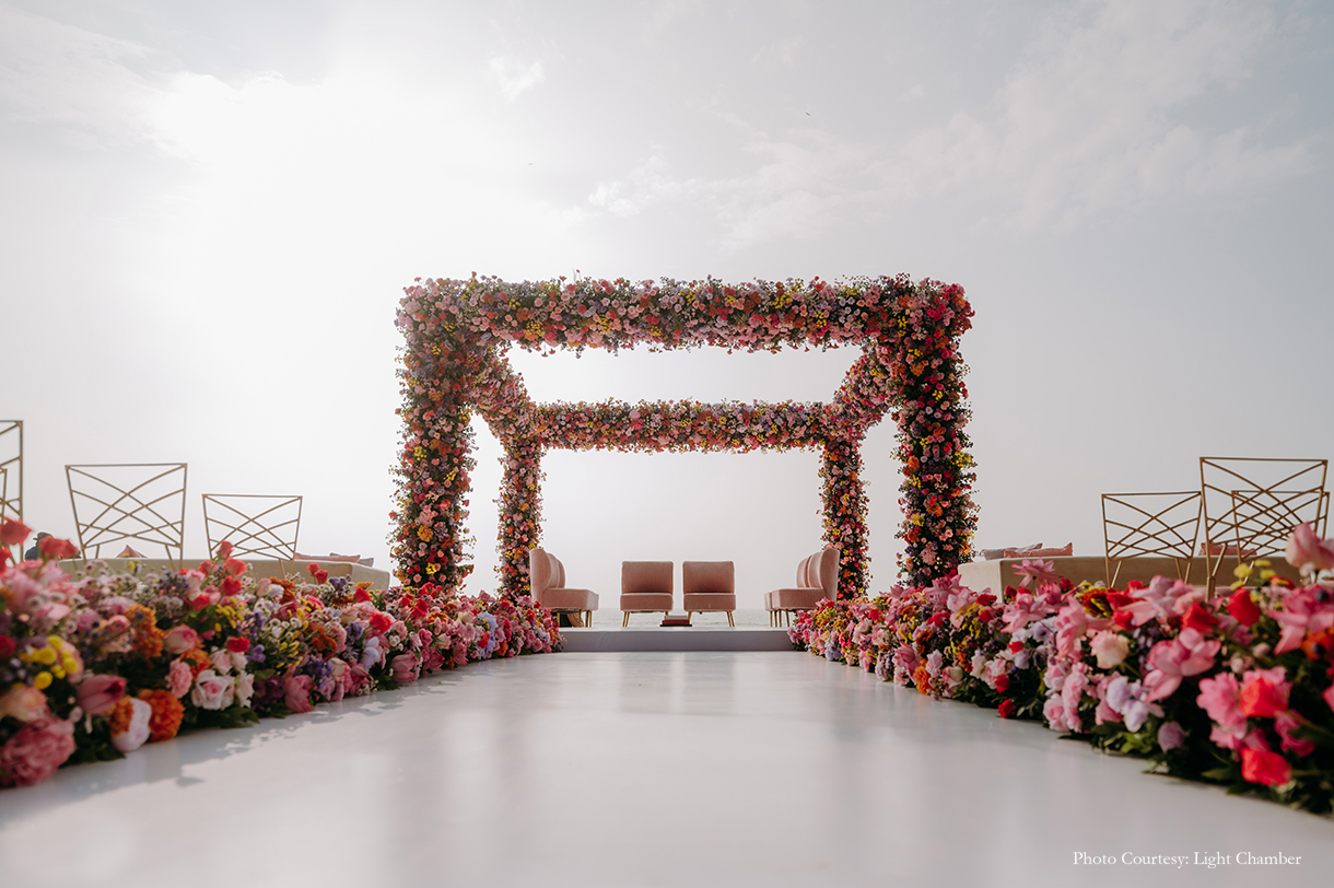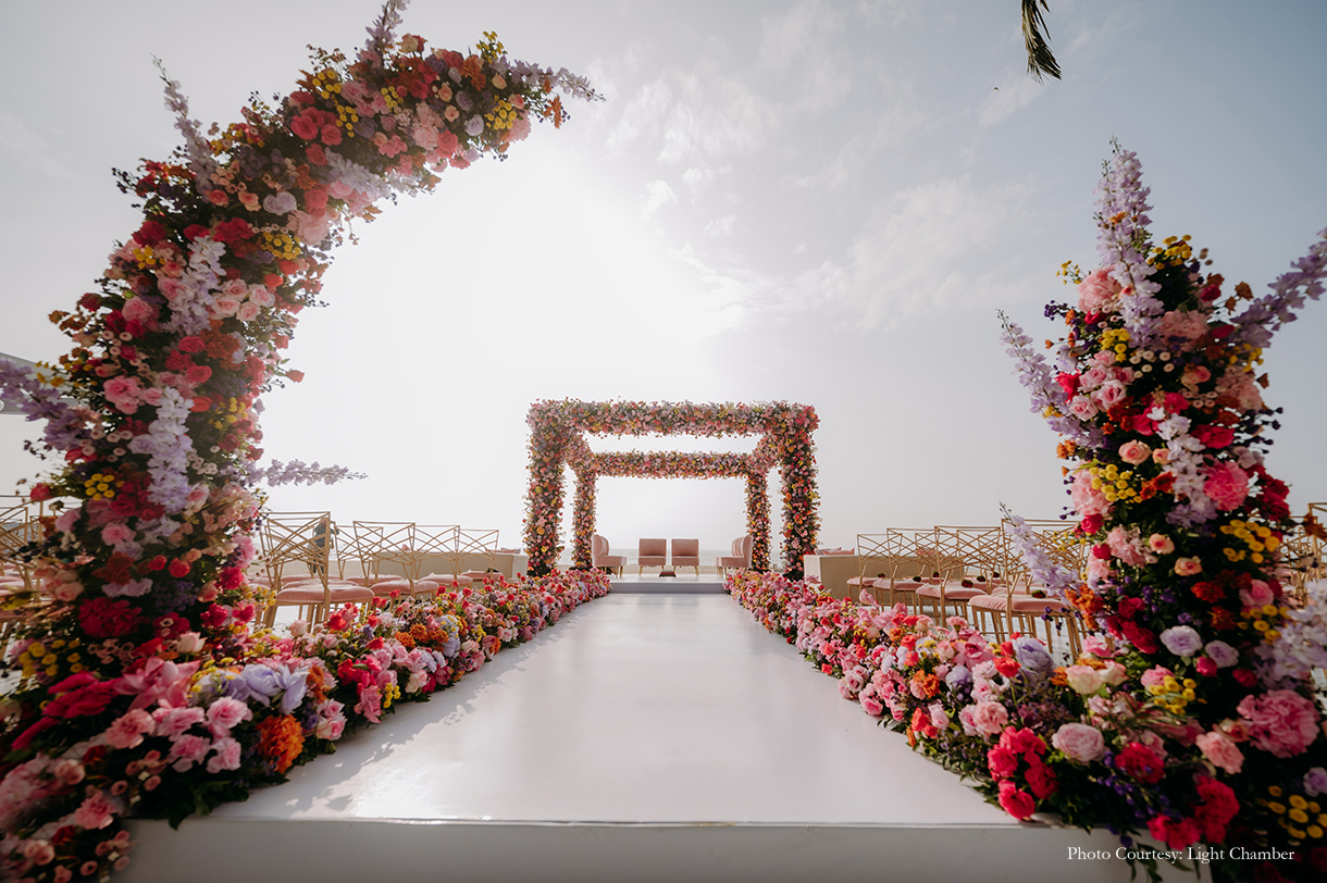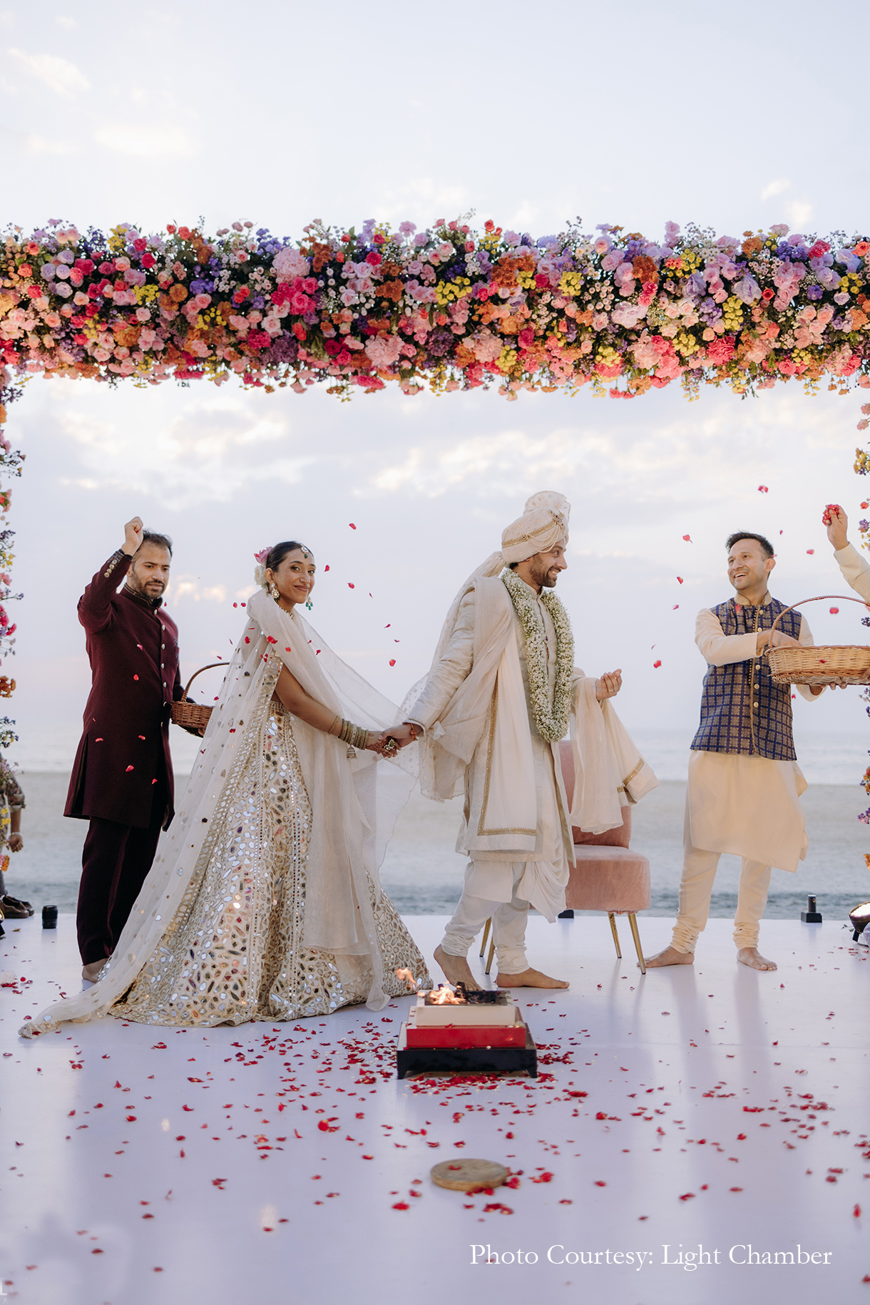 Their two days of celebrations culminated in a stunning sunset wedding ceremony by the beach. Soft pastels set a romantic tone, while a vivid floral aisle and mandap looked spectacular against the backdrop of the sea.