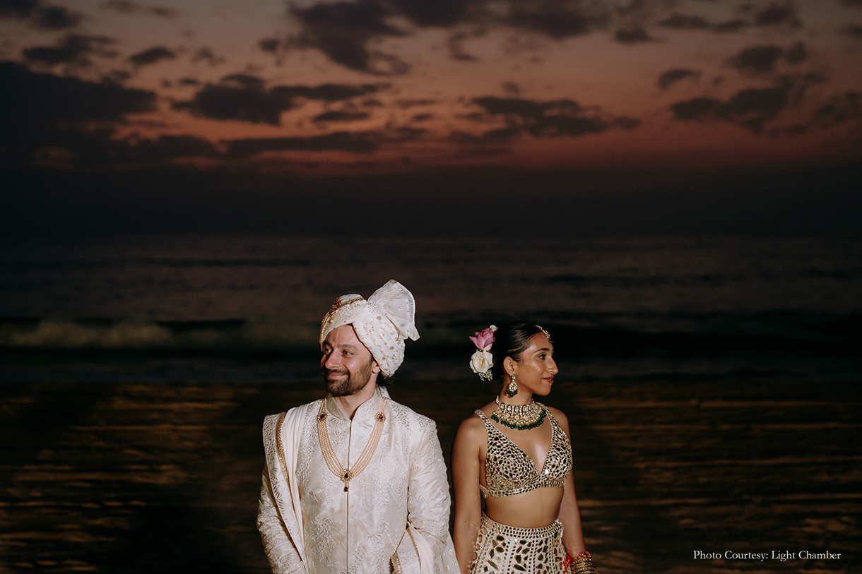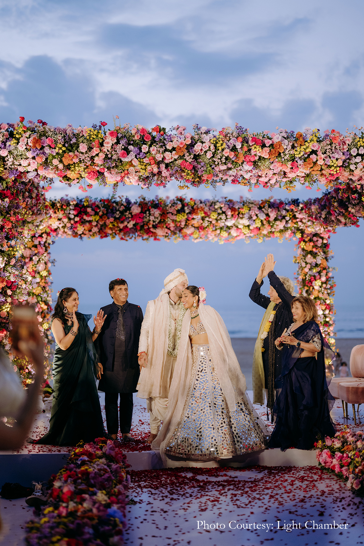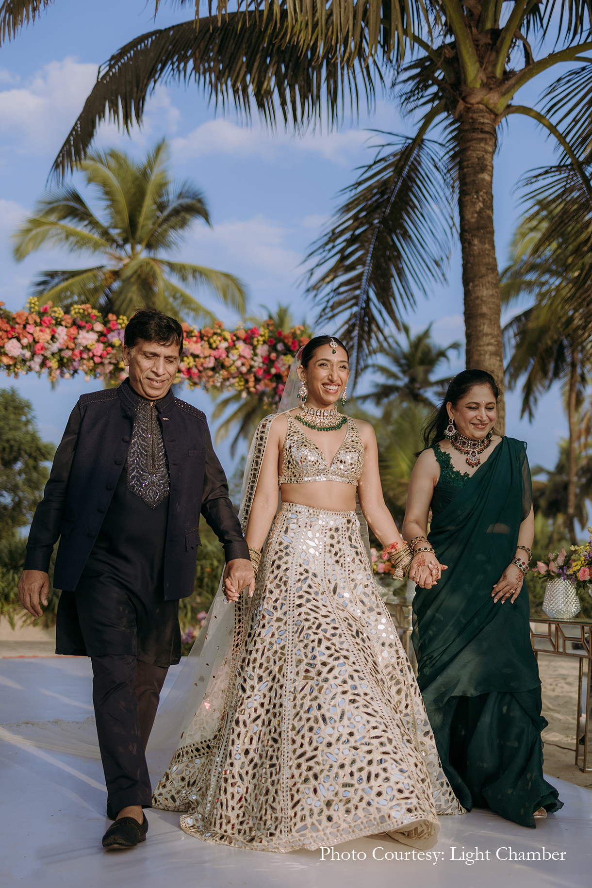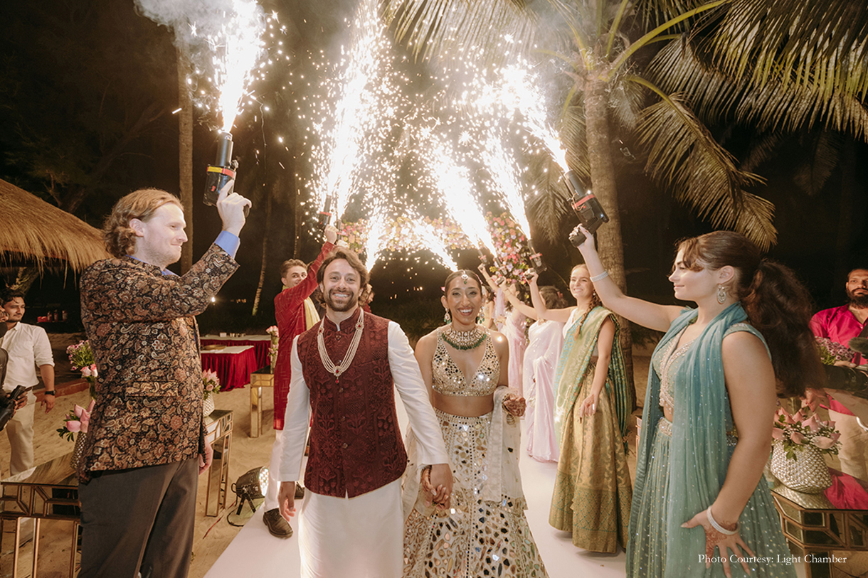 Their two days of celebrations culminated in a stunning sunset wedding ceremony by the beach. Soft pastels set a romantic tone, while a vivid floral aisle and mandap looked spectacular against the backdrop of the sea.