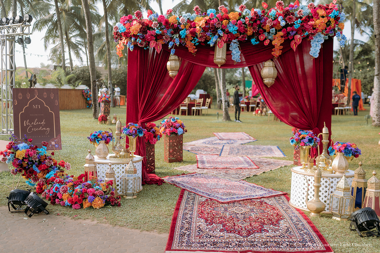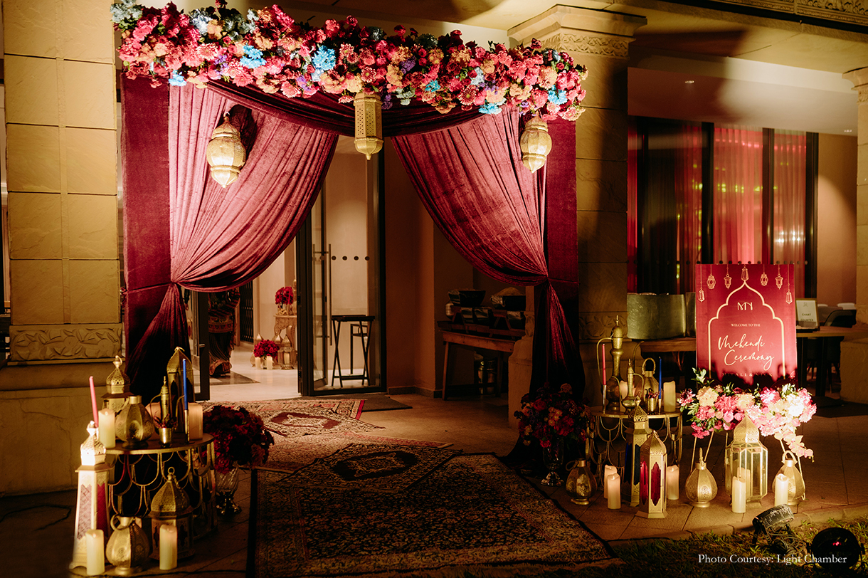After a warm welcome, the festivities commenced with a lively Mehndi ceremony on the lawns. Drapes and linen in bright jewel tones, vividly colored flowers, ornate Moroccan lamps, and more set the ambiance for the occasion, complete with trays of spices and favor carts. The guests had a gala time mingling and getting their hands painted with henna. As the evening progressed, the revelries shifted inside for cocktails, music, and dancing as the couple let loose and enjoyed with their loved ones.