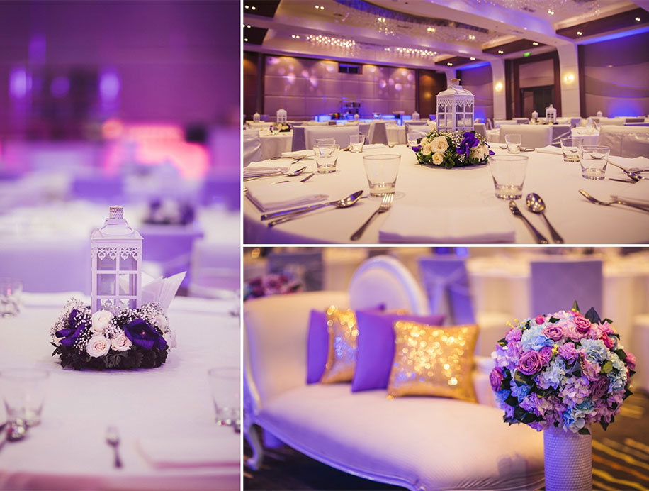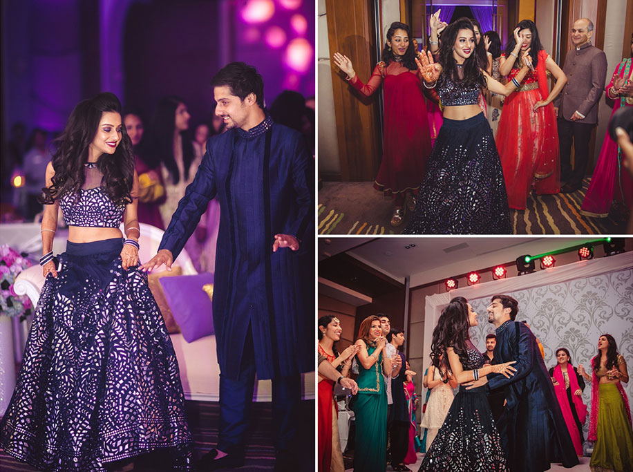 “For the sangeet, we decided on an Indo-Western fusion theme when it came to the music, decor and even the dress code. We even had a curtain made of crystals at the entrance and arranged for a royal purple and ivory theme inside to give it a club-like environment. Our friends and family surprised us with special dance performances and skits which were very touching. I wore a shimmery midnight blue lehenga gown with silver shimmer and ‘tikli’ (round motifs, beads or sequins) work that perfectly suited the glitzy evening.”