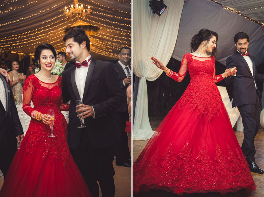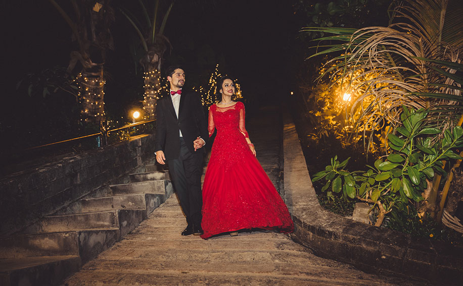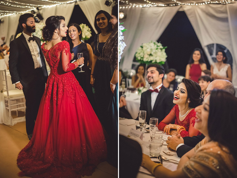 Our reception theme had a retro charm to it. As we walked down to the beach which was lit with fairy lights strung up on trees on both sides of the walking trail. We had a beautiful marquee set up on the beach with a floral archway and a sign that read ‘Happily ever after starts here.’ I wanted to recreate old Hollywood vintage glamor, and the red ballroom lace gown paired with the delicate diamond necklace was an apt choice for it. The rustic décor of ivory with the soft yellow glow of candles and chandeliers was the perfect setting for some fun and moving speeches by my family and friends.”