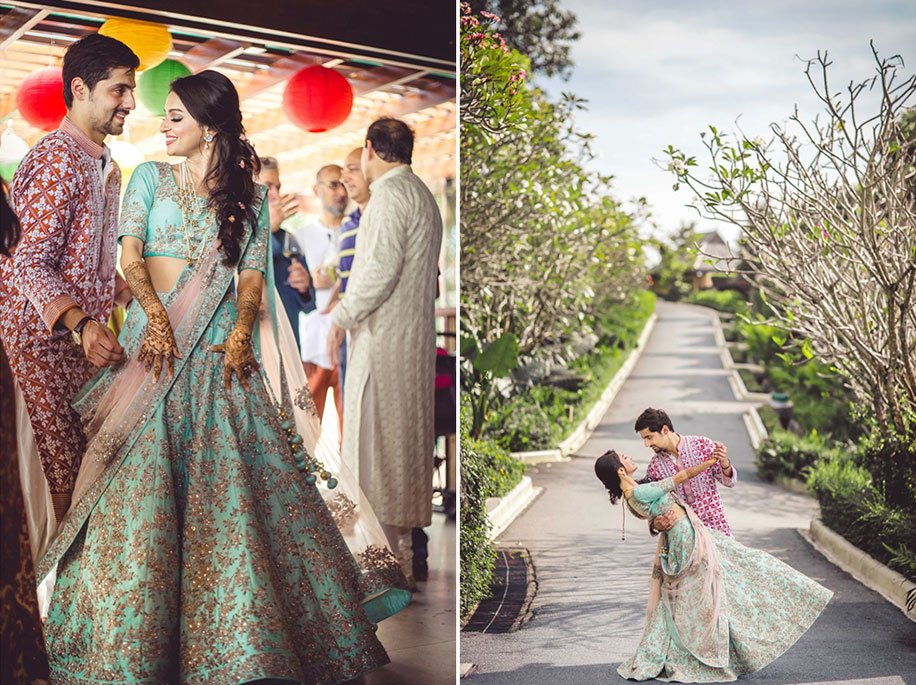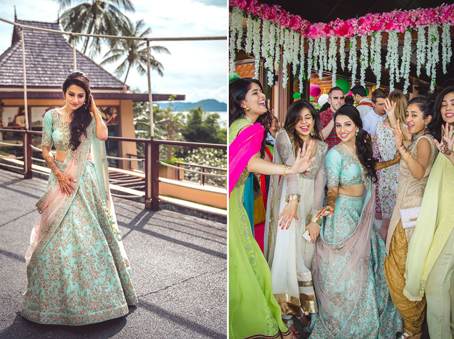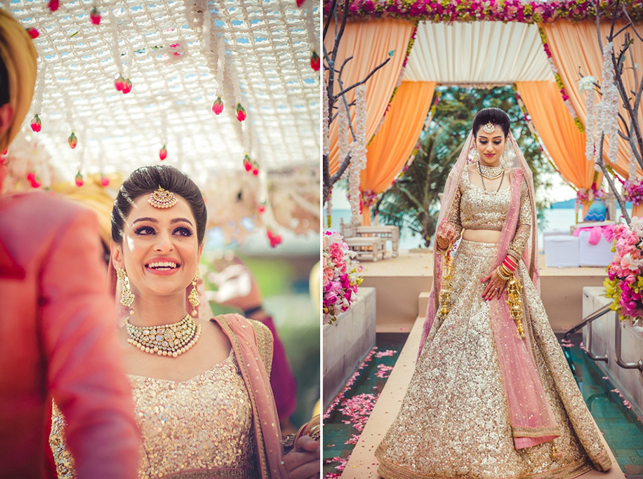 “Our mandap overlooked the scenic ocean and was erected on top of an infinity pool which gave it an impression of a floating glow bulb! We decorated it with coral and pink hues which perfectly complemented my heavily embellished gold lehenga and the gorgeous Bhuramal Rajmal Surana & Sons jewellery. While Pranav made his entry on an elephant in true blue Thai-style, my family followed Indian traditions for the bridal entry where I walked down the aisle with my father as my brothers held the ‘phoolon ki chaadar’ (floral sheet) above me.”