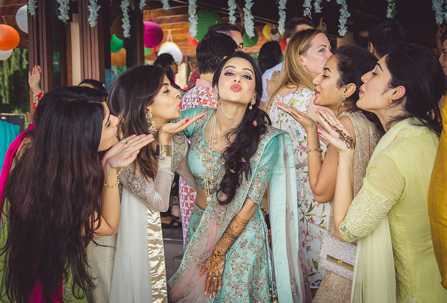 “Pranav and I wanted a traditional mehndi function with a bit of a casual vibe. We had ‘dhol’ (drum) players and mehndi arists at the event to add a bit of fun and excitement to the function. For the décor, we decided on a vibrant ethnic floral theme with a fully decorated entrance, bridal ‘jhoola’ (swing) and eclectic center stage arrangements. We even had a fun bar which served unlimited spiked coconut water and mango mojitos to keep spirits high! Since it was an outdoor function, I wanted to be comfortable yet stylish, so opted for a beautiful light blue lehenga with intricate zardozi work that went well with the pastel decor.”