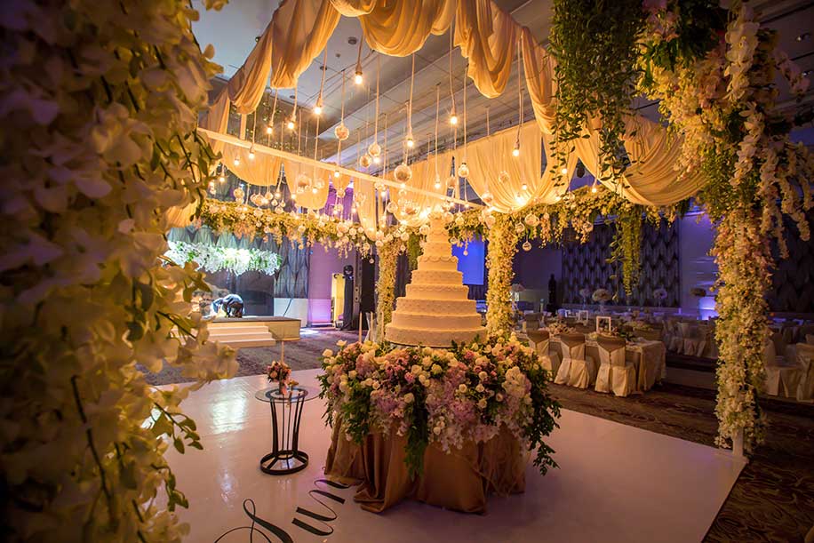 The reception was hosted at The Siam Kempinski Hotel, Bangkok. The theme was ‘Love Deluxe’ and I have to say the décor was a dream come true. It made my jaw drop. I’d always wanted to get married in a beautiful garden surrounded by flowers, trees, nature… we sat down with the wedding planner and I got everything I asked for and more! There was a waterfall, golden trees, flowers everywhere. You must see it to believe it!