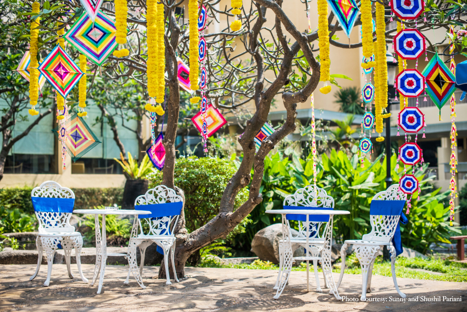 The celebrations were kickstarted with some color – the color of mehndi. After the guests had all rolled in and refreshed themselves, they made their way down to a casual party in the garden which is dotted with goldfish ponds. The décor, traditional marigolds and dozens of bright paper kites, was celebratory and very desi. And to add to the flavor, the bar was done up like a truck, dishing out ice-cold beer as people grooved to the music.