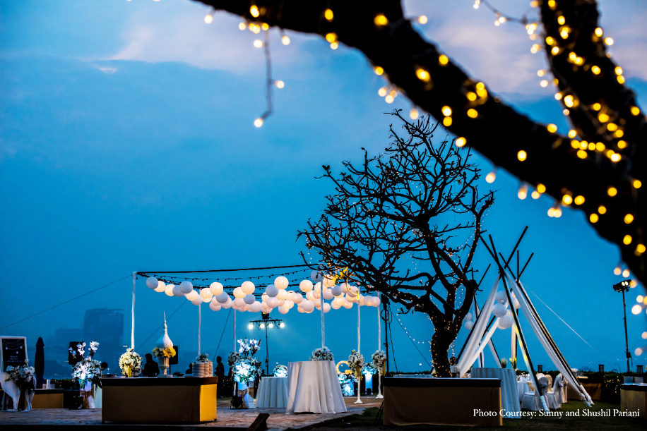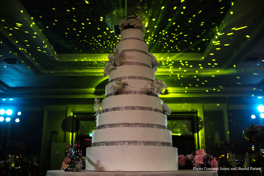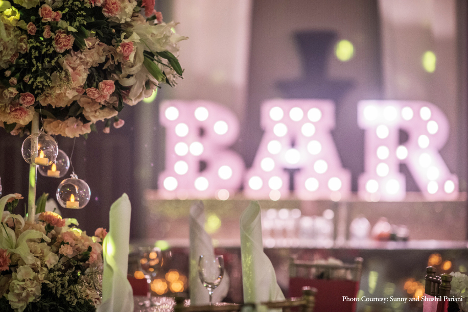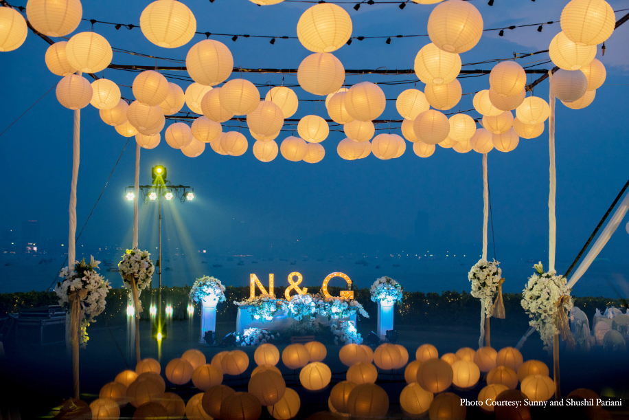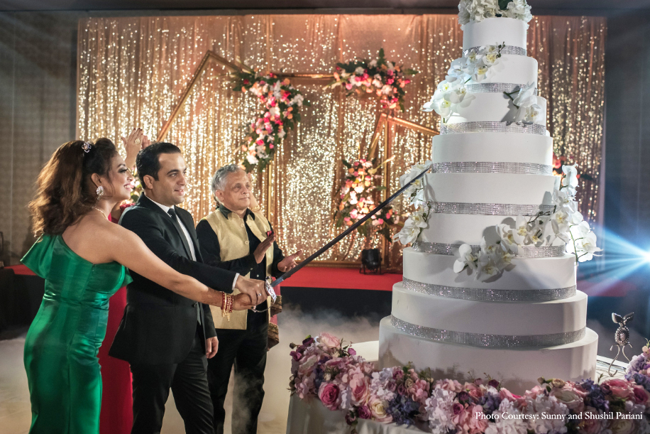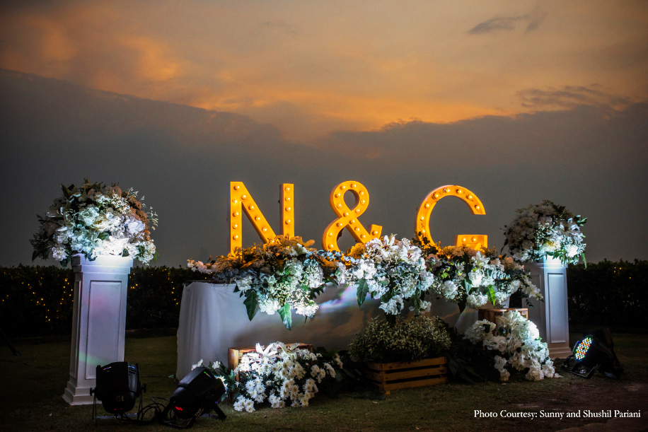 After the wedding, a formal champagne reception was organized at a venue called ‘The view’ known for its sunsets. Neha Mehrotra says, “We had a brilliant saxophonist who played while we toasted each other with wonderful cocktails made by the famous bartenders – The Flaming Trios.” The party moved indoors for the Sangeet where the ballroom was beautifully decorated with oversized centerpieces of flowers and glass orbs. The couple’s friends and family performed to rocking numbers while a cake was cut and champagne popped again.