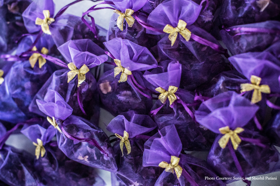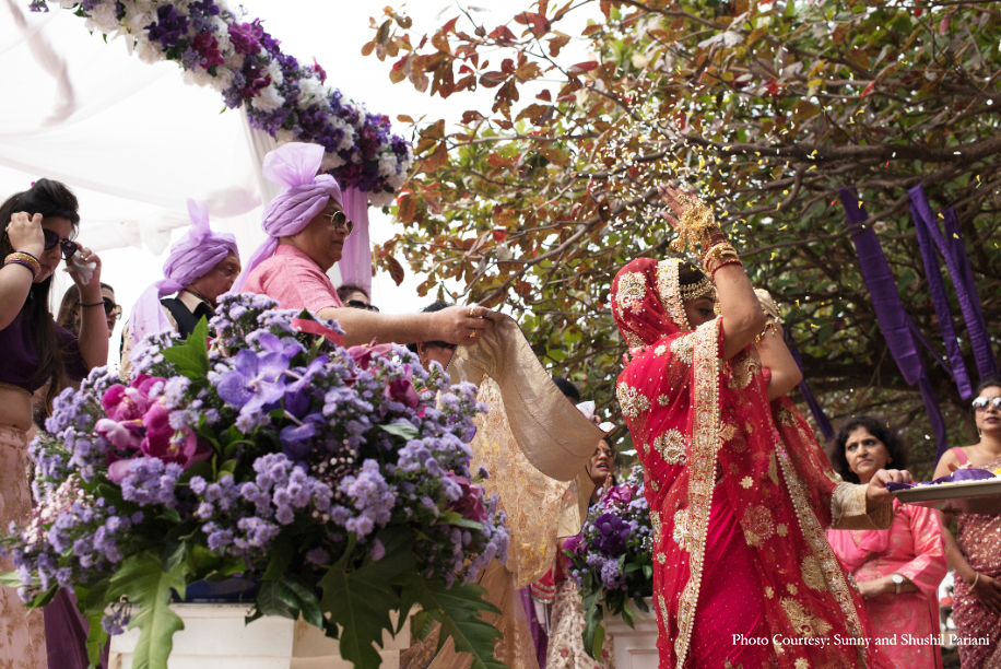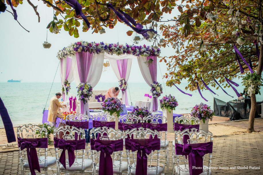 Early the next morning, a tiny haldi ceremony was observed for both bride and groom before the baraat started at midday with dhol wallas. The wedding was organized right by the sea on the beach and it was a very romantic setup themed ‘Lavender’. Small pouches in lavender were given to all the guests, filled with mixed nuts. The setting was breathtaking as they exchanged their vows outdoors in the mandap that was created using lavender and white drapes and floral arrangements.